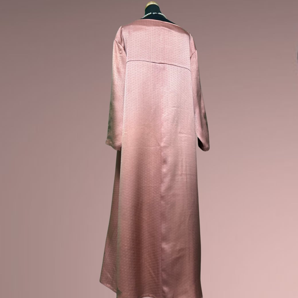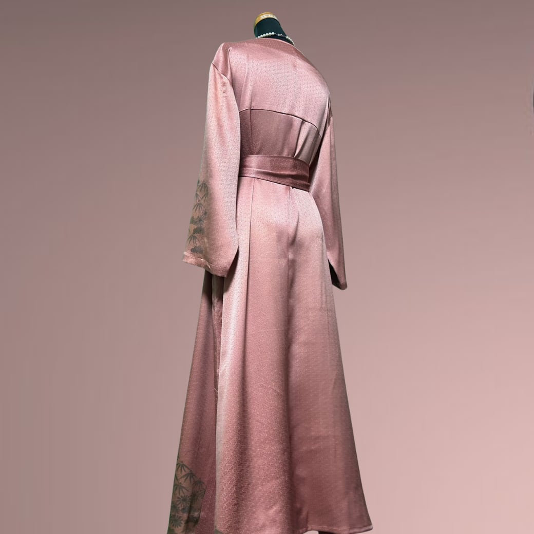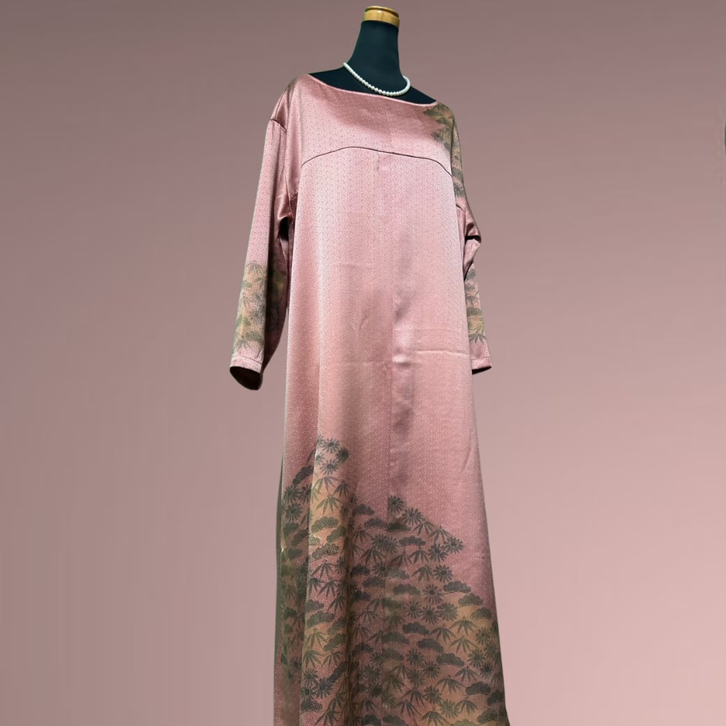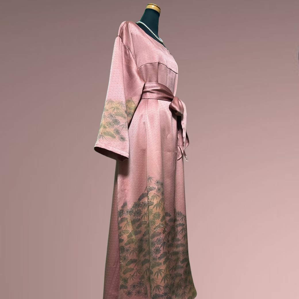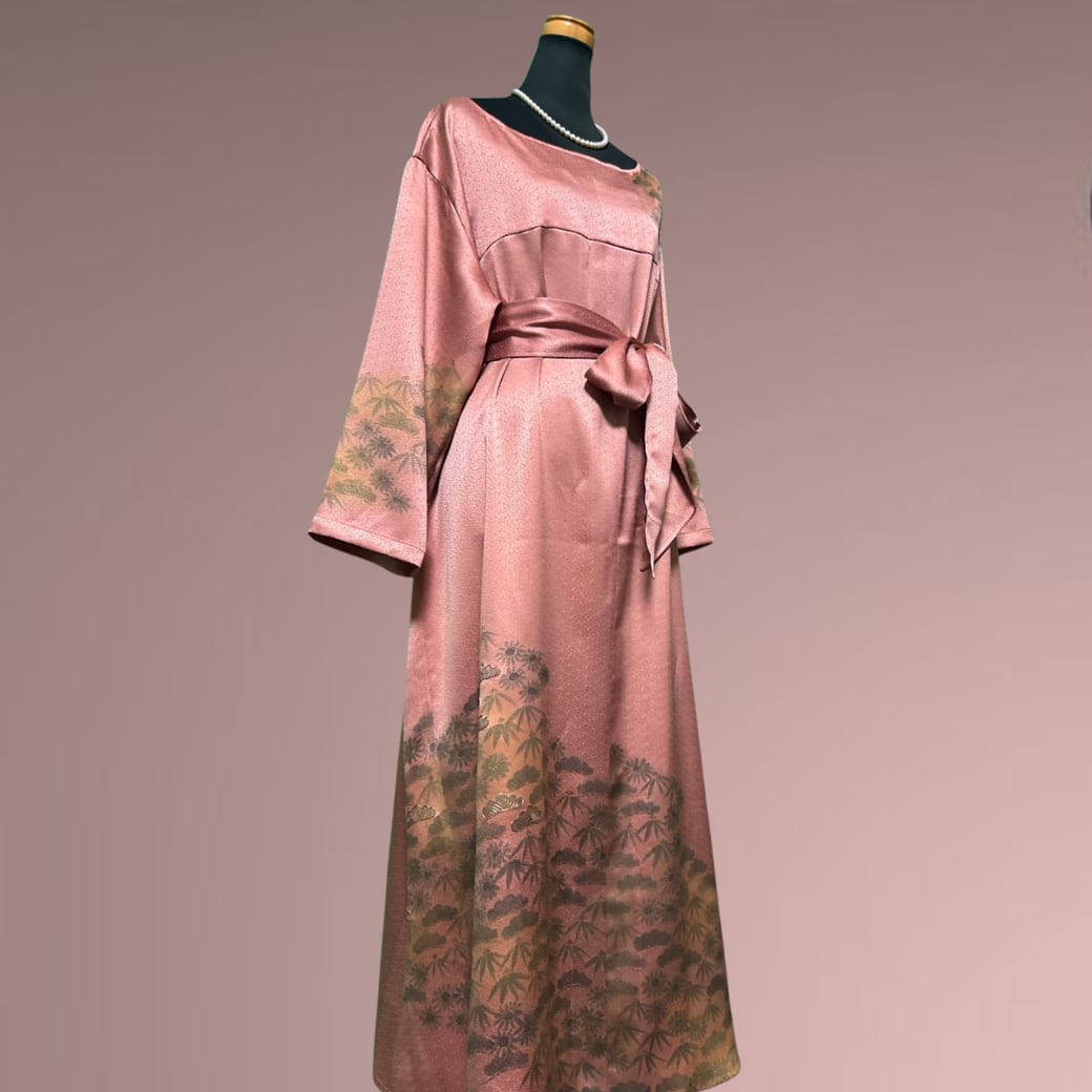 こちらの着物ワンピースは、やわらかな桜色を基調とした訪問着から仕立てた一着です。