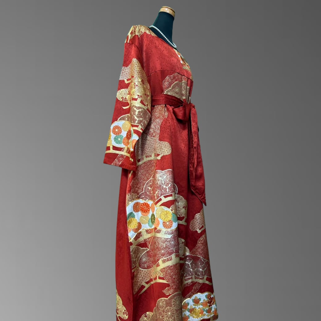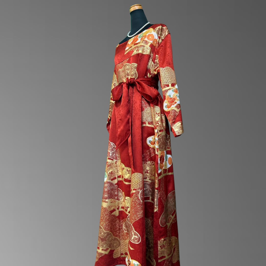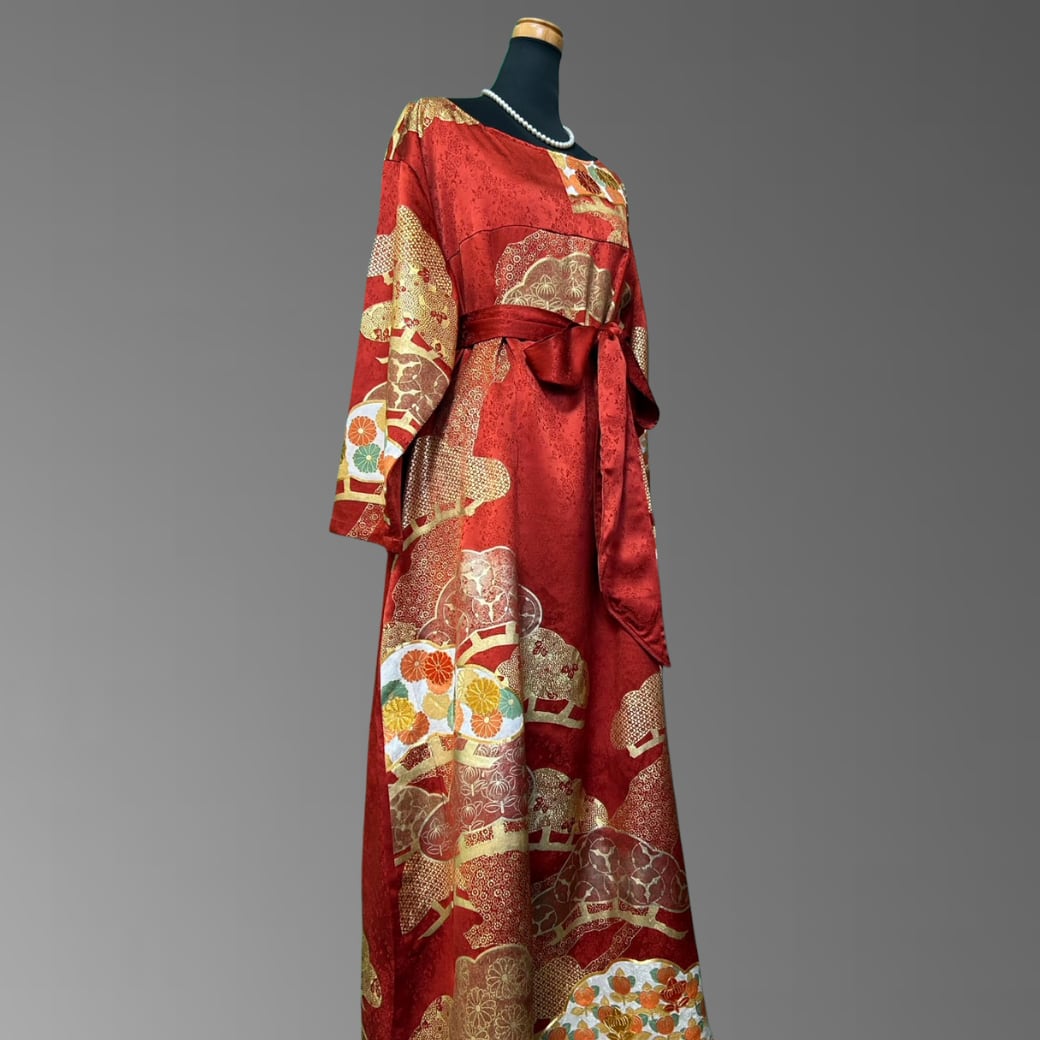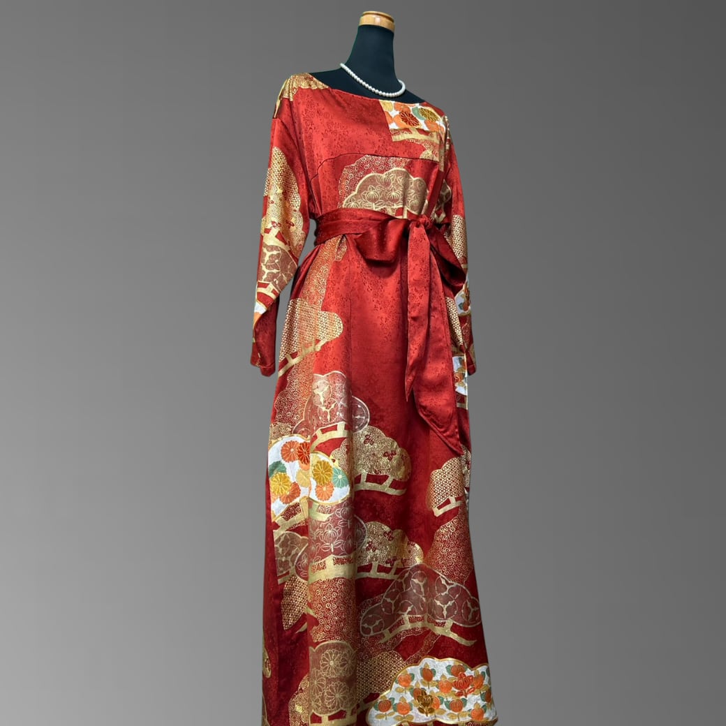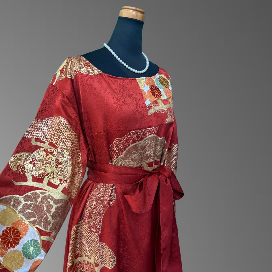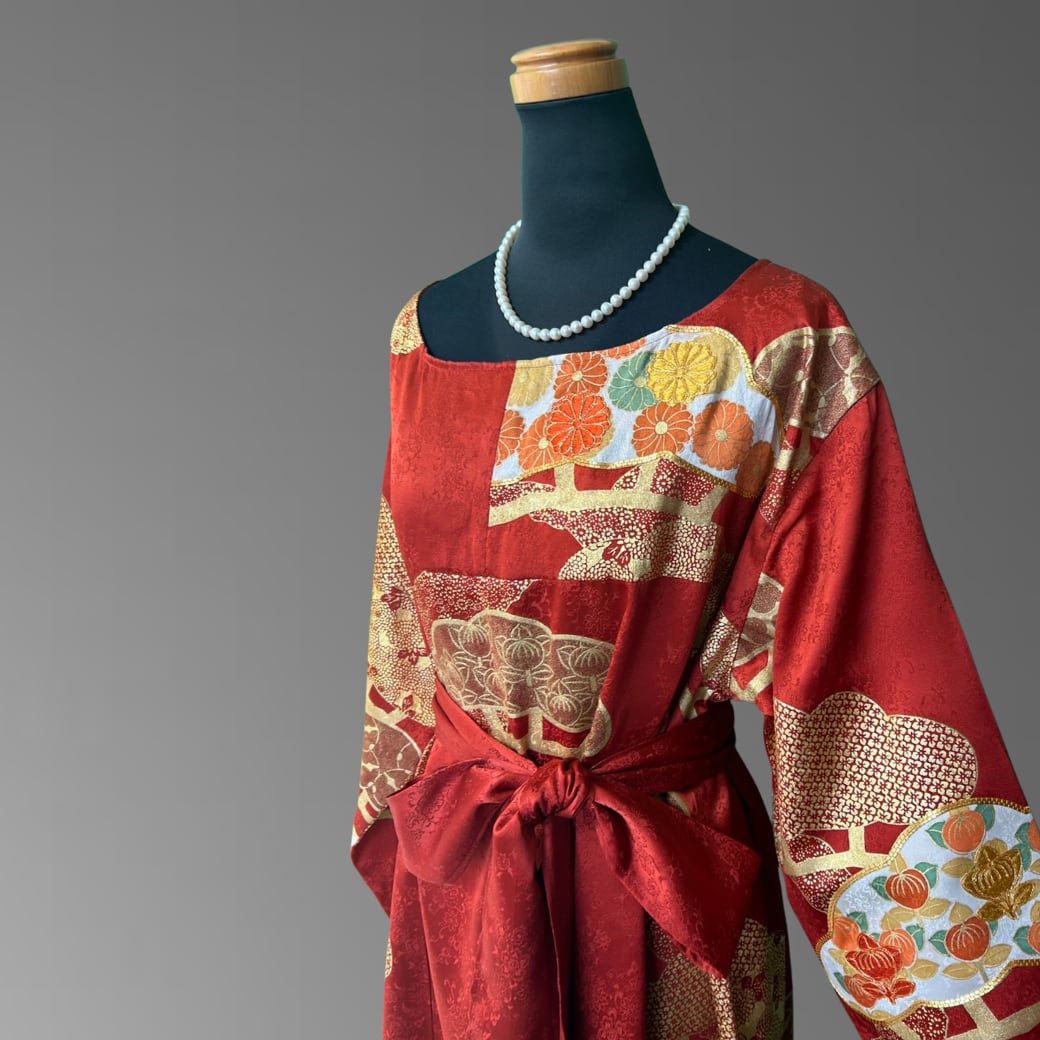 こちらの着物ワンピースは、華やかな赤地に金彩を重ねた振袖をもとに仕立てた一着です。