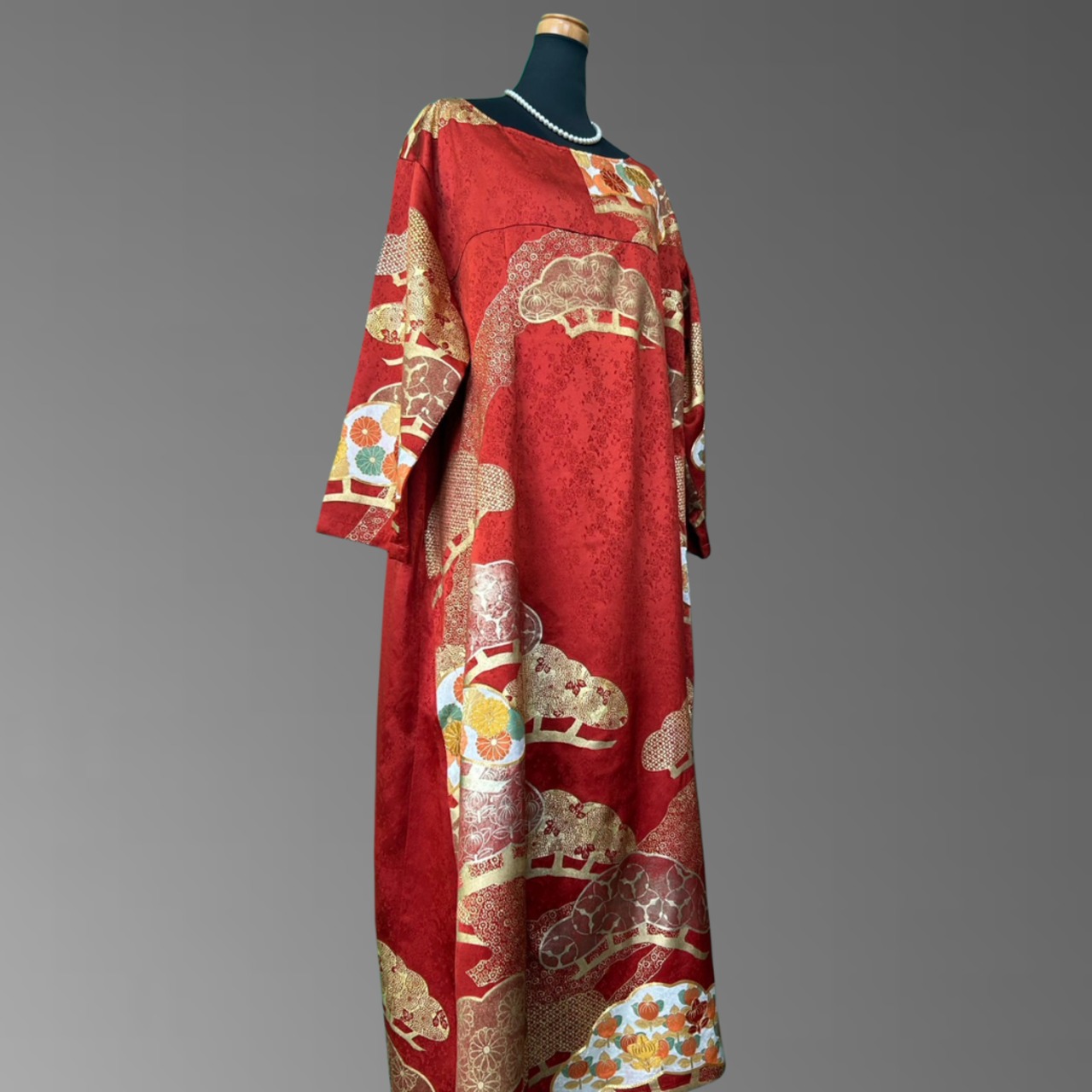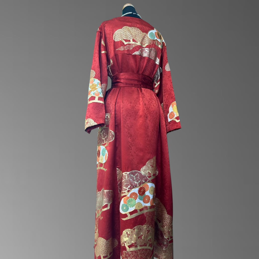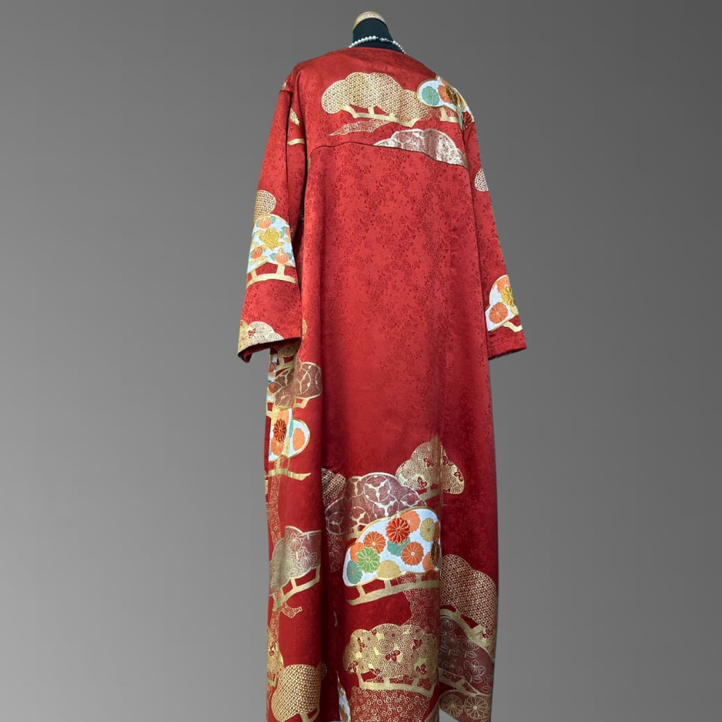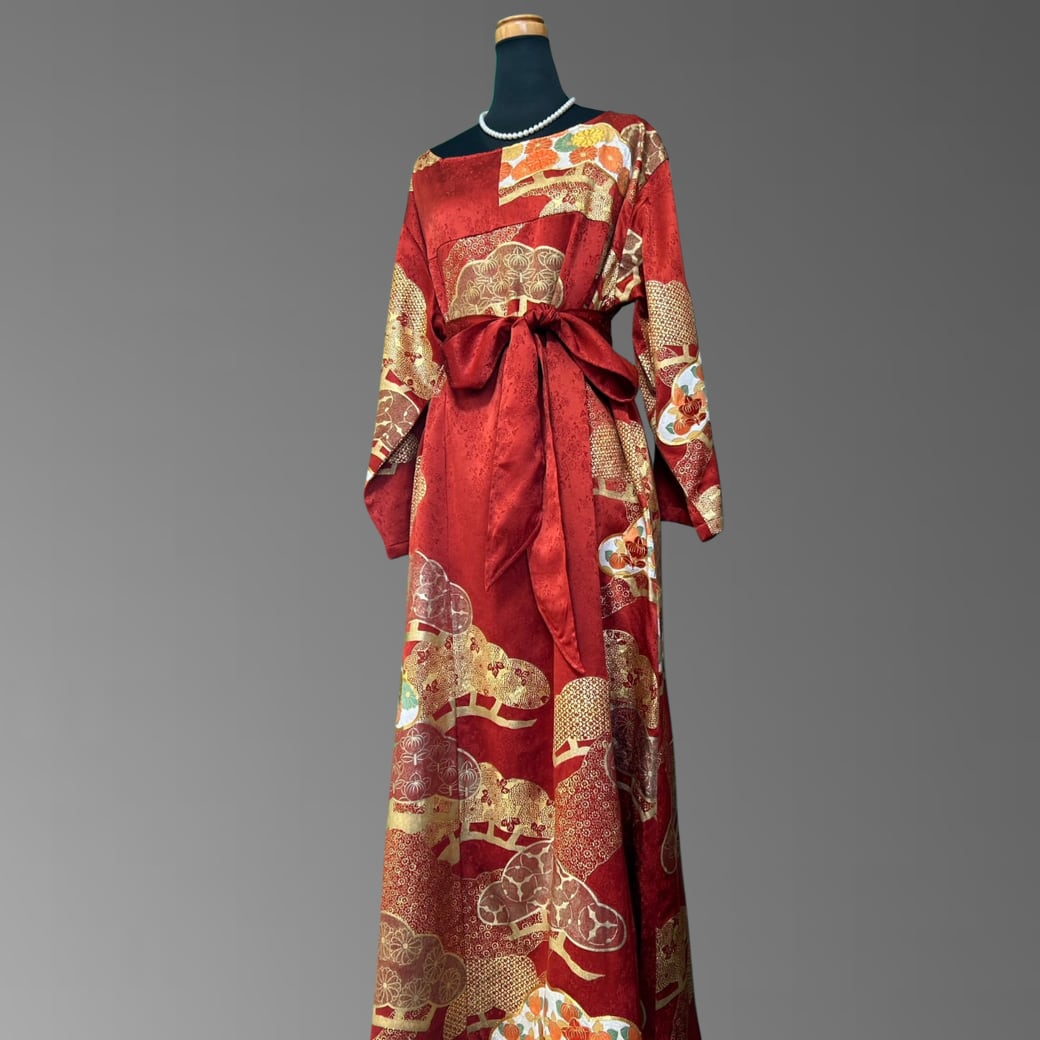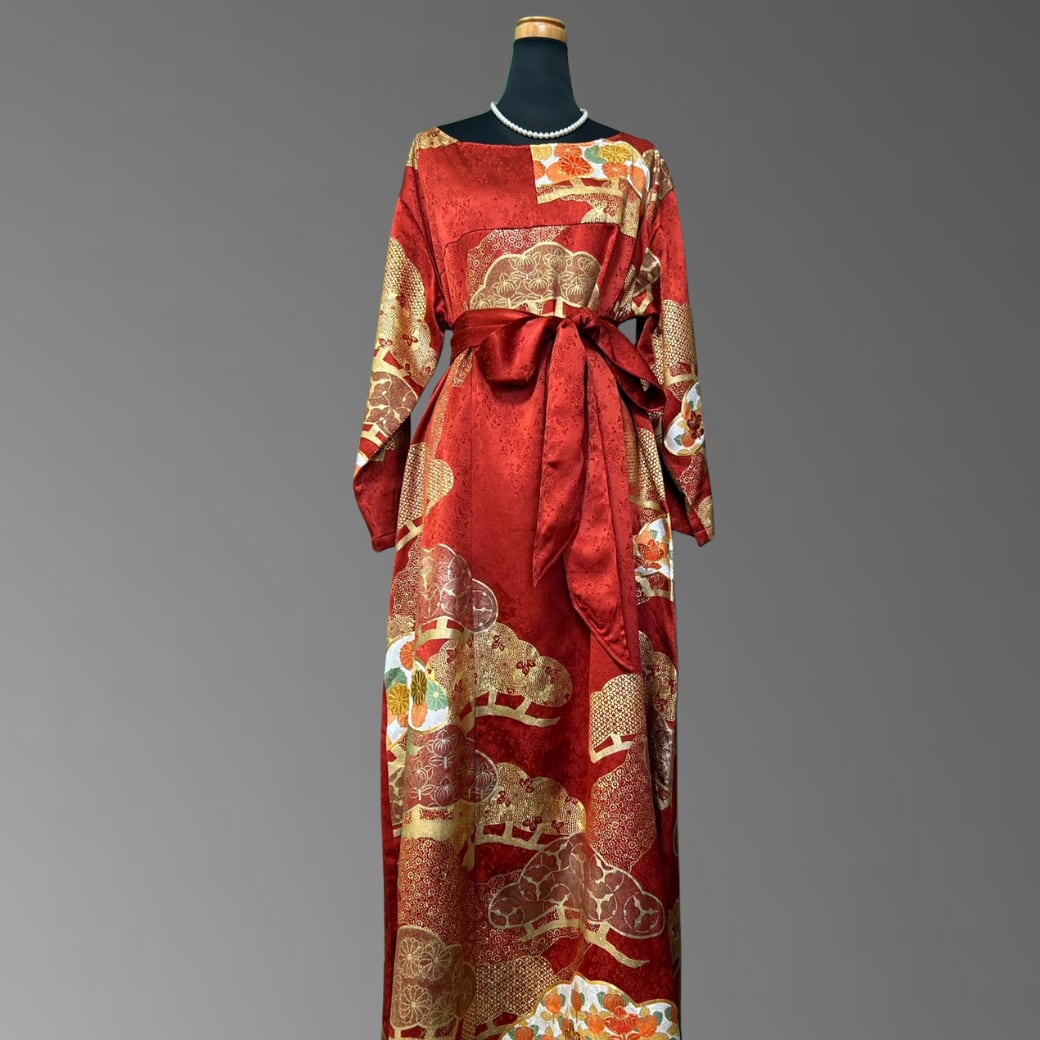 こちらの着物ワンピースは、華やかな赤地に金彩を重ねた振袖をもとに仕立てた一着です。