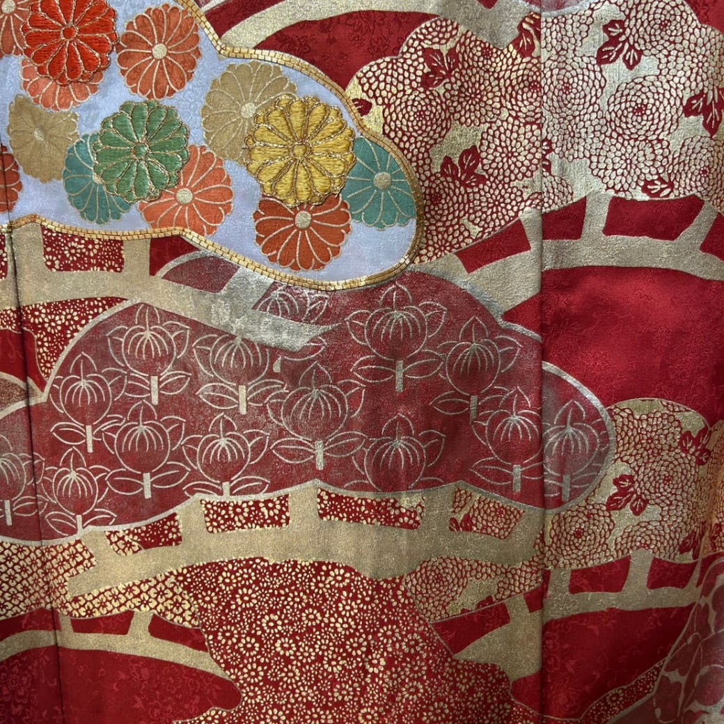 深みのある朱赤に、松、菊、橘の意匠が伸びやかに配され、動くたびに奥行きのある表情を見せてくれます。