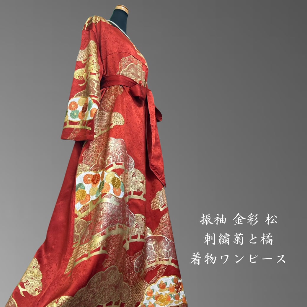 振袖 金彩 松 刺繍菊と橘 着物ワンピース