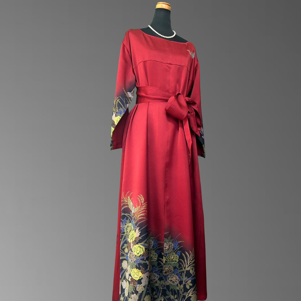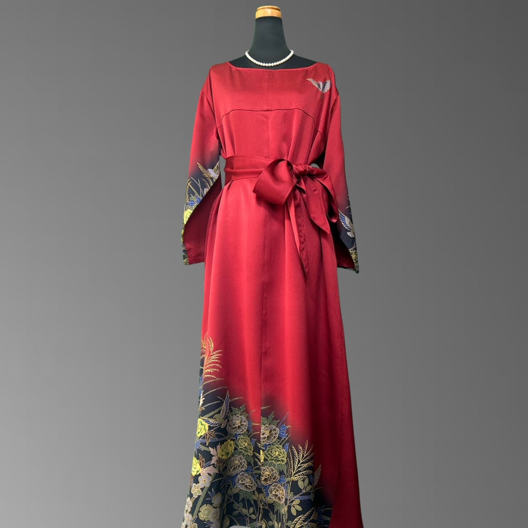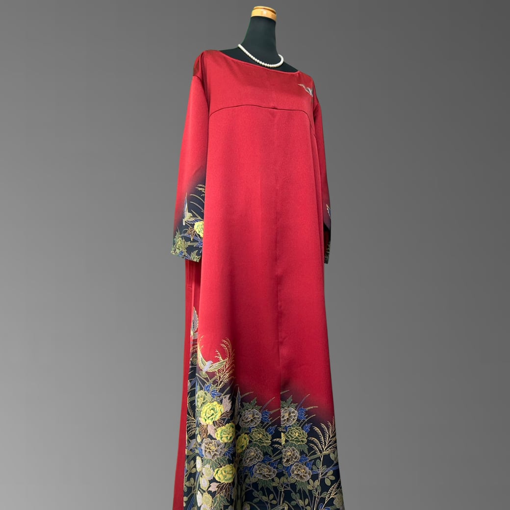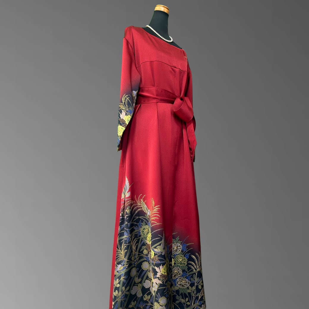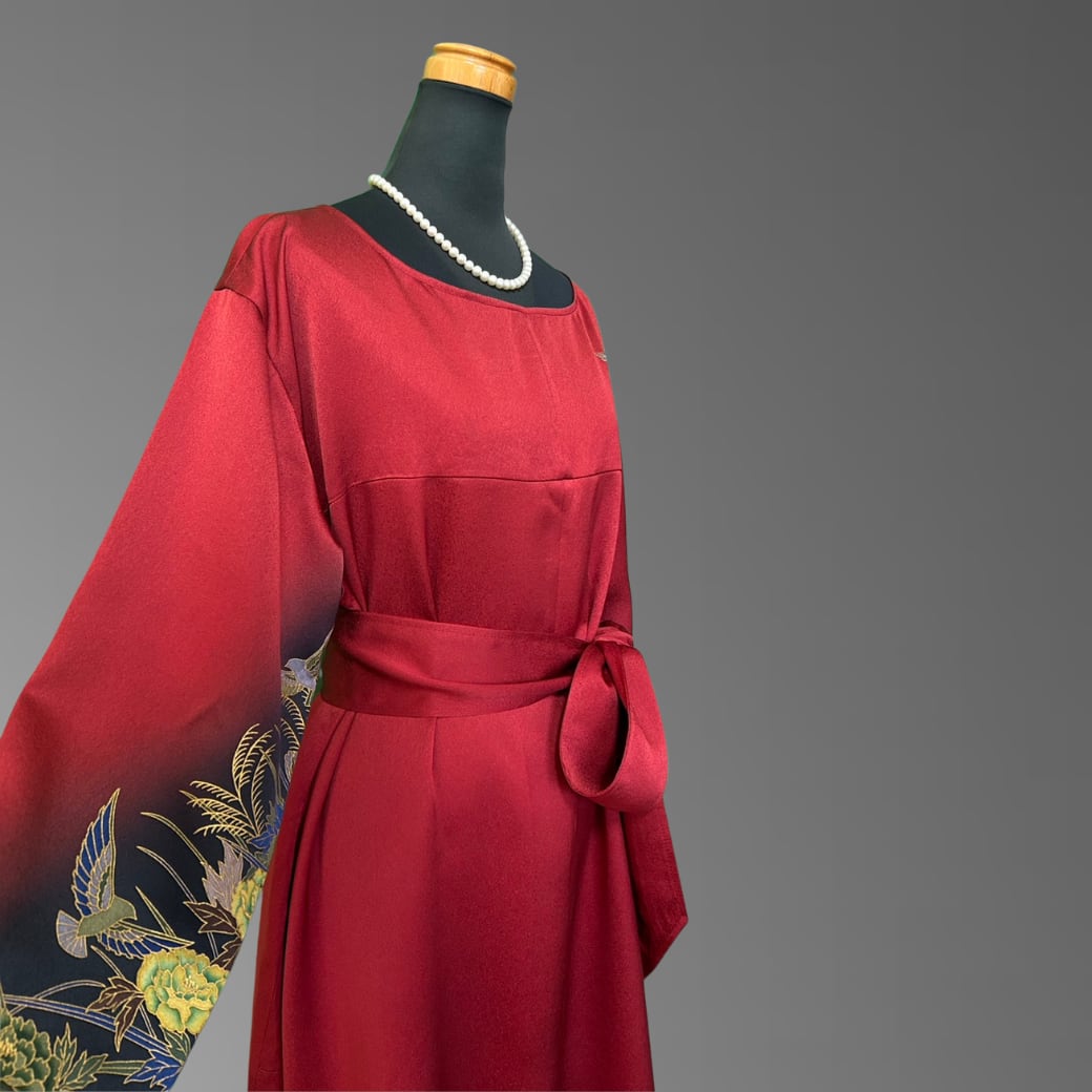 こちらの着物ワンピースは、作家物の振袖をもとに仕立てた、華やかさと奥行きを併せ持つ一着です。