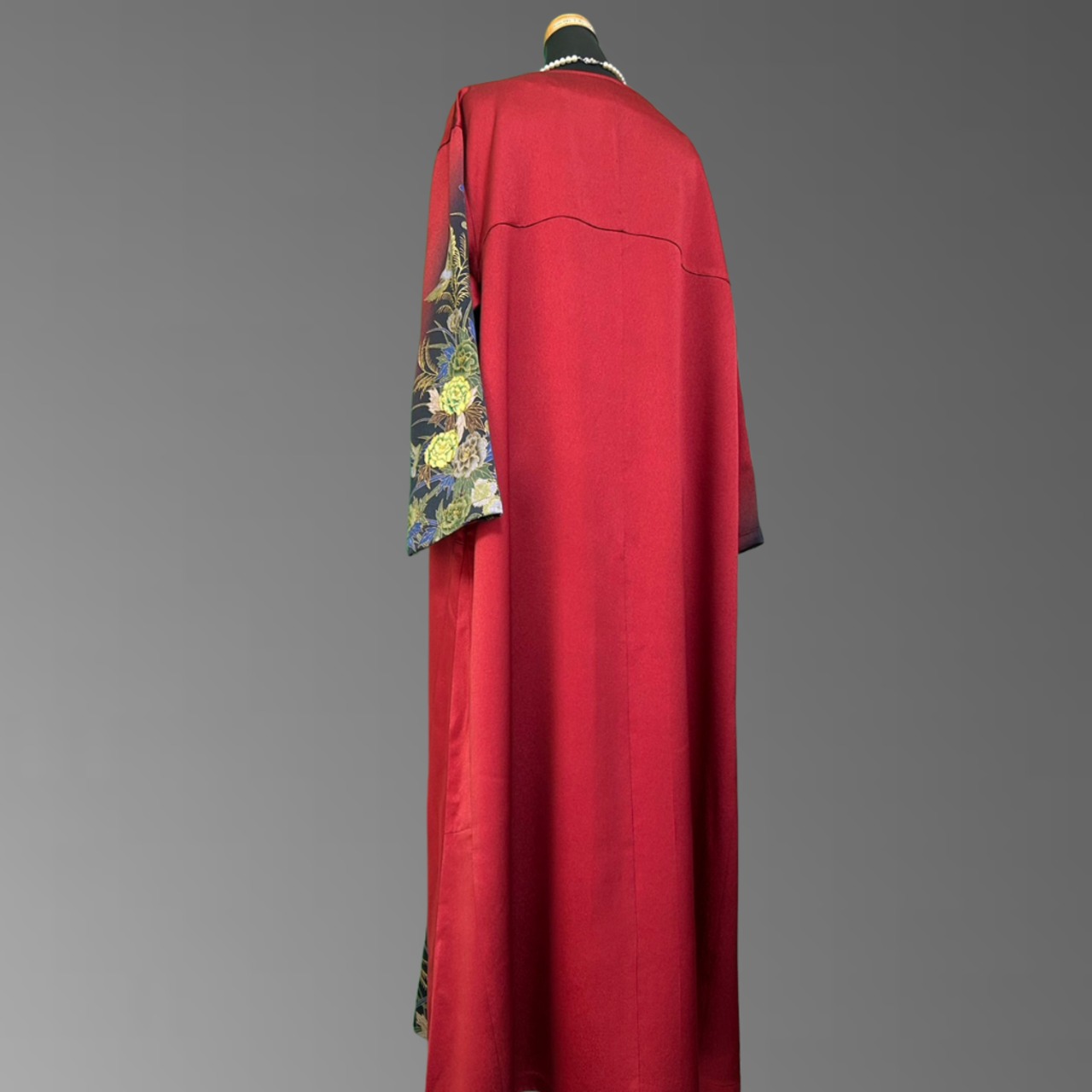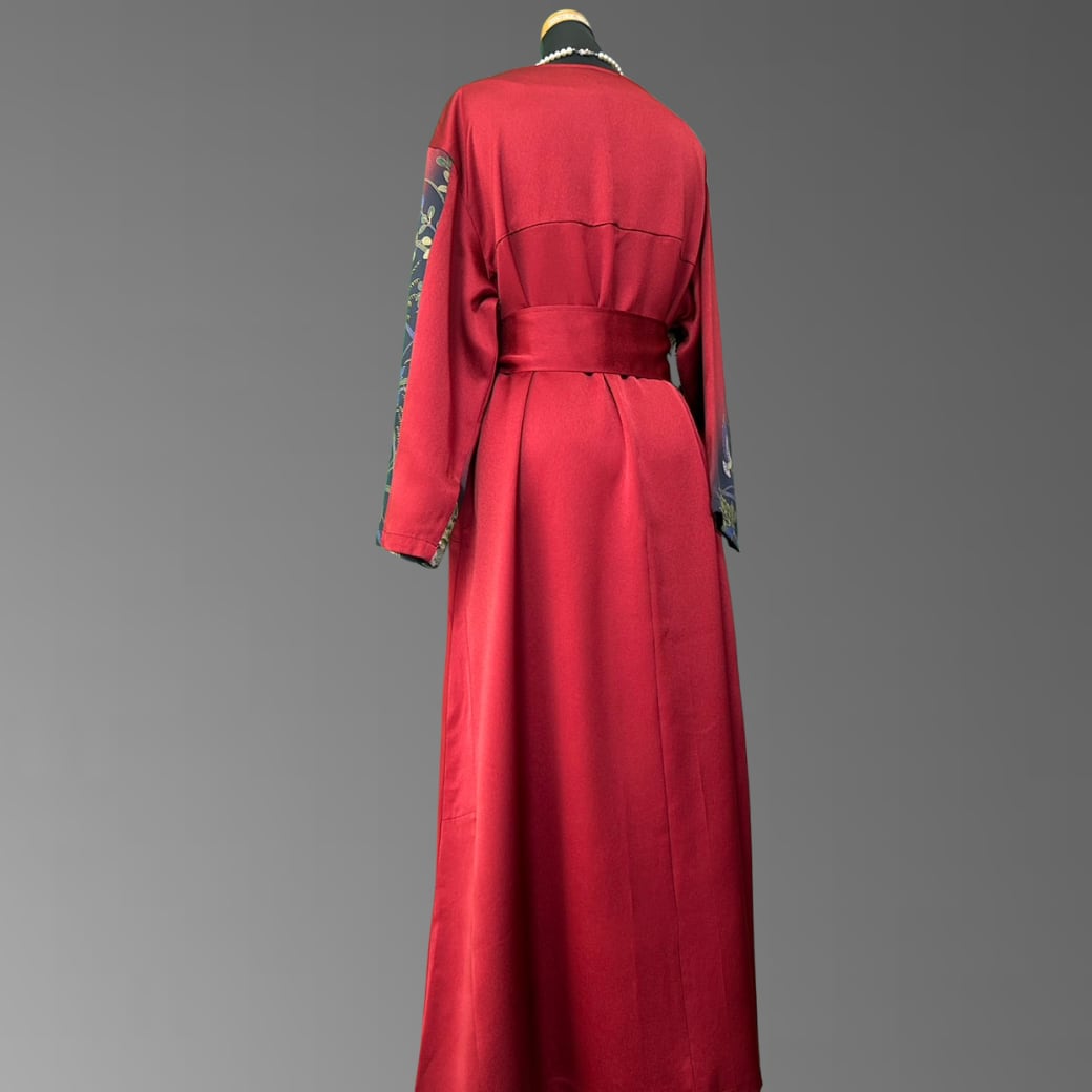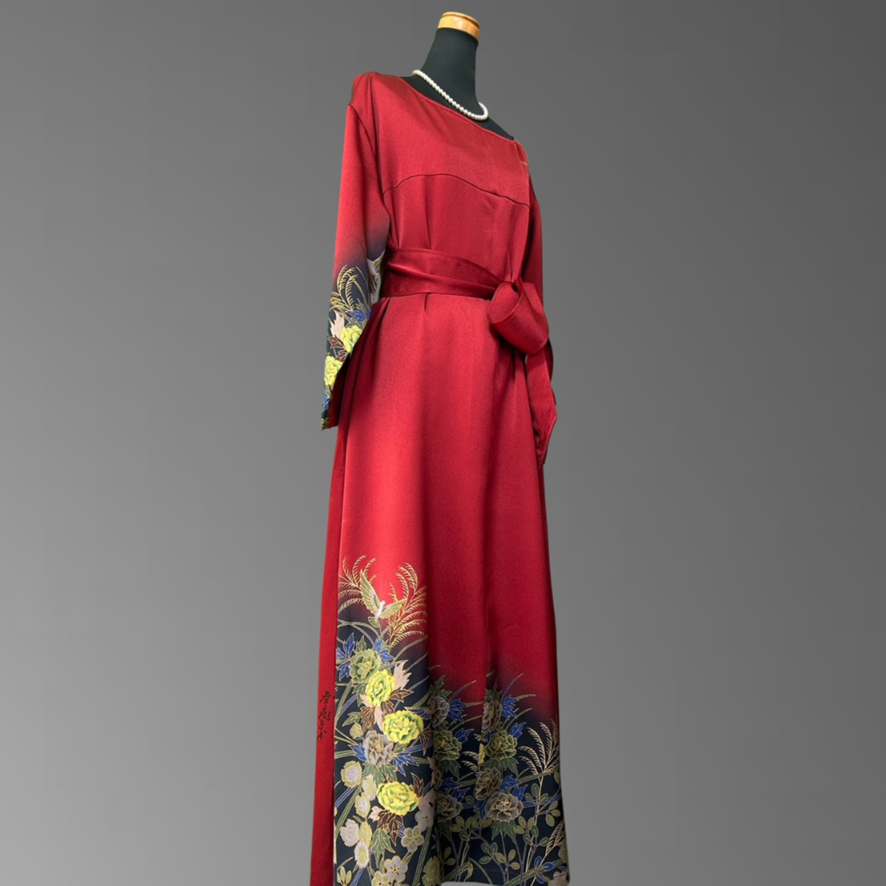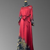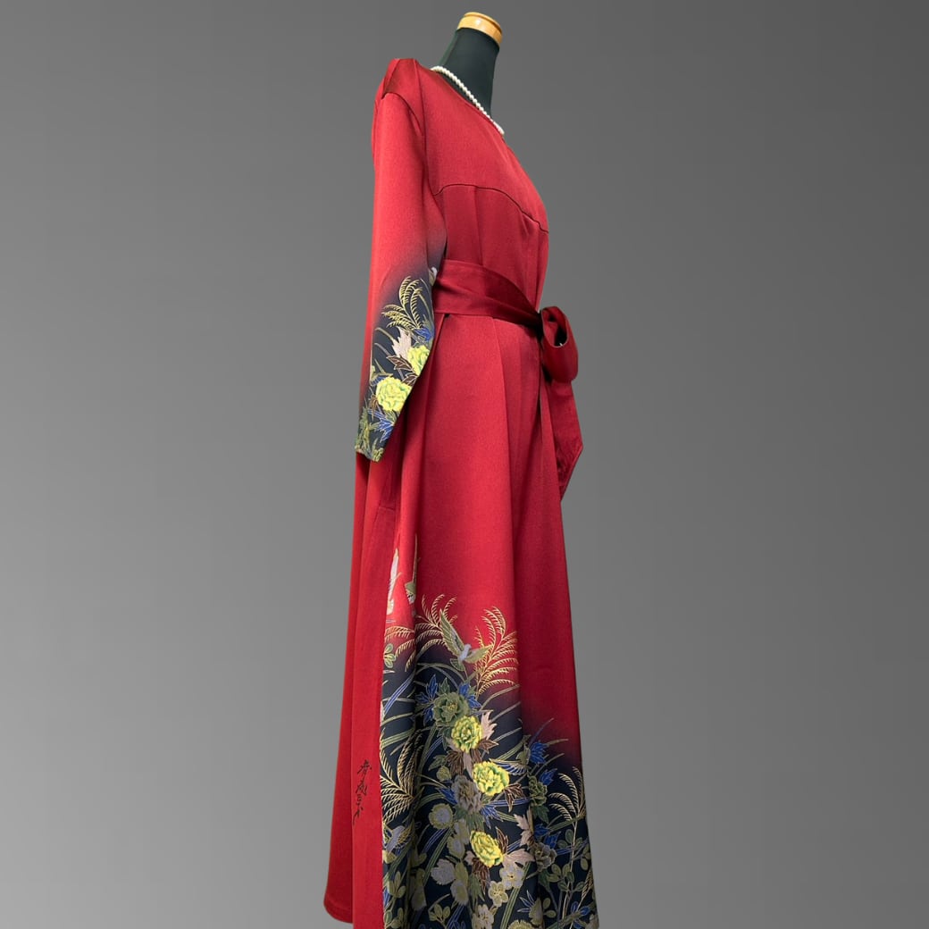 こちらの着物ワンピースは、作家物の振袖をもとに仕立てた、華やかさと奥行きを併せ持つ一着です。
