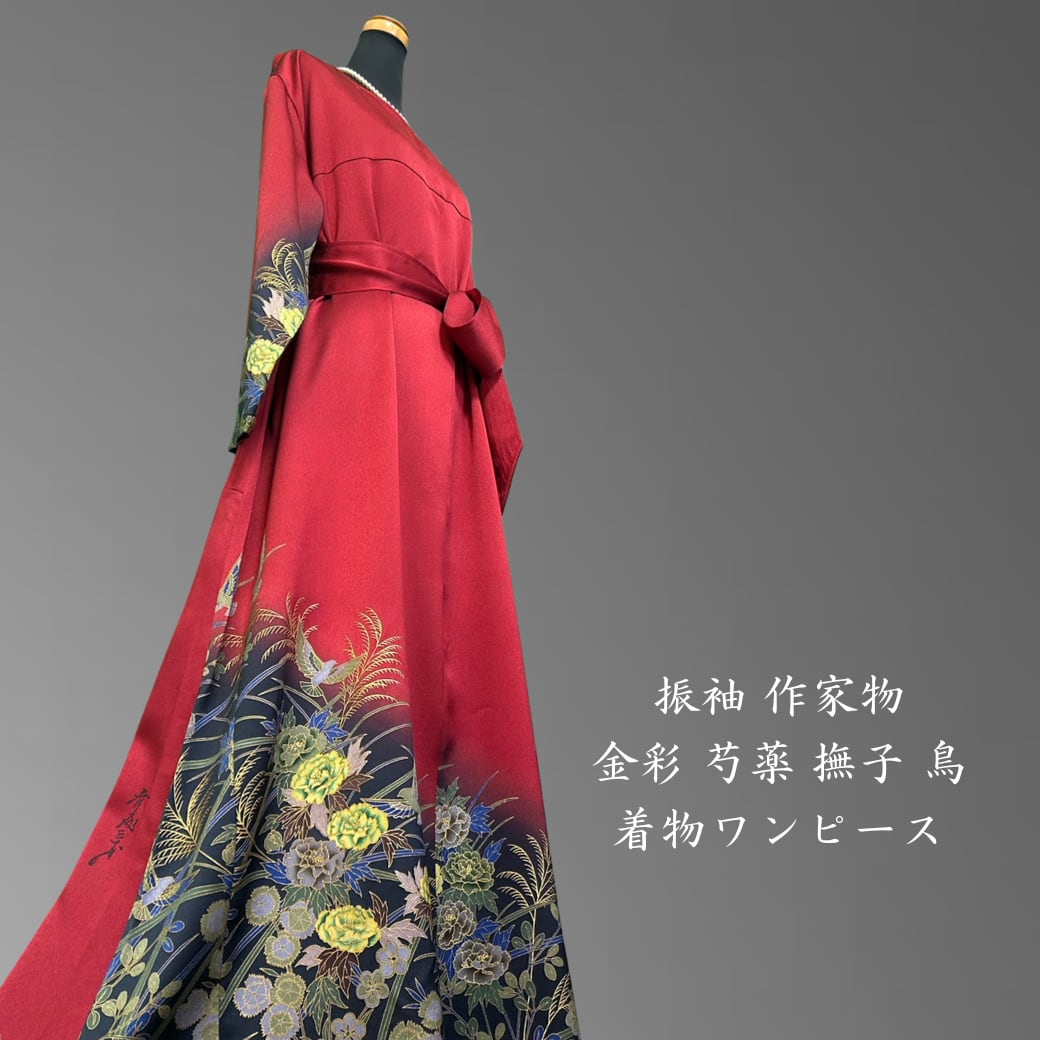 振袖 作家物 金彩 芍薬 撫子 鳥 着物ワンピース