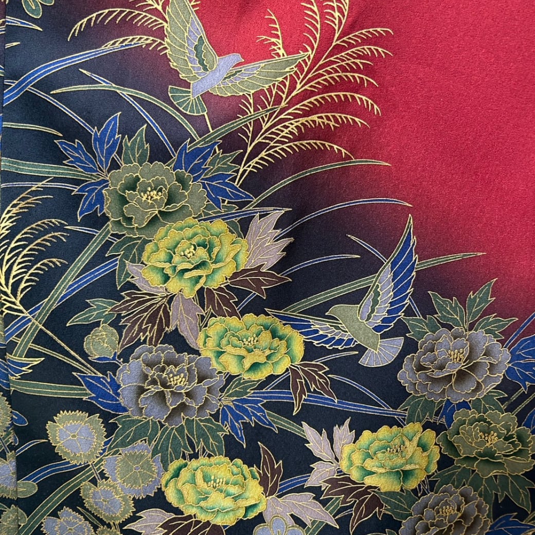 花々とともに描かれることで、華やかさの中に軽やかな動きが生まれ、振袖ならではの格調高さと、どこか伸びやかな空気感が共存しています。