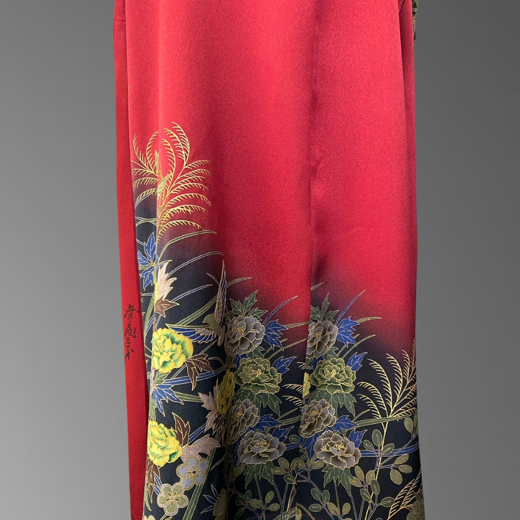 深みのある赤を基調に、裾へと流れるように配された金彩の意匠が、静かな存在感を放ちます。