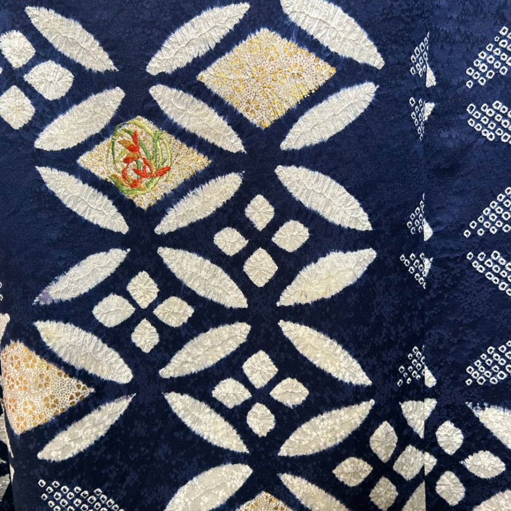 深い藍色を基調に、絞りならではの柔らかな凹凸と、光を含んだような白の文様が静かに浮かび上がります。