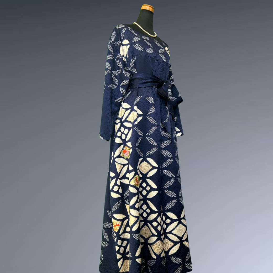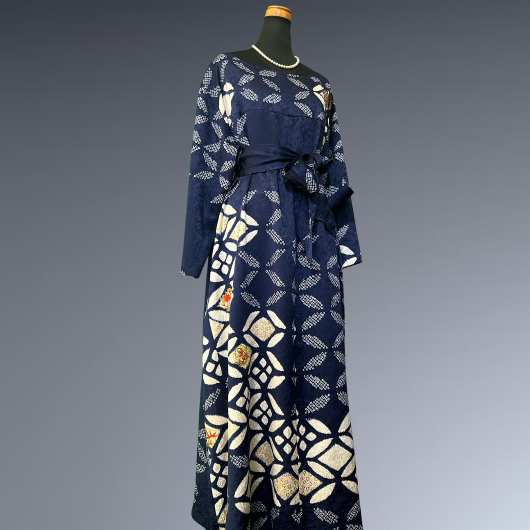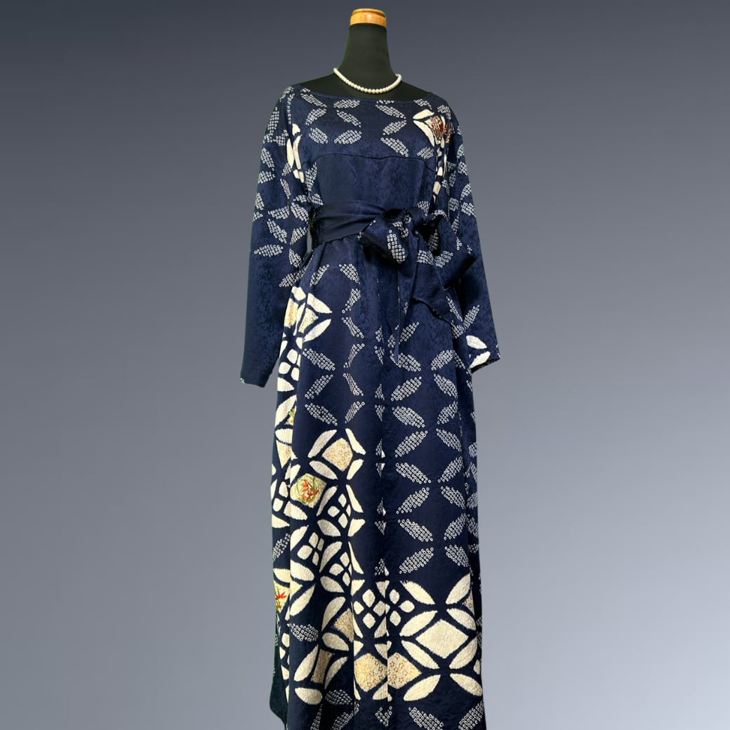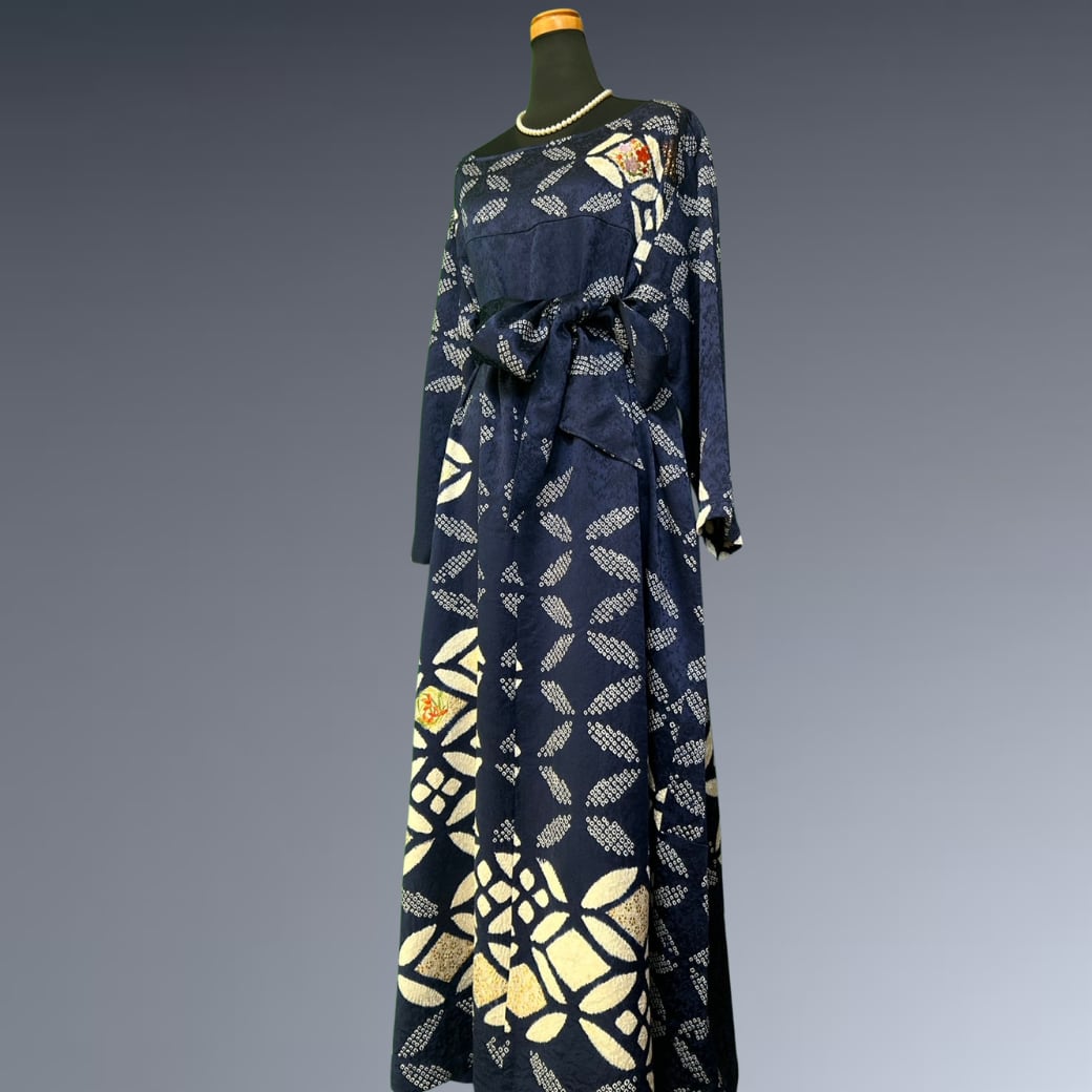 こちらの着物ワンピースは、絞りの振袖をもとに仕立てた、奥行きある表情が魅力の一着です。