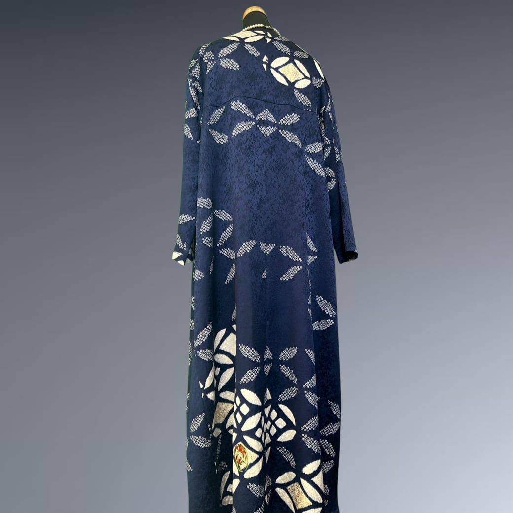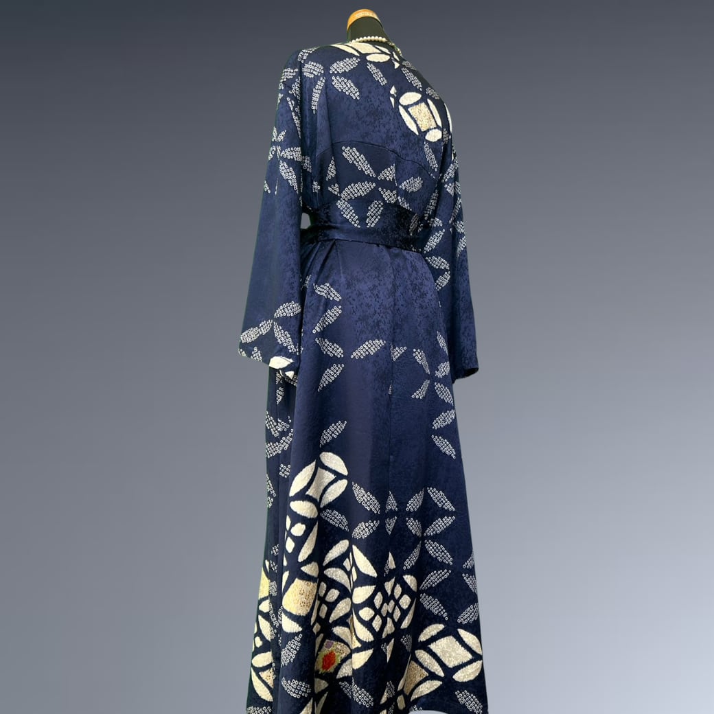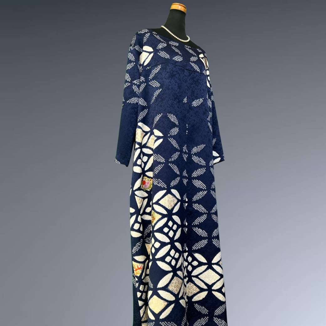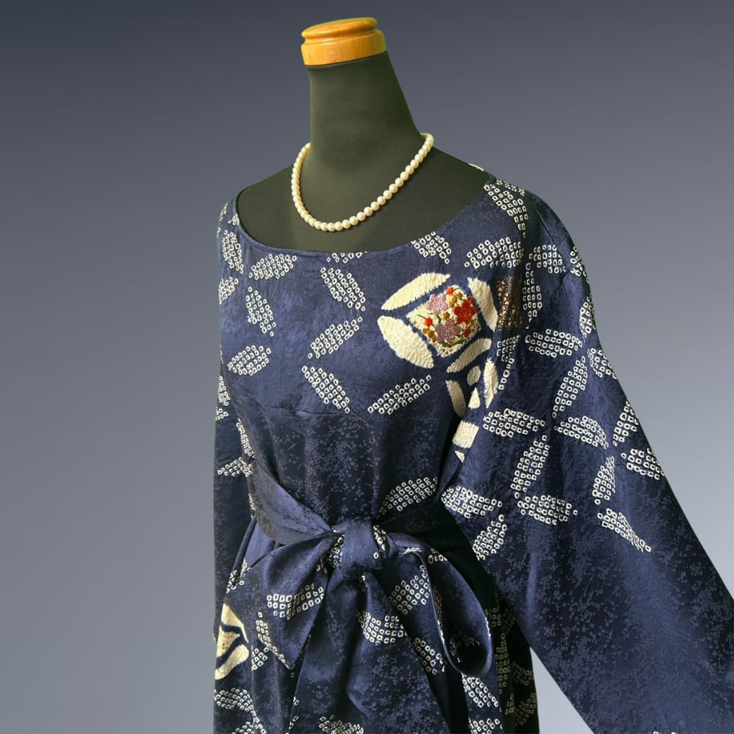 こちらの着物ワンピースは、絞りの振袖をもとに仕立てた、奥行きある表情が魅力の一着です。