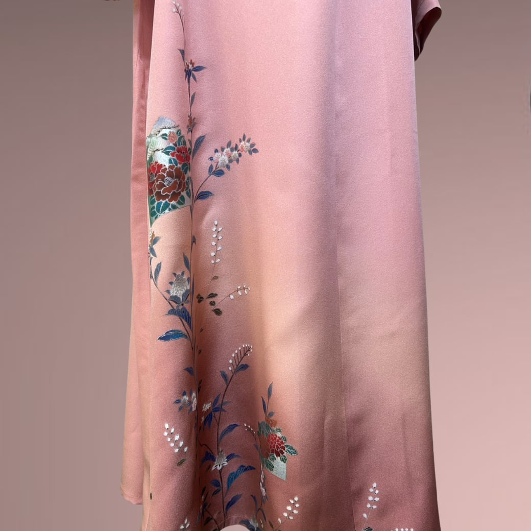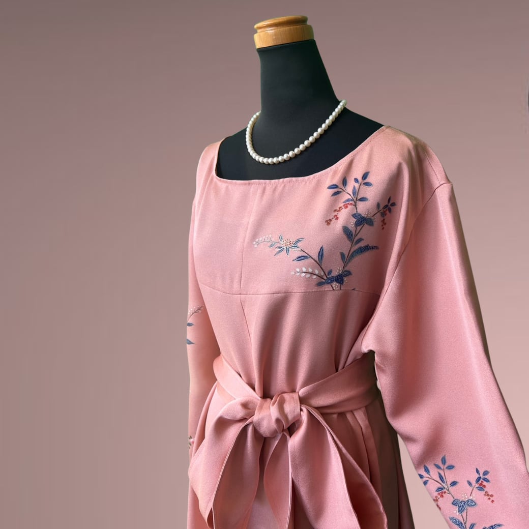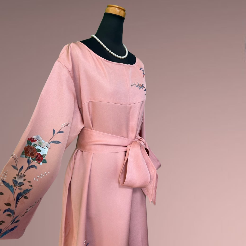 こちらの着物ワンピースは、やさしい色合いの訪問着をもとに仕立てた一着です。