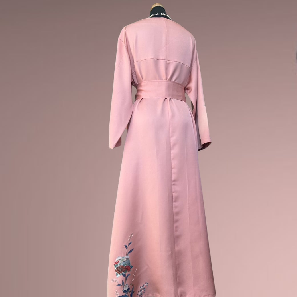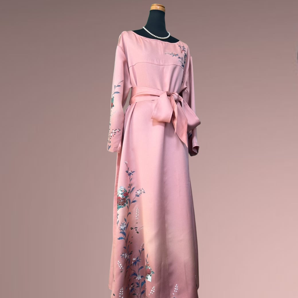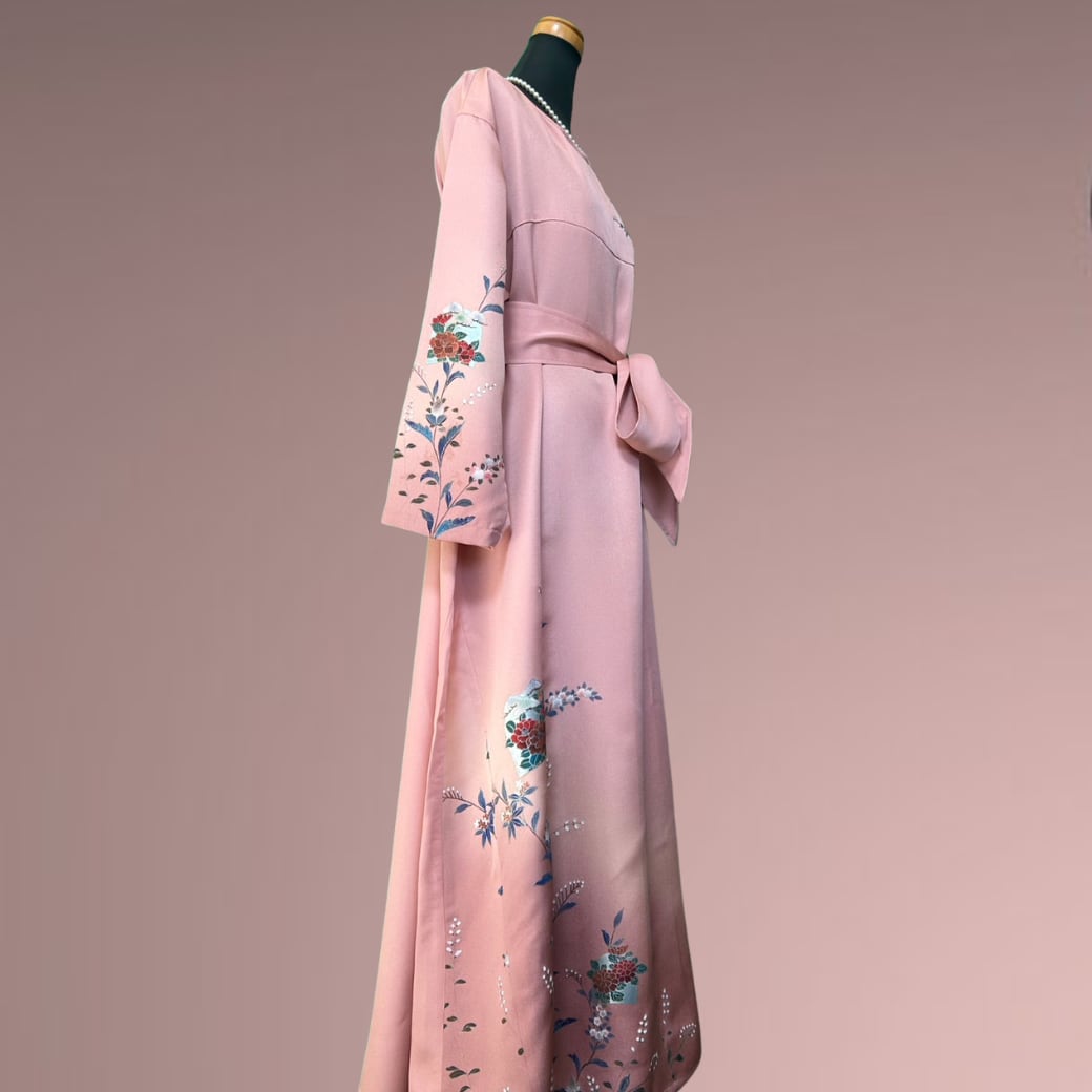 こちらの着物ワンピースは、やさしい色合いの訪問着をもとに仕立てた一着です。