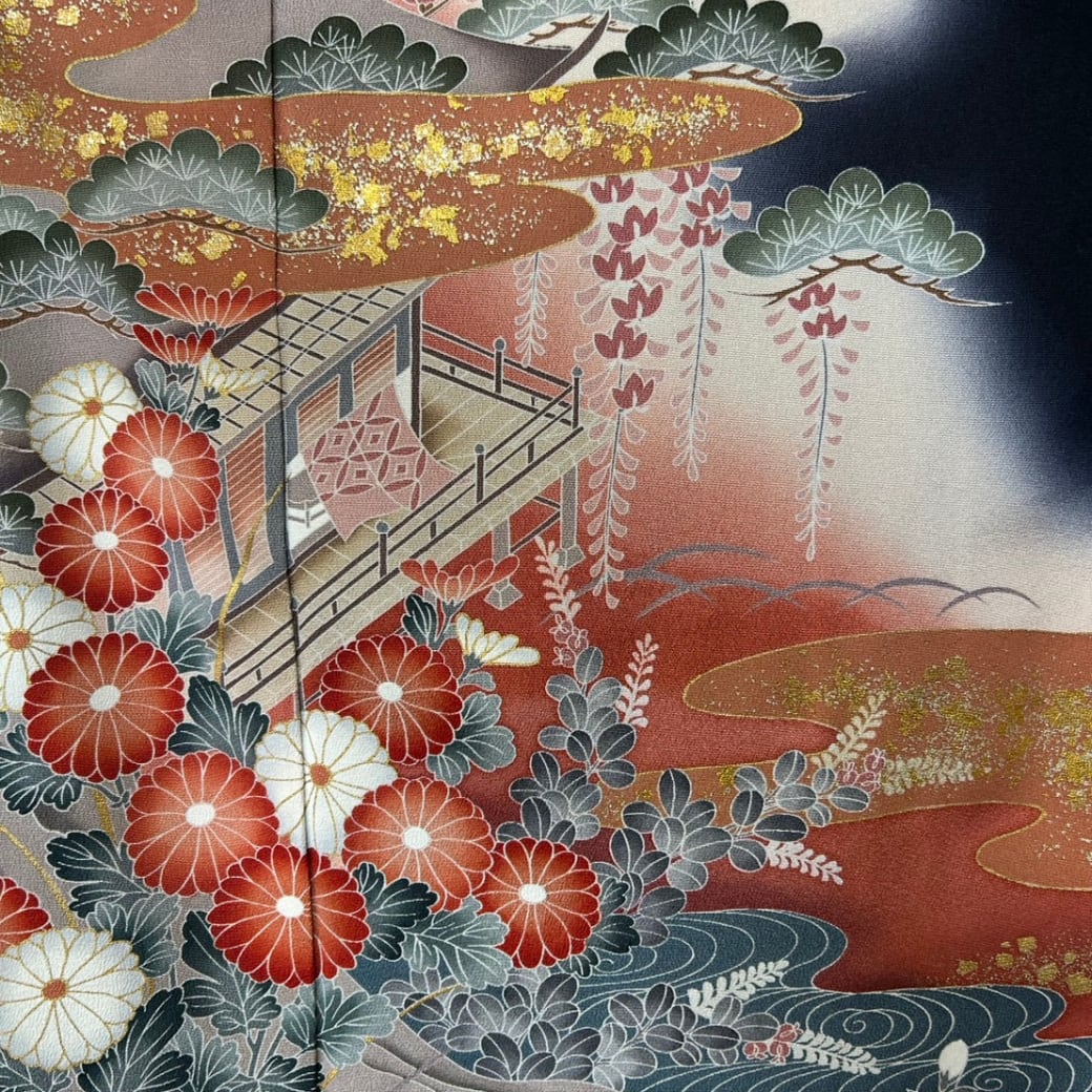 裾一面に広がるのは、穏やかな流れを描く雲取り文様に、力強く根を張る松、そして気品ある菊の意匠。