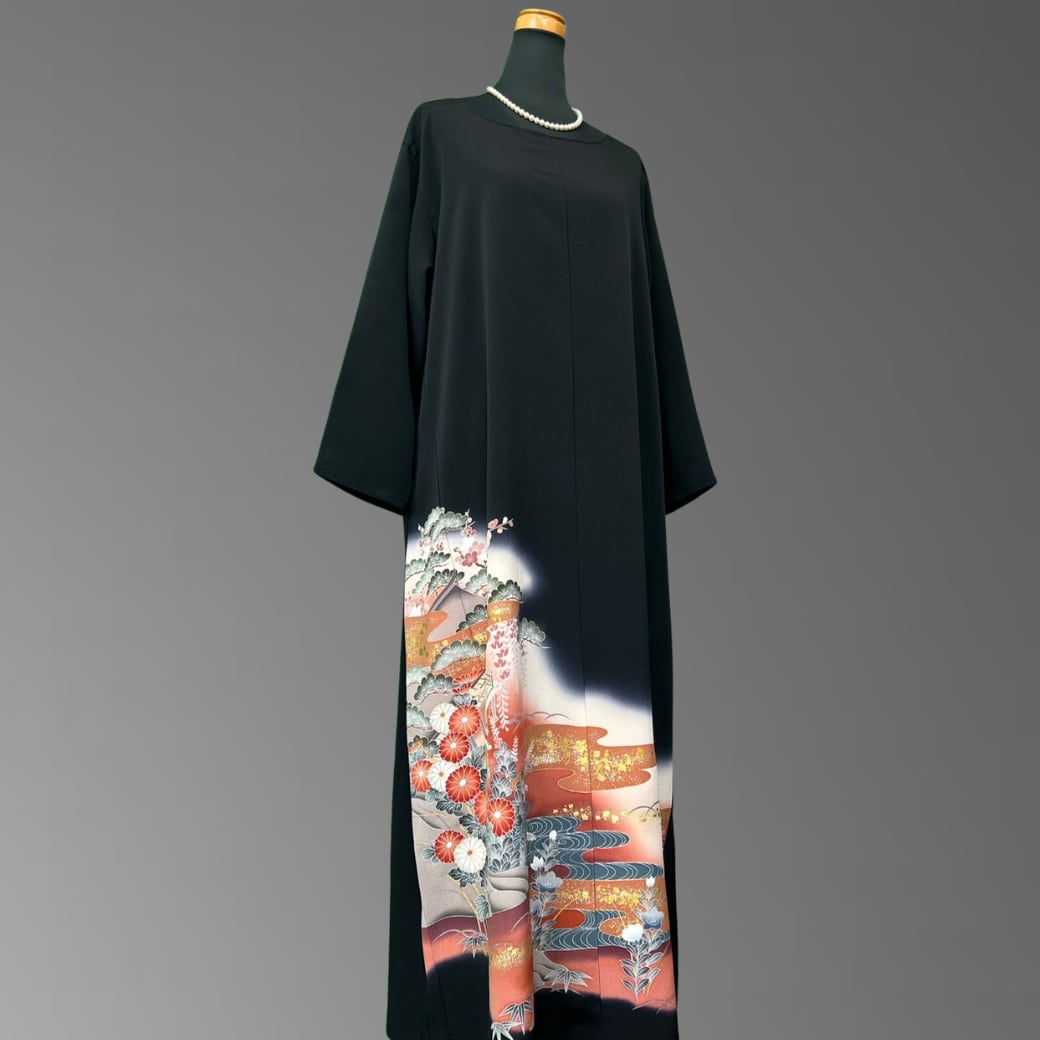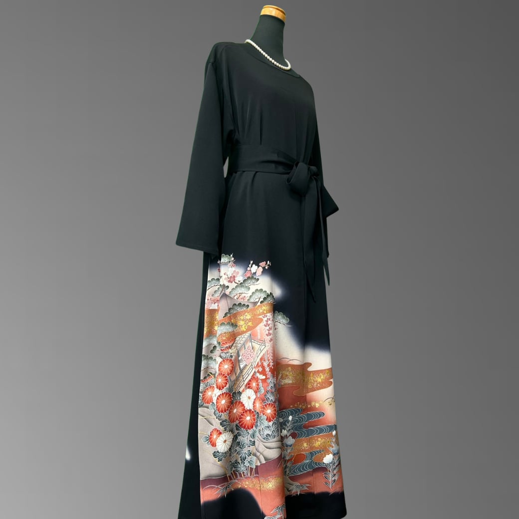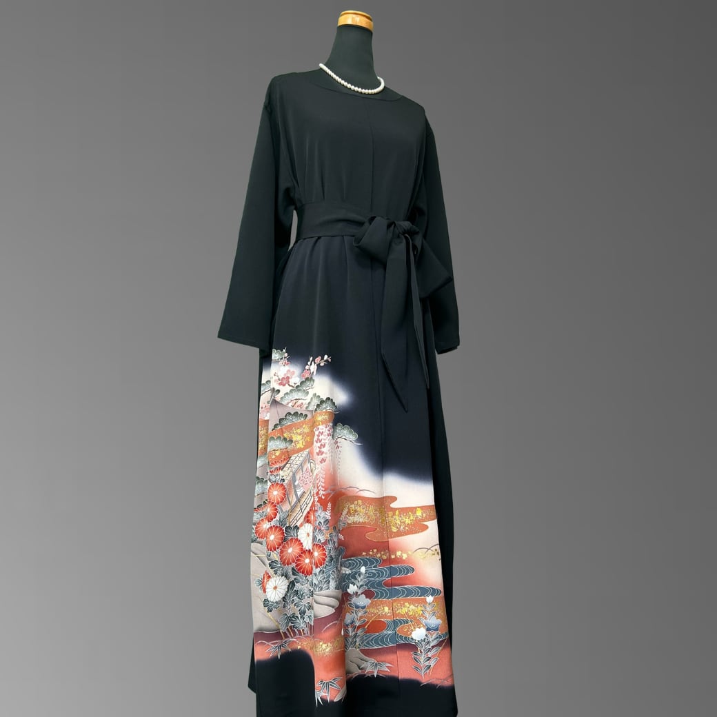 こちらの着物ワンピースは、格式高い黒留袖をもとに仕立てた一着です。