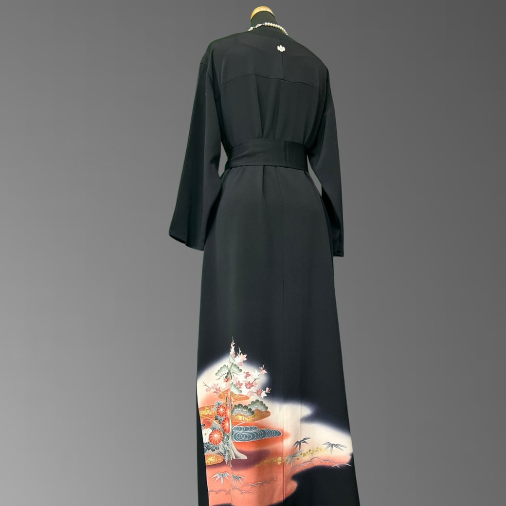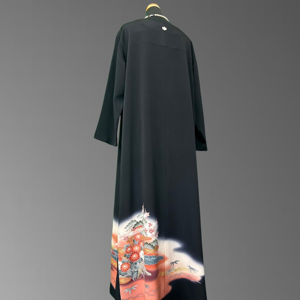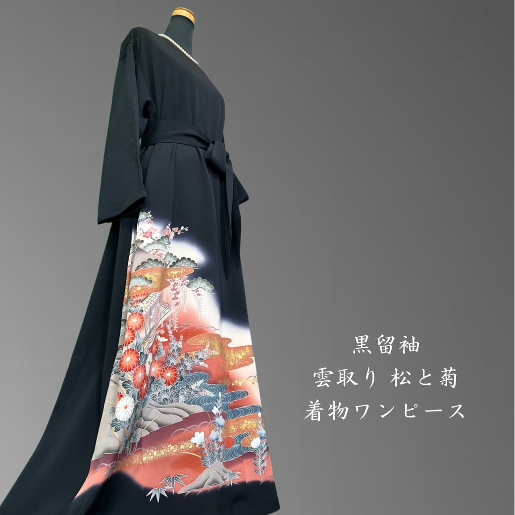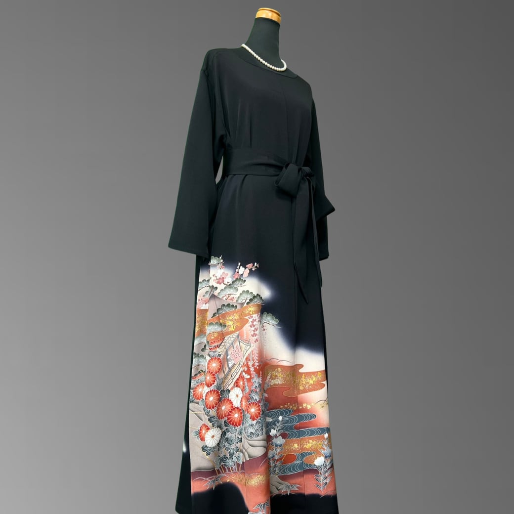 こちらの着物ワンピースは、格式高い黒留袖をもとに仕立てた一着です。