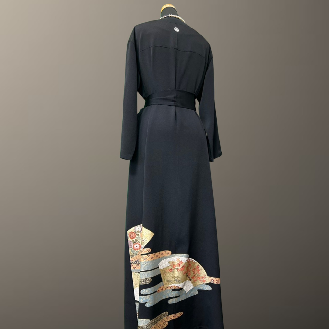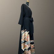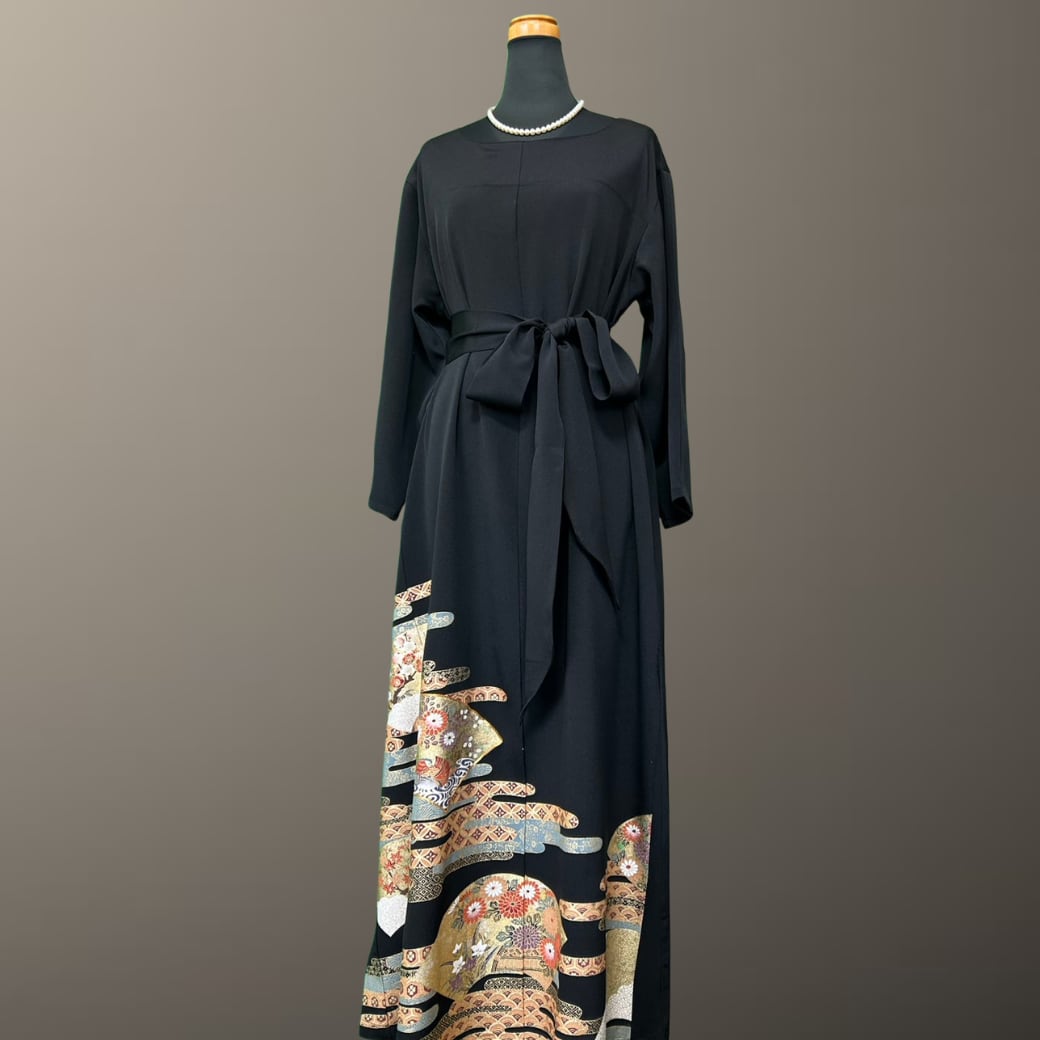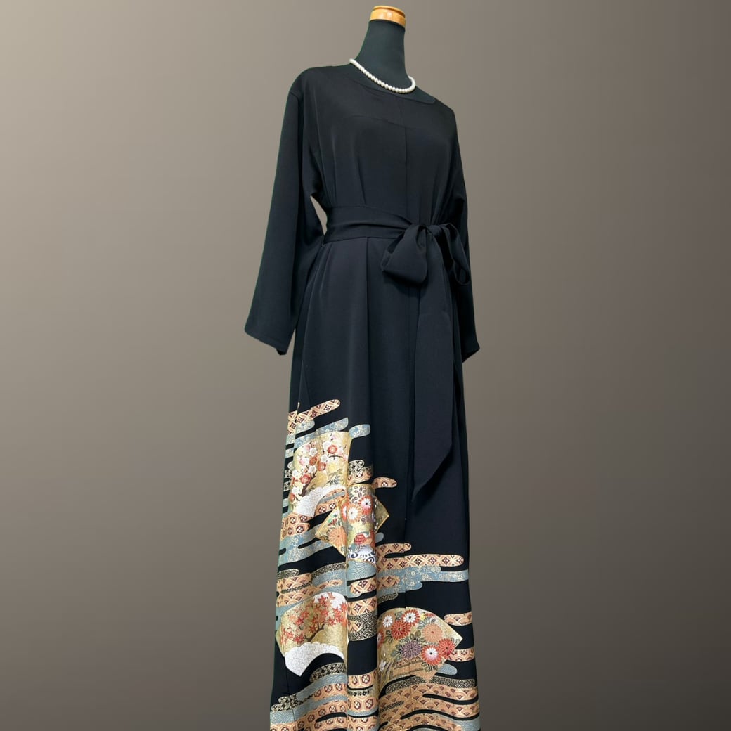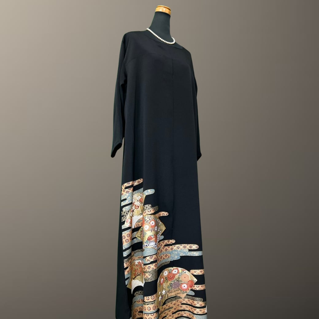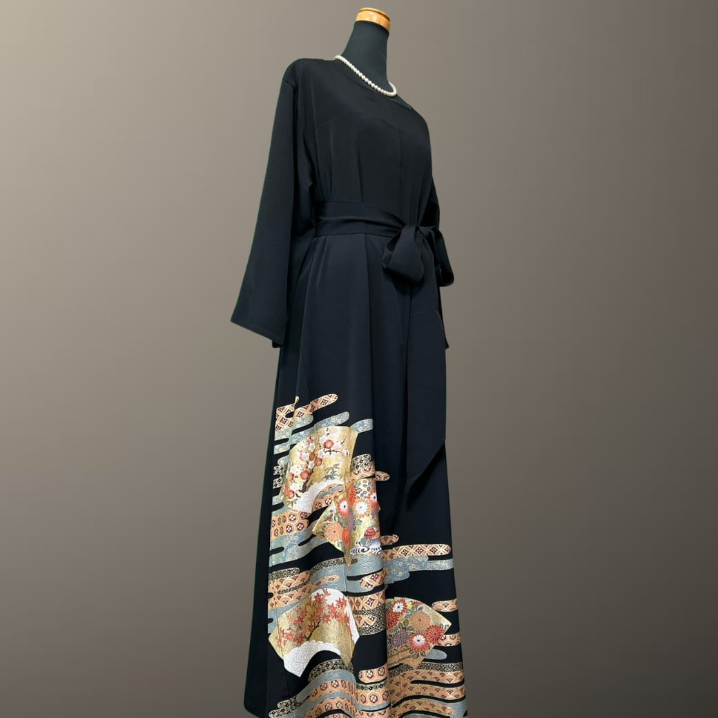 こちらの着物ワンピースは、格調高い黒留袖をもとに仕立てた一着です。
