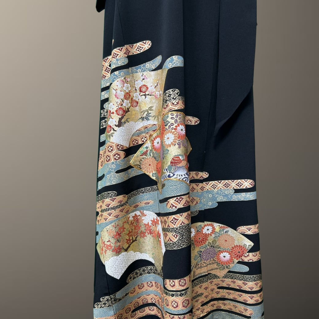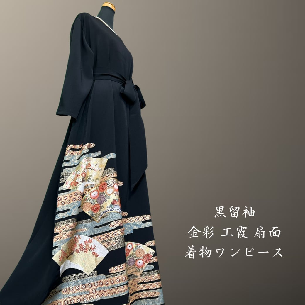 黒留袖 金彩 工霞 扇面 着物ワンピース