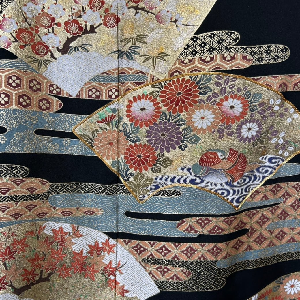 裾元に描かれているのは、金彩を重ねた工霞と、端正に配された扇面文様。