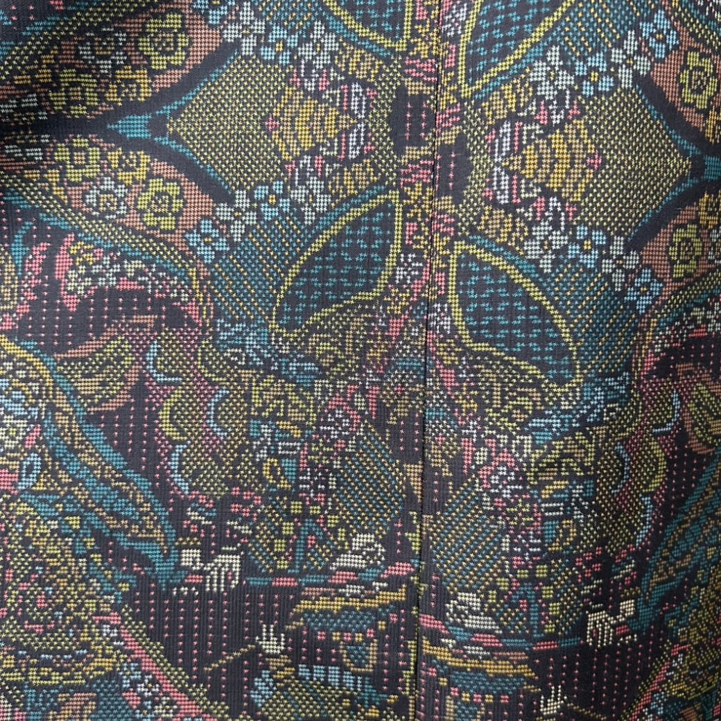 細やかな絣で描かれているのは、リズムを感じさせる踊り子の姿と、周囲を彩る花々の意匠。