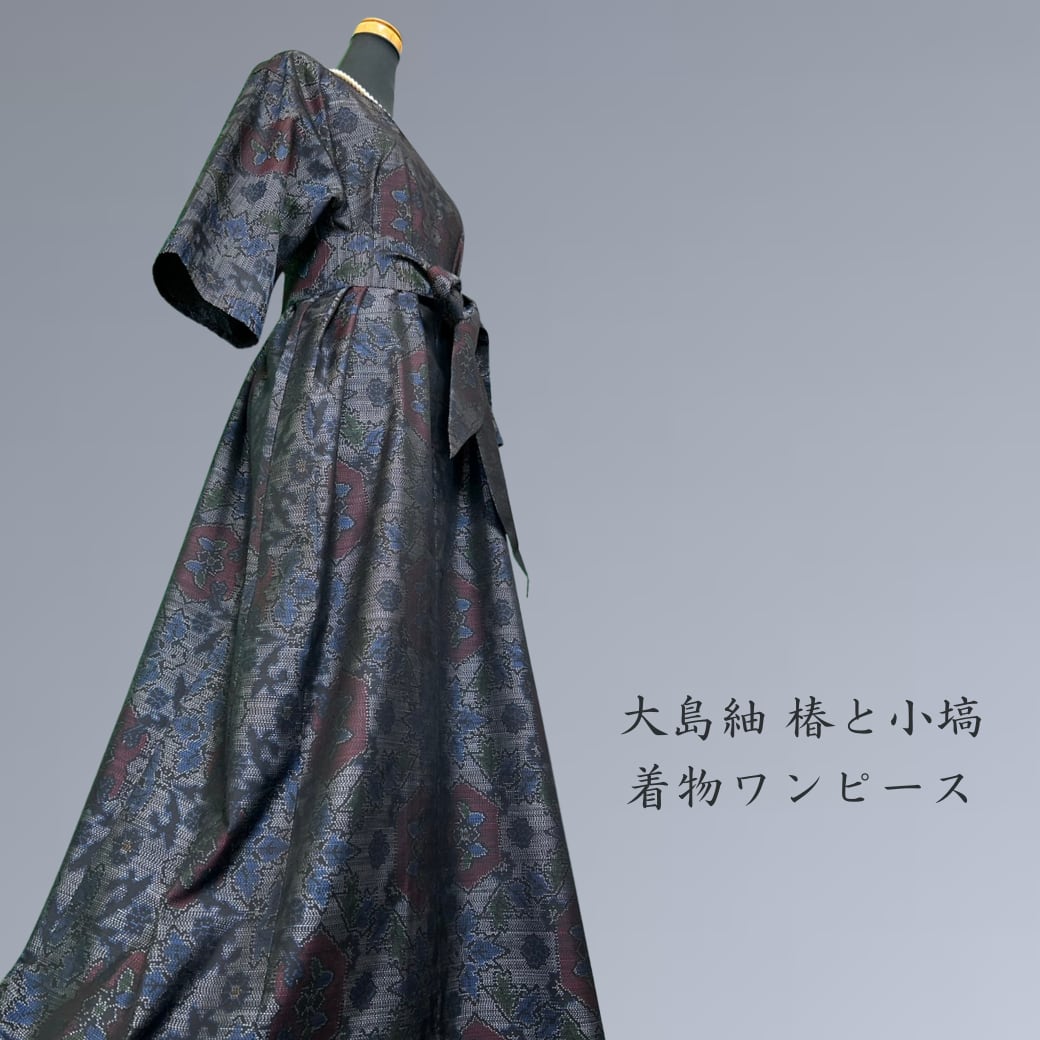 大島紬 椿と小塙 着物ワンピース