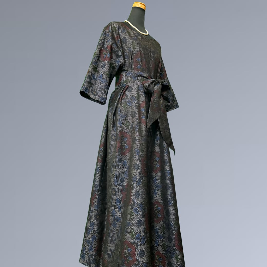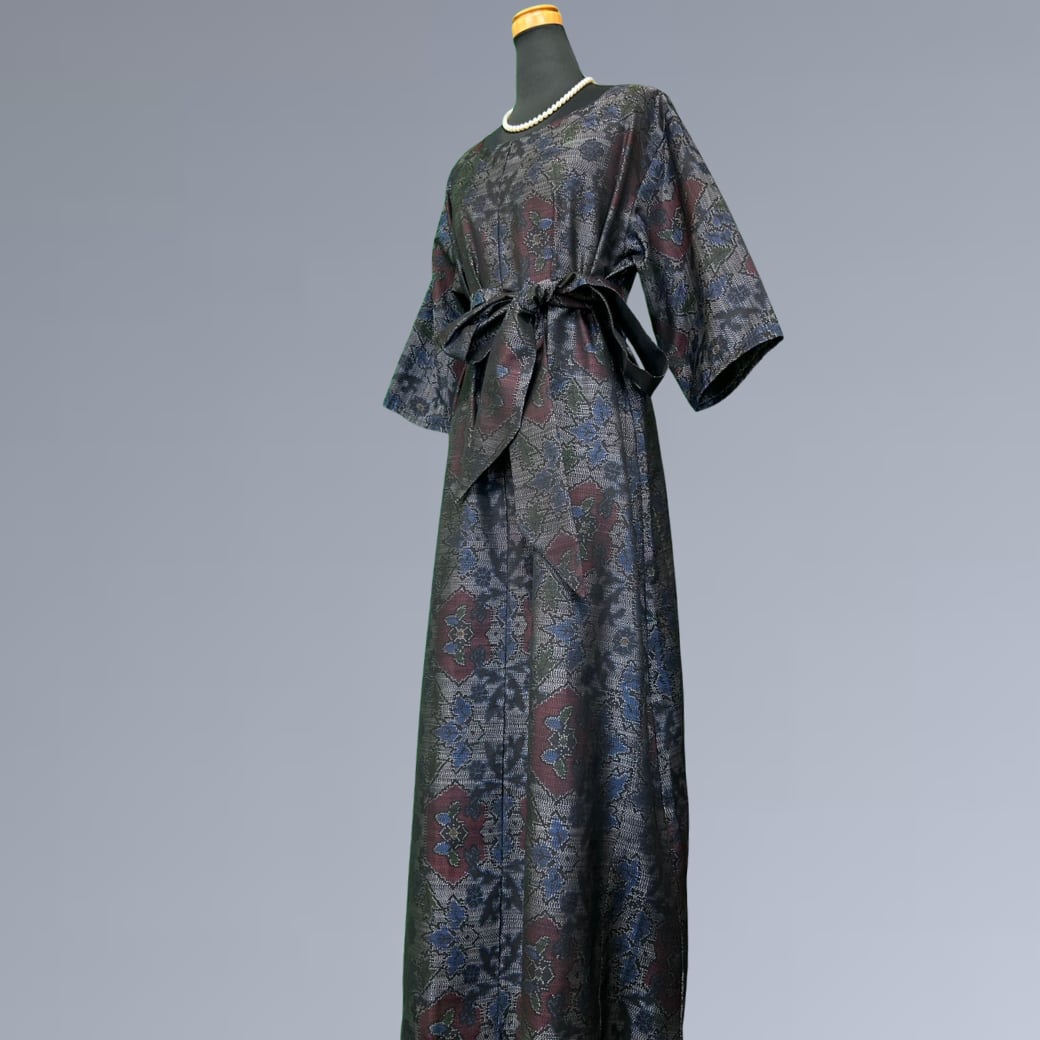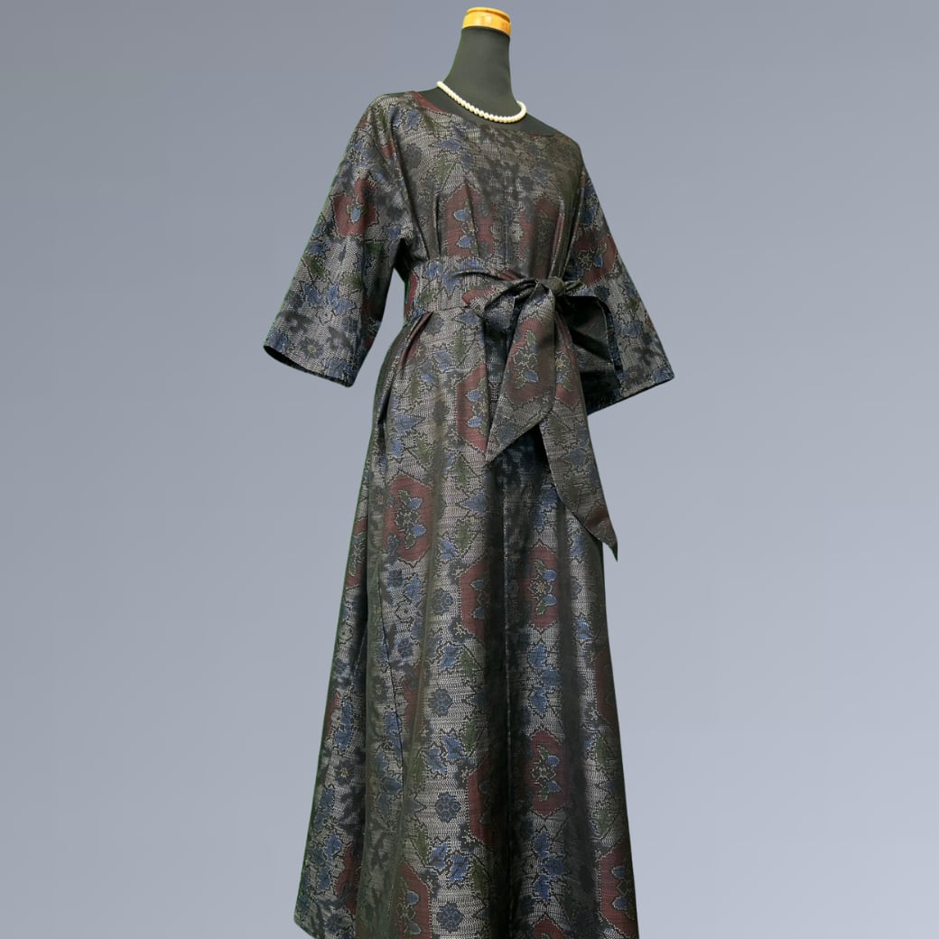 こちらの着物ワンピースは、繊細な絣としなやかな風合いが魅力の大島紬をもとに仕立てた一着です。