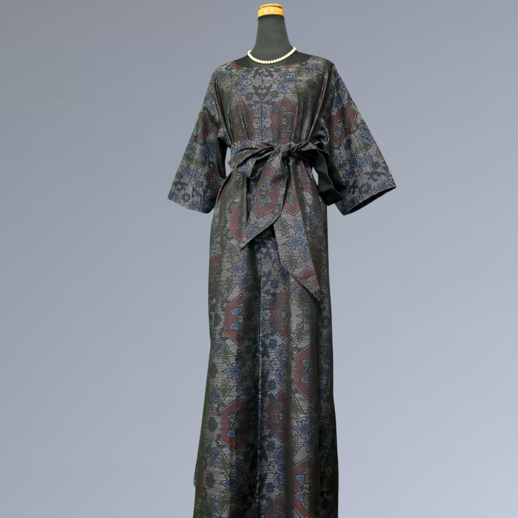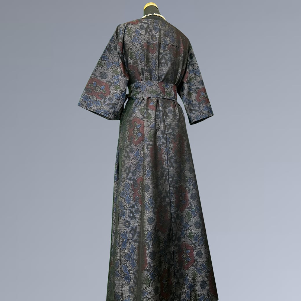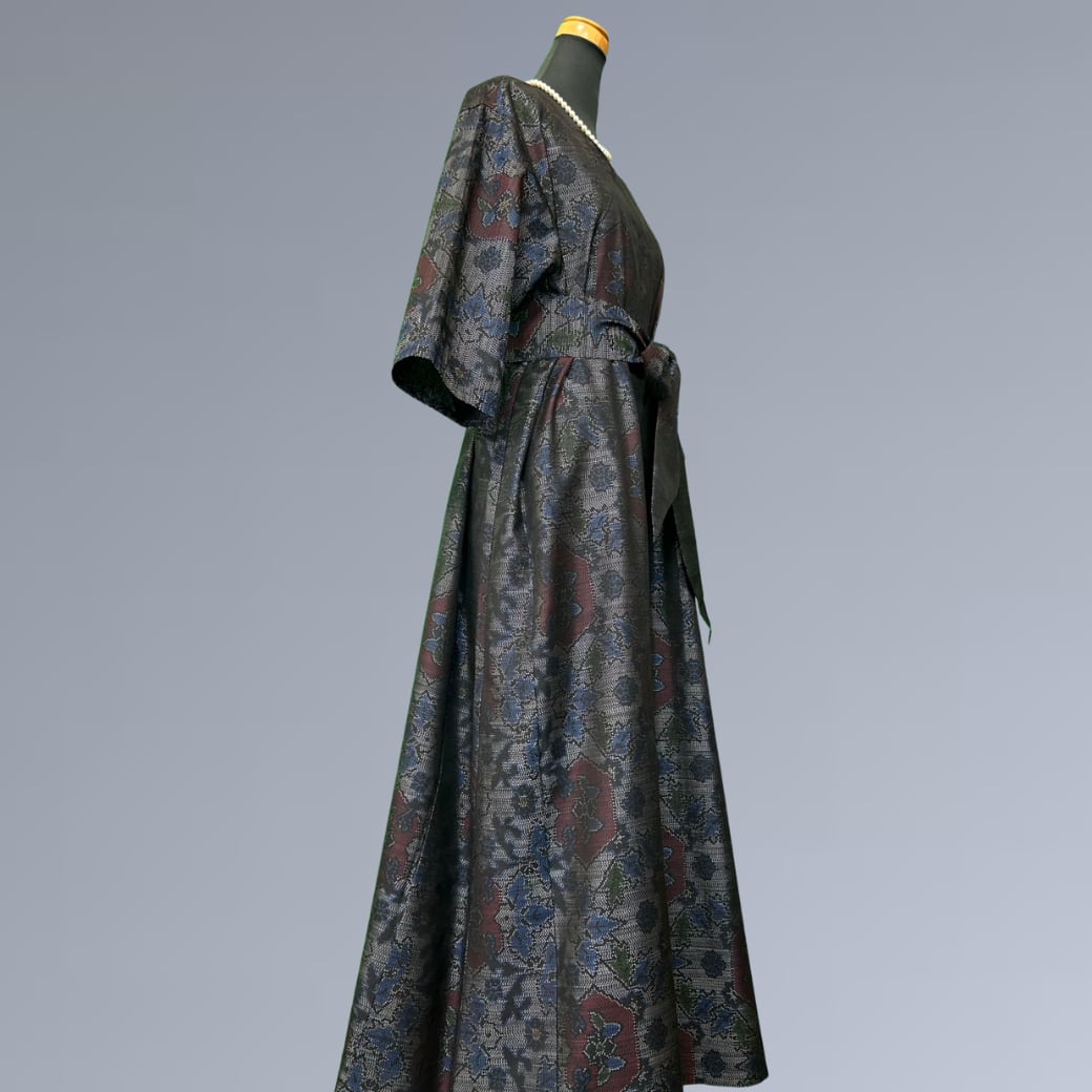 こちらの着物ワンピースは、繊細な絣としなやかな風合いが魅力の大島紬をもとに仕立てた一着です。
