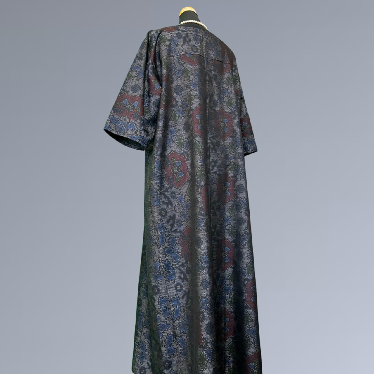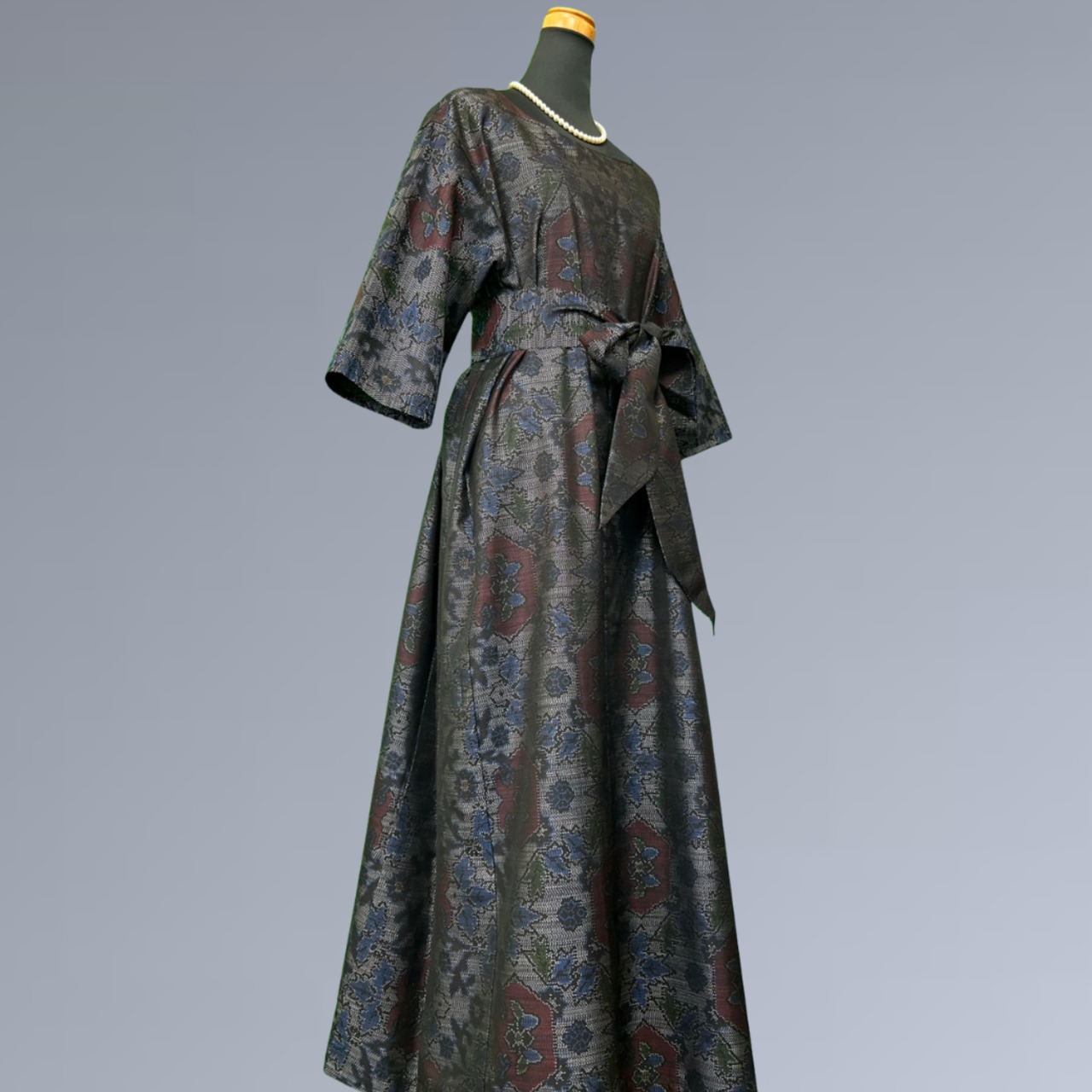 この二つの花が織りで表現されることで、華やかさと静けさが程よく調和し、大島紬ならではの奥行きある表情を生み出しています。