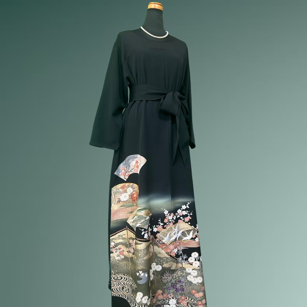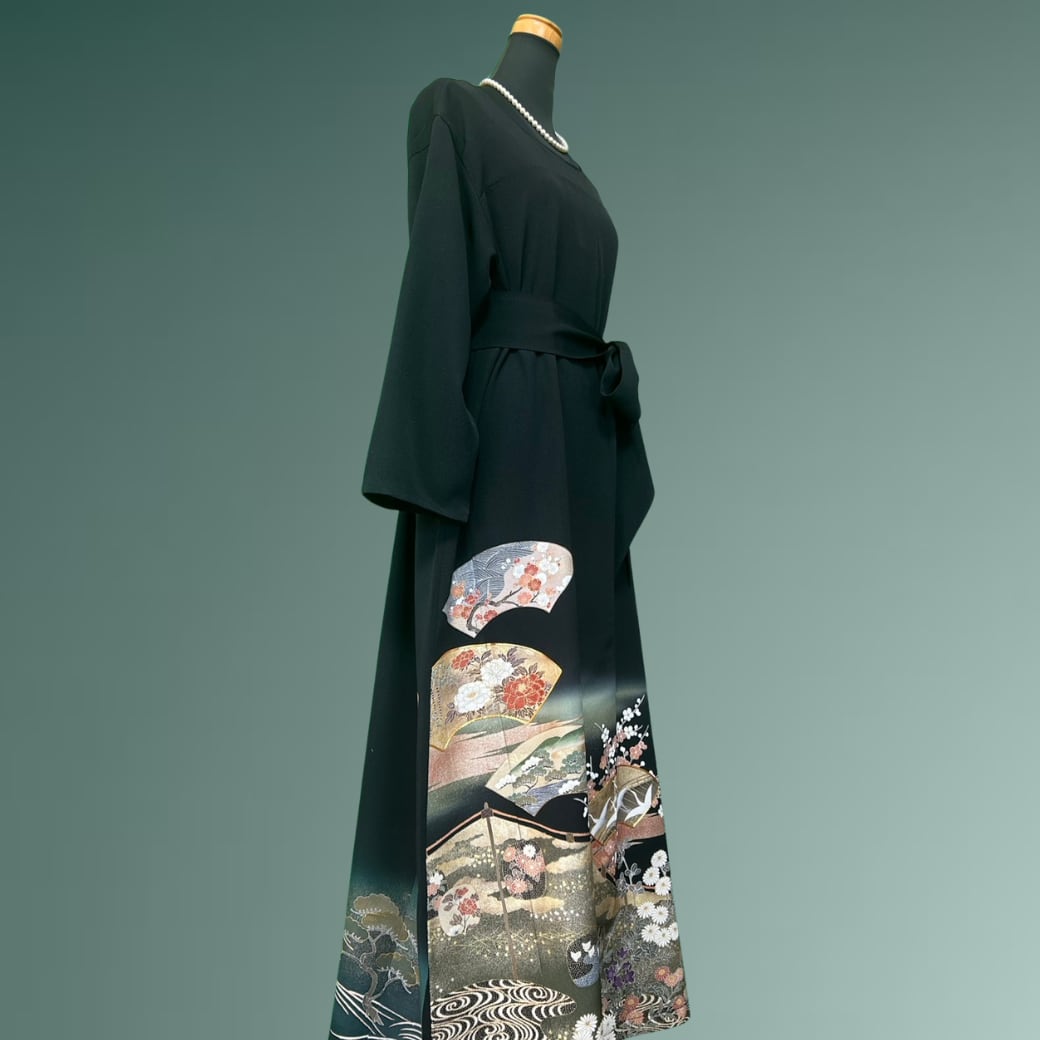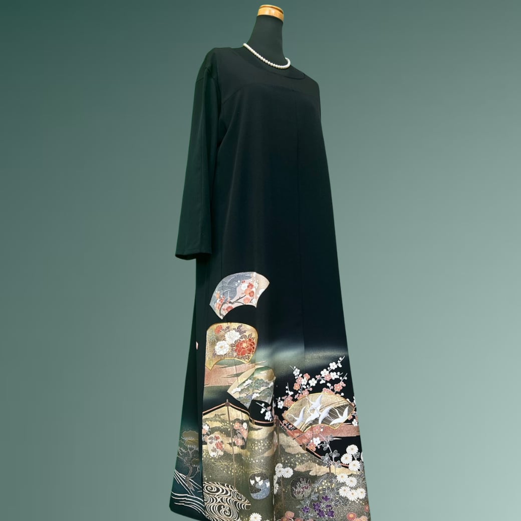 黒留袖 金彩 流水紋 扇面 着物ワンピース