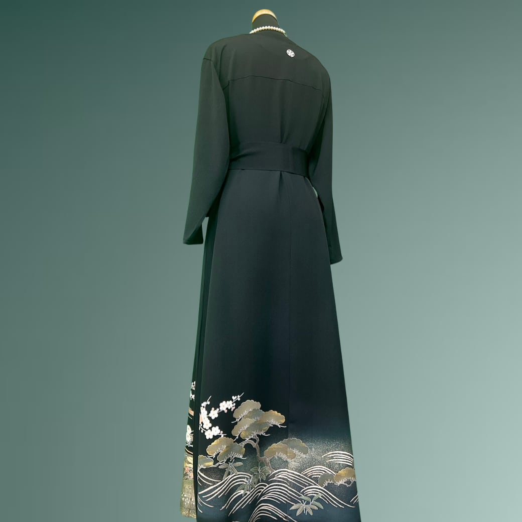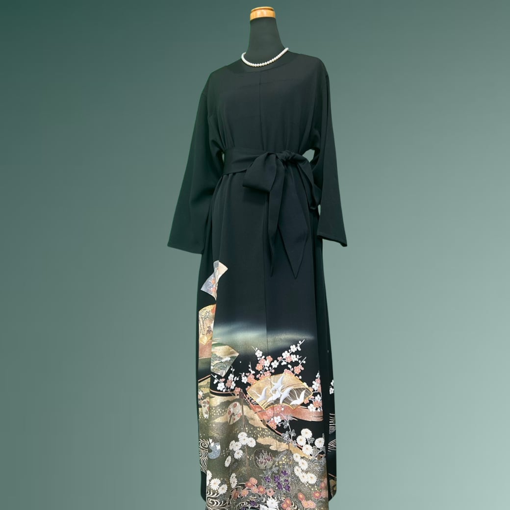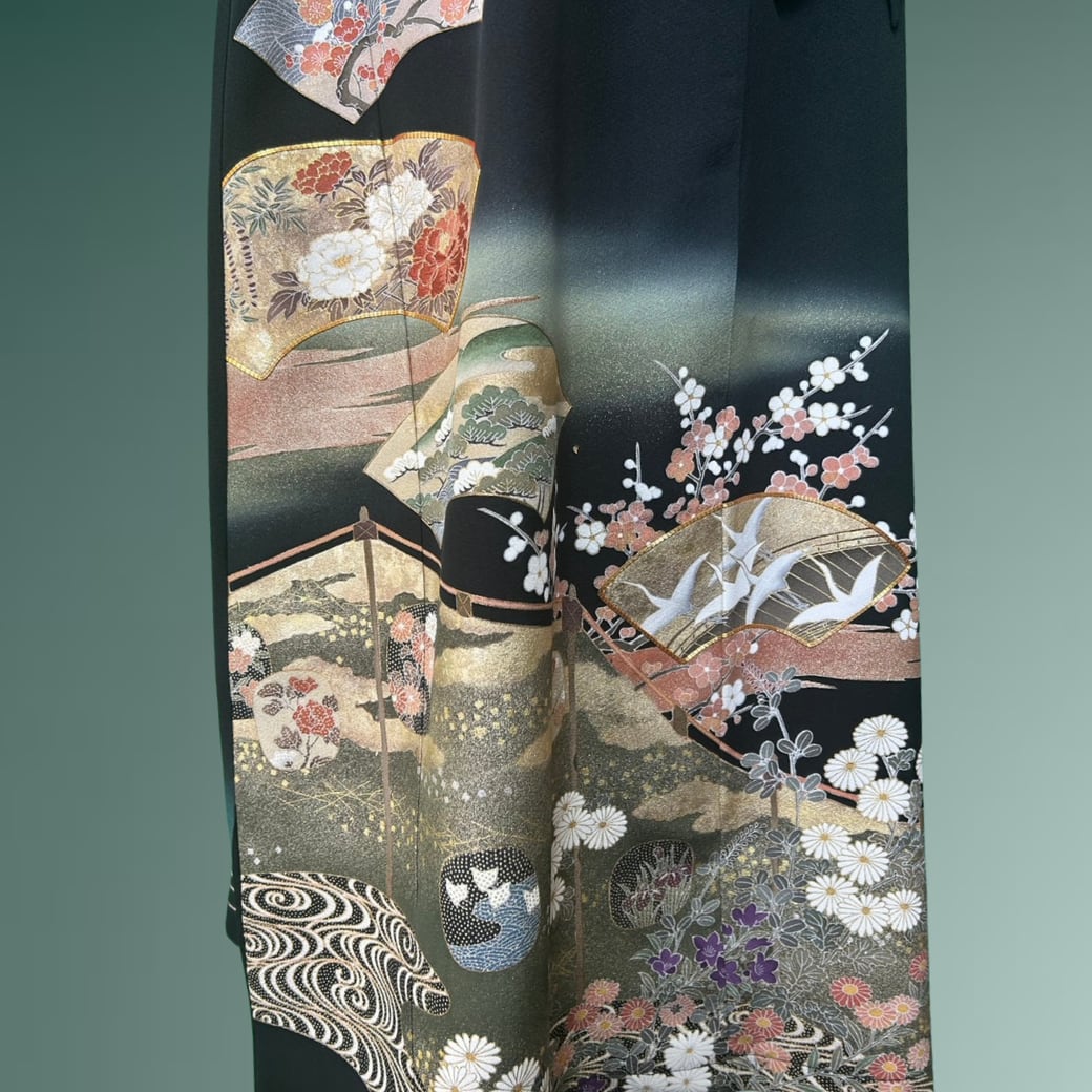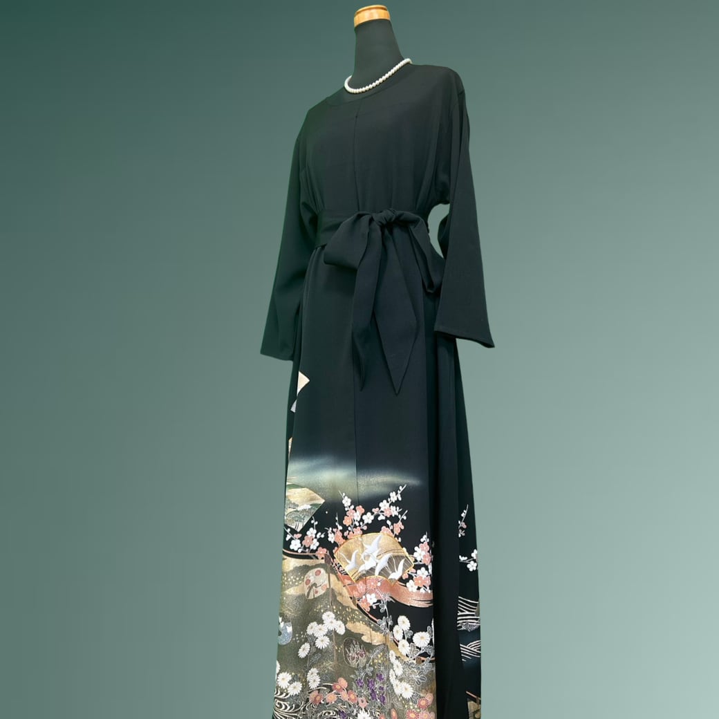 黒留袖 金彩 流水紋 扇面 着物ワンピース