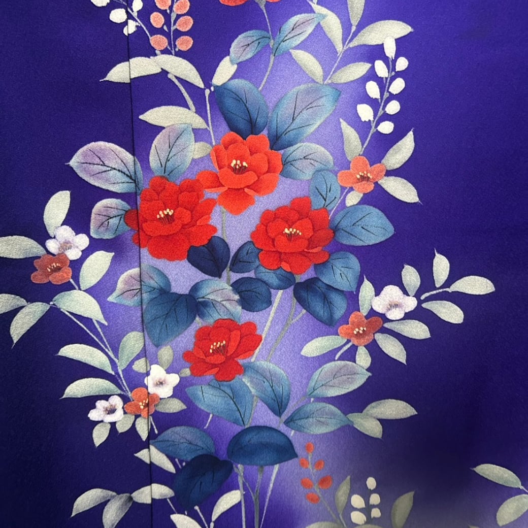 裾に向かって描かれた山茶花と南天の意匠が、