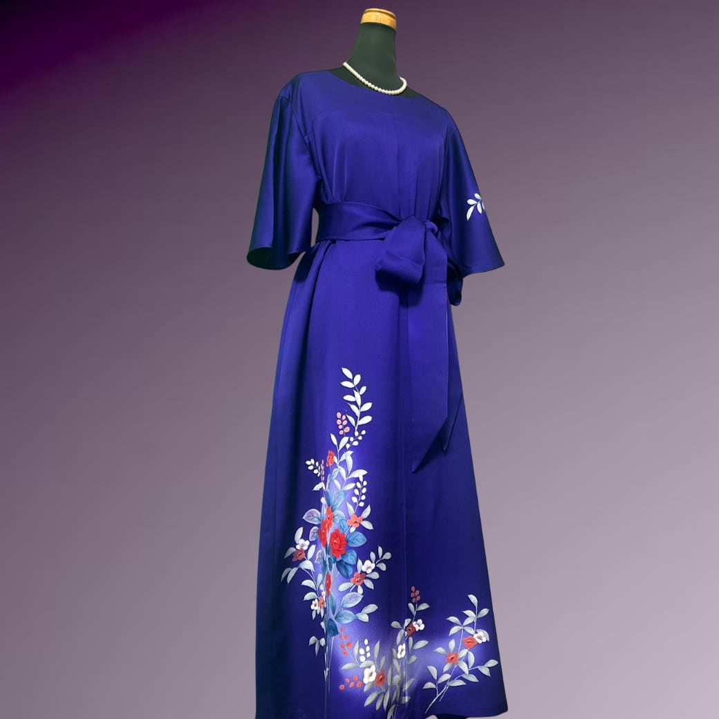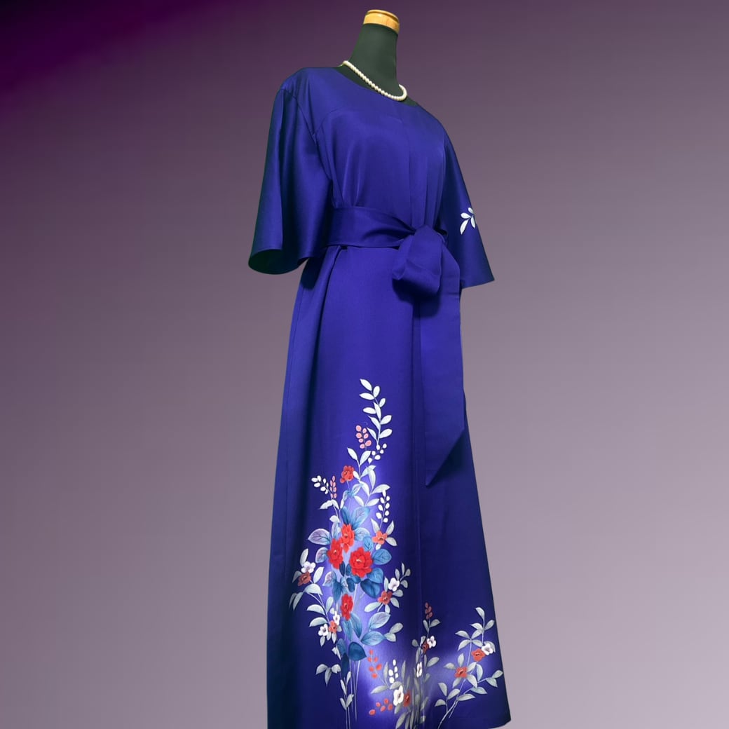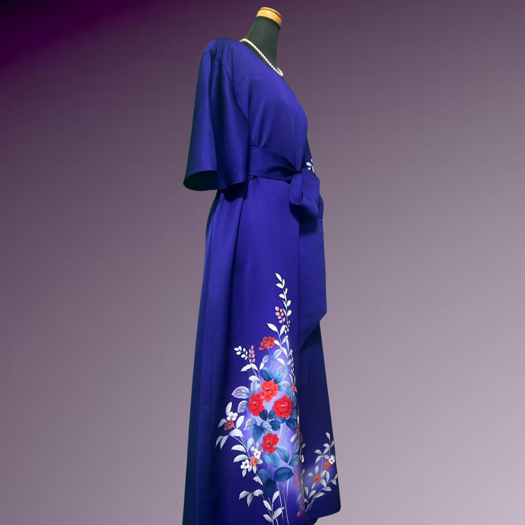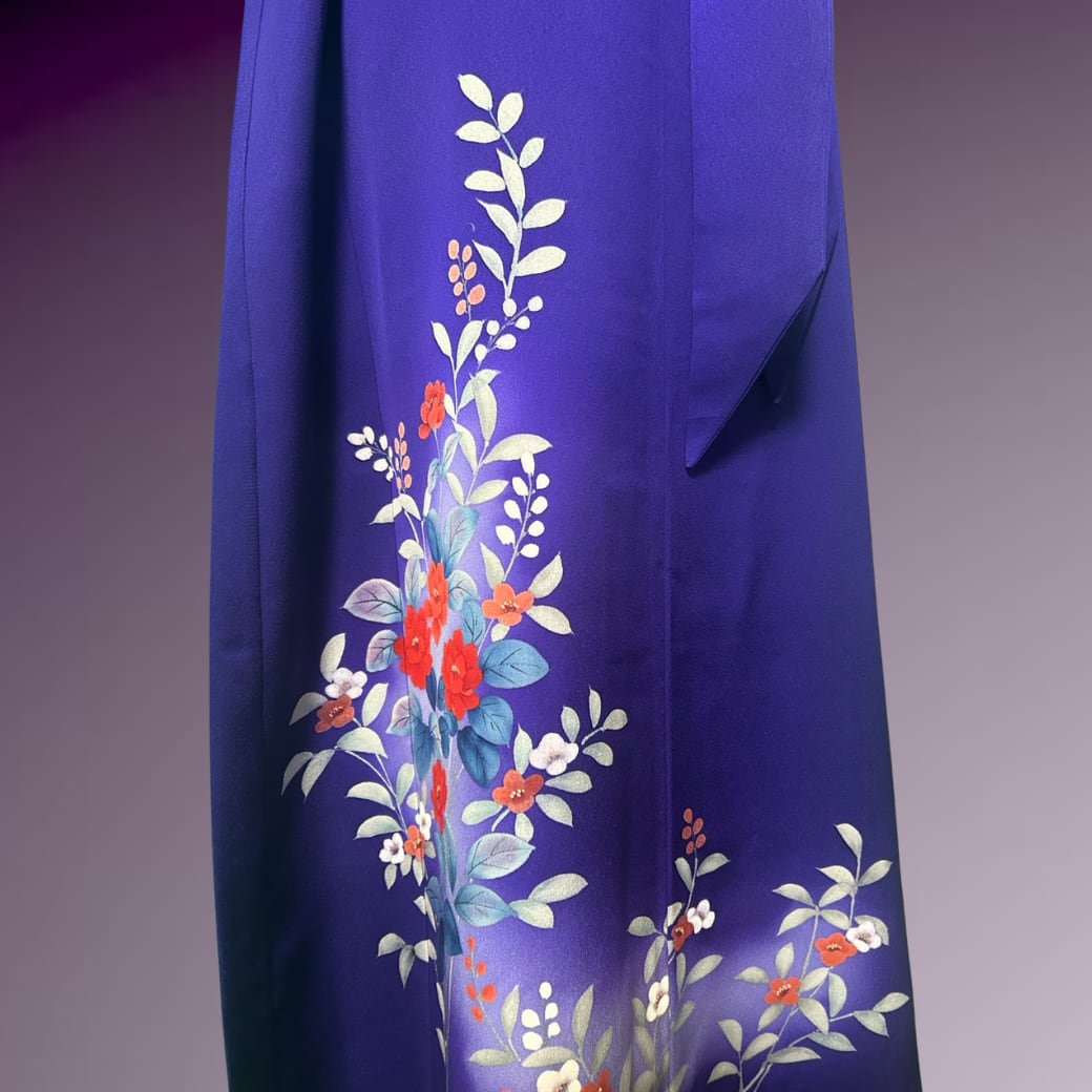 深く澄んだ青紫を地色とした訪問着をもとに仕立てた一着です。