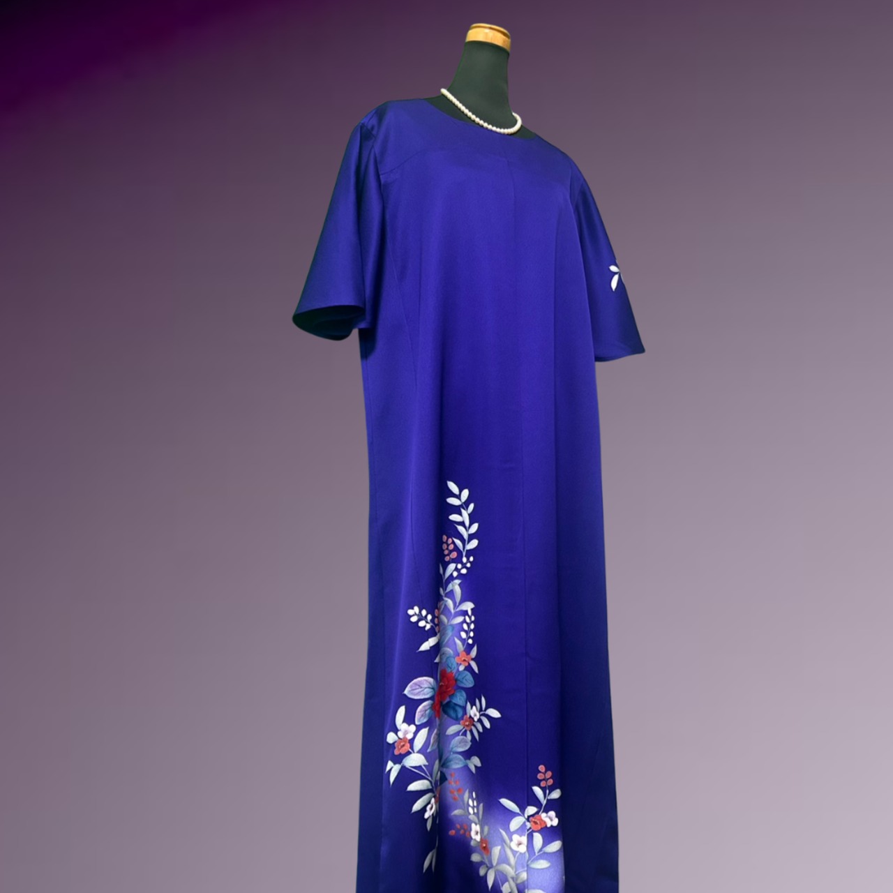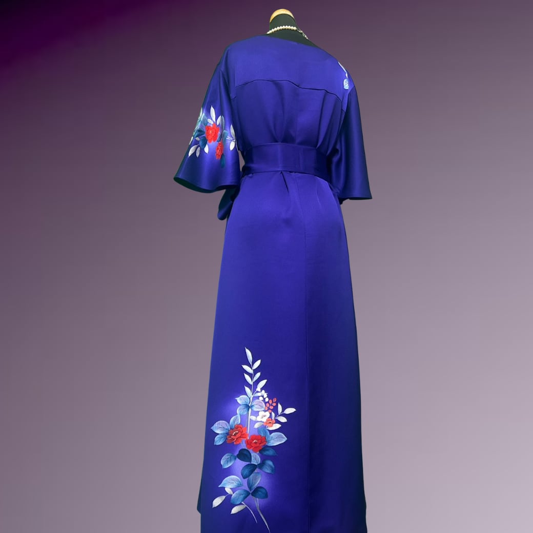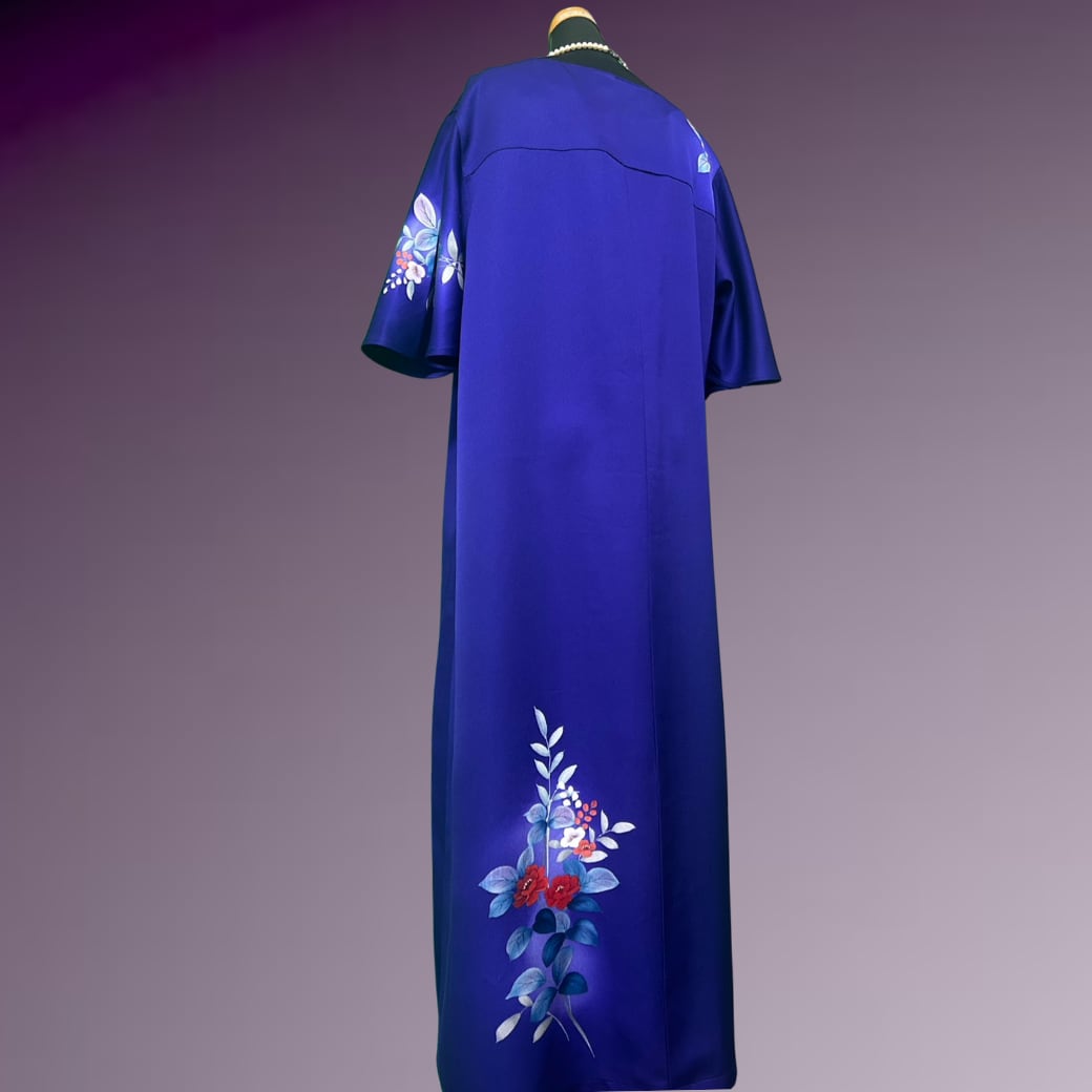 深く澄んだ青紫を地色とした訪問着をもとに仕立てた一着です。