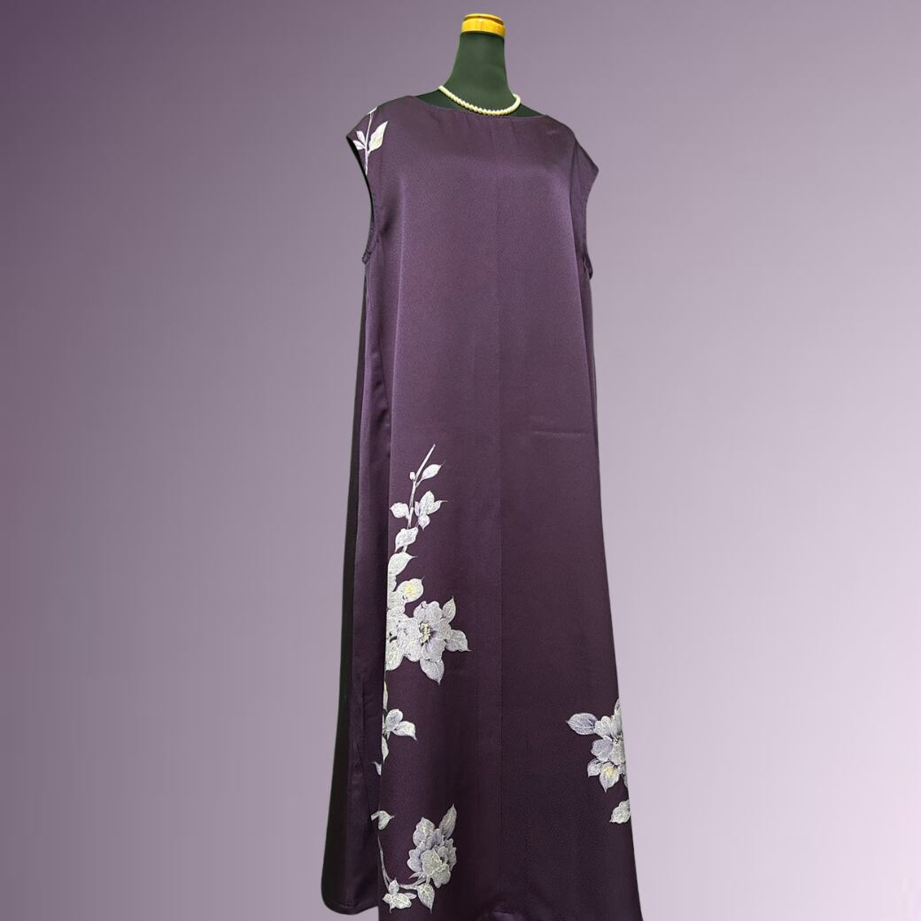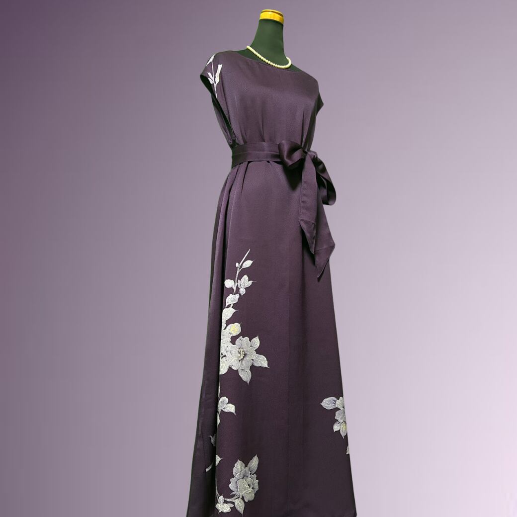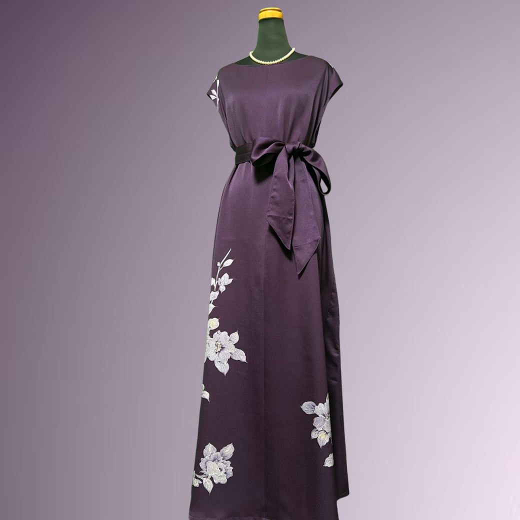 こちらの着物ワンピースは、気品ある紫色の訪問着から仕立てた一着です。