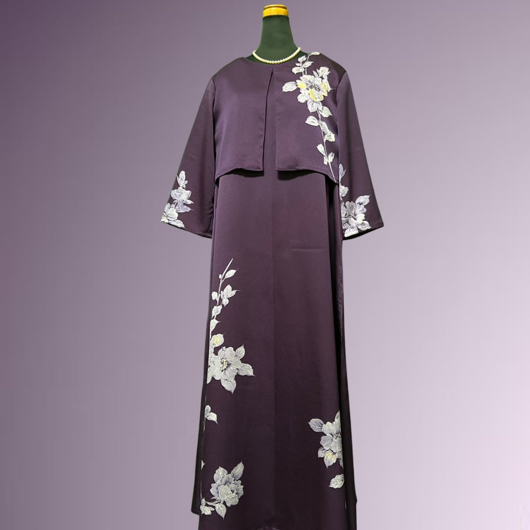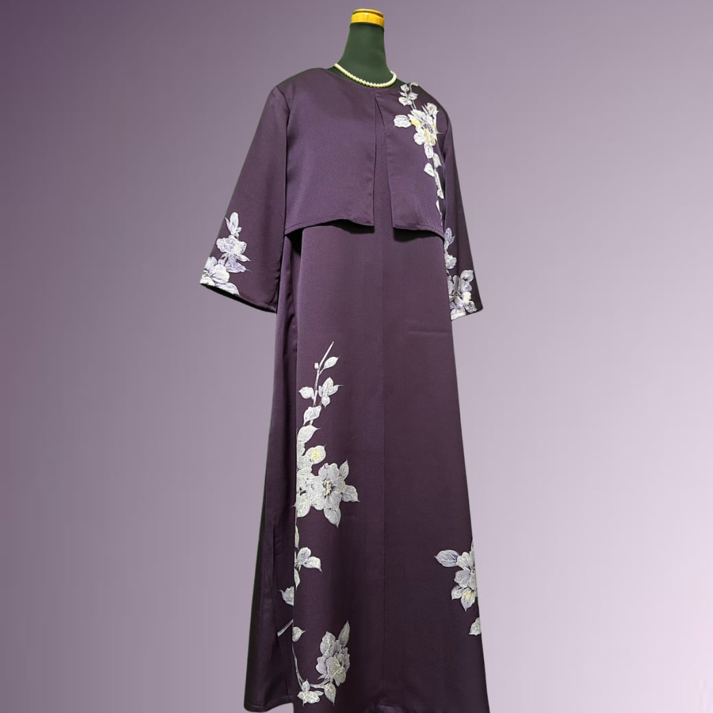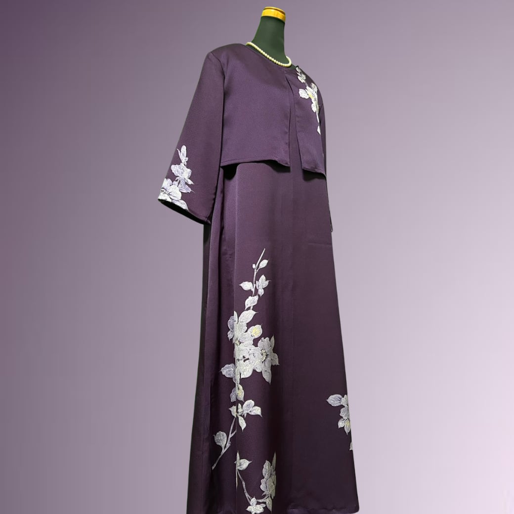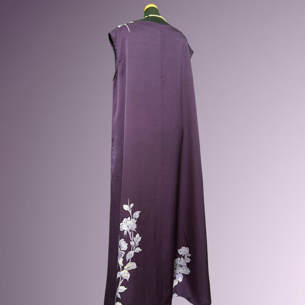 こちらの着物ワンピースは、気品ある紫色の訪問着から仕立てた一着です。
