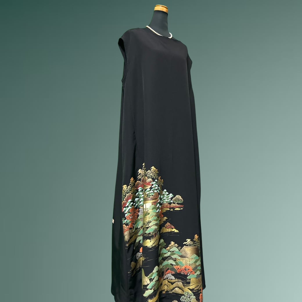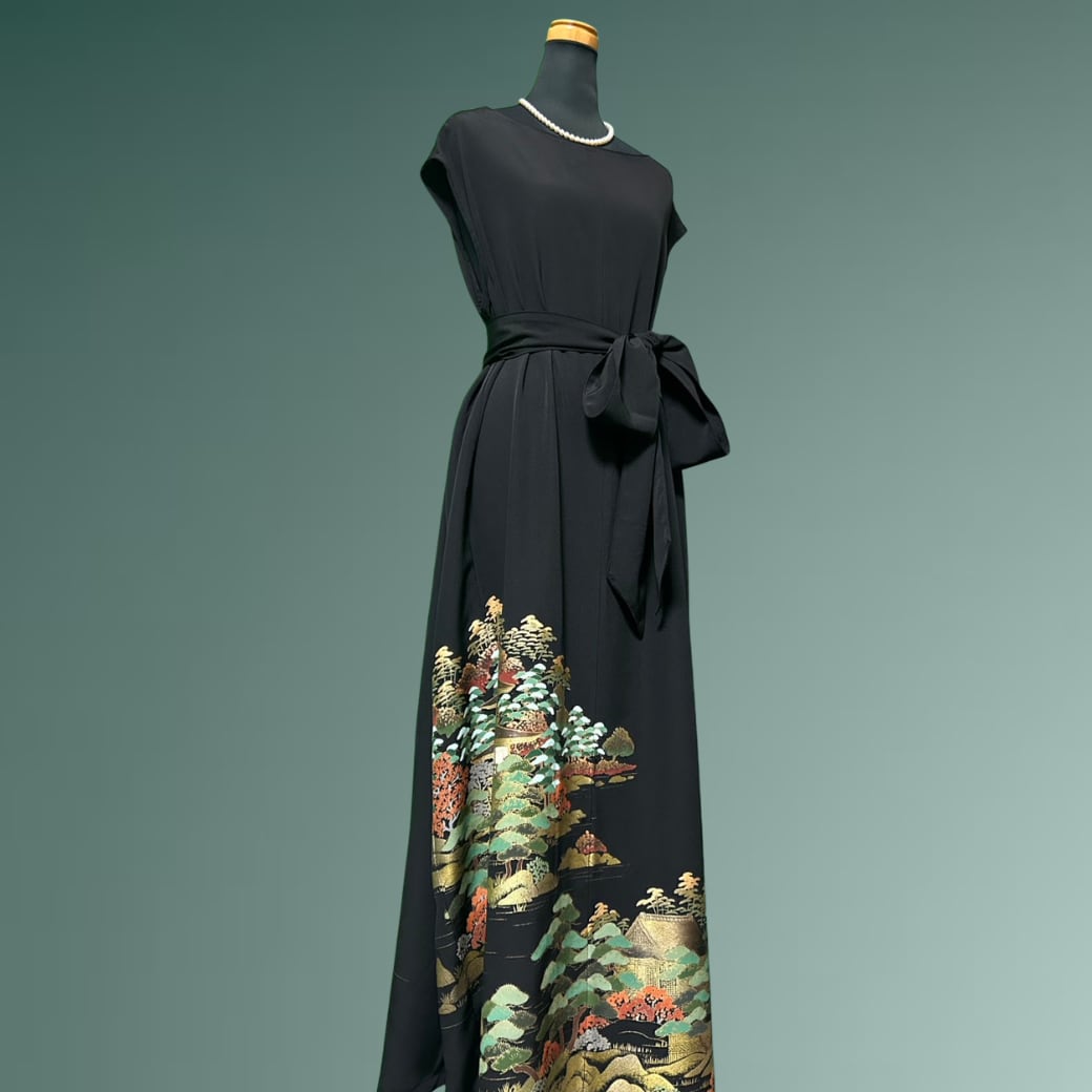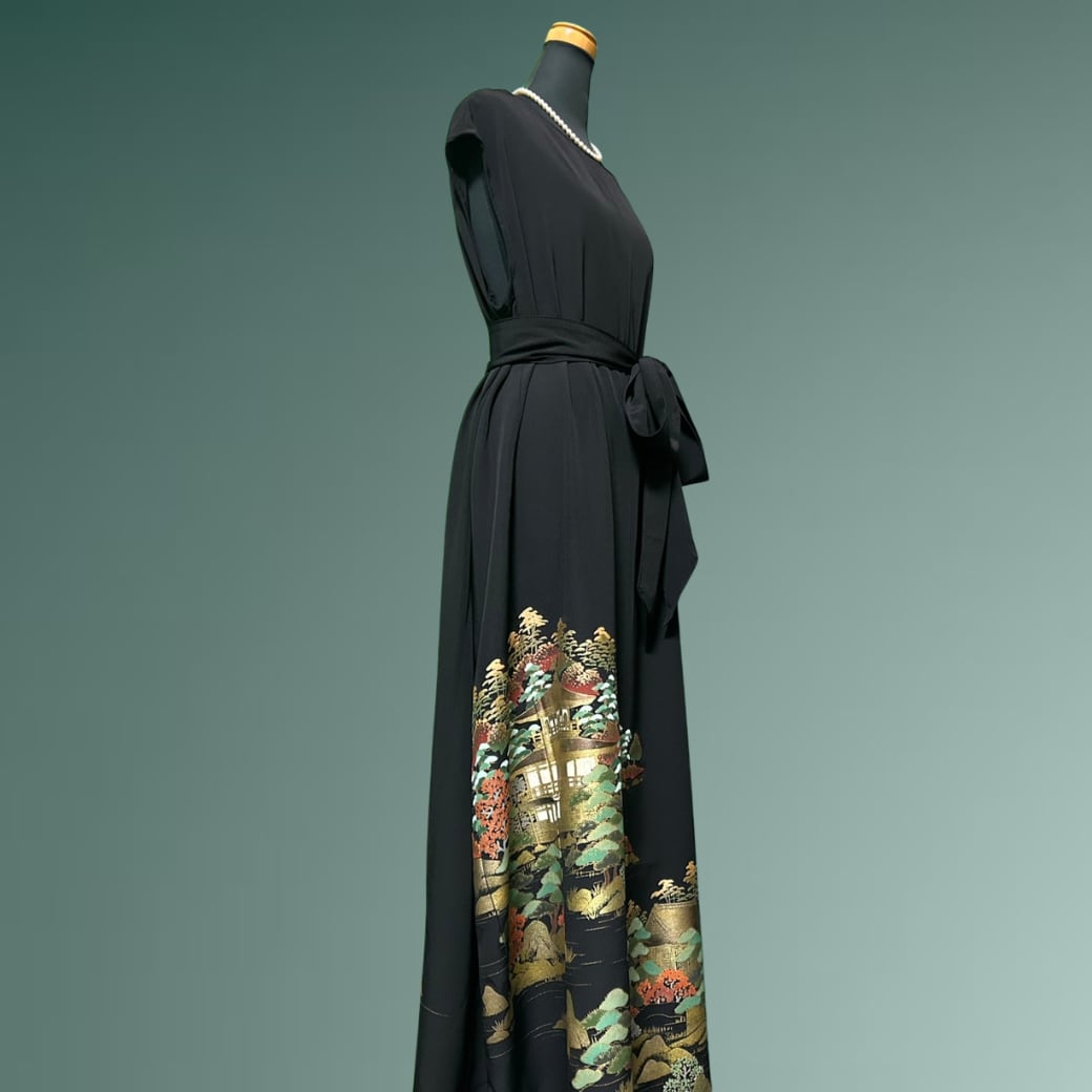 こちらの着物ワンピースは、金彩豊かに描かれた黒留袖から仕立てた一着です。