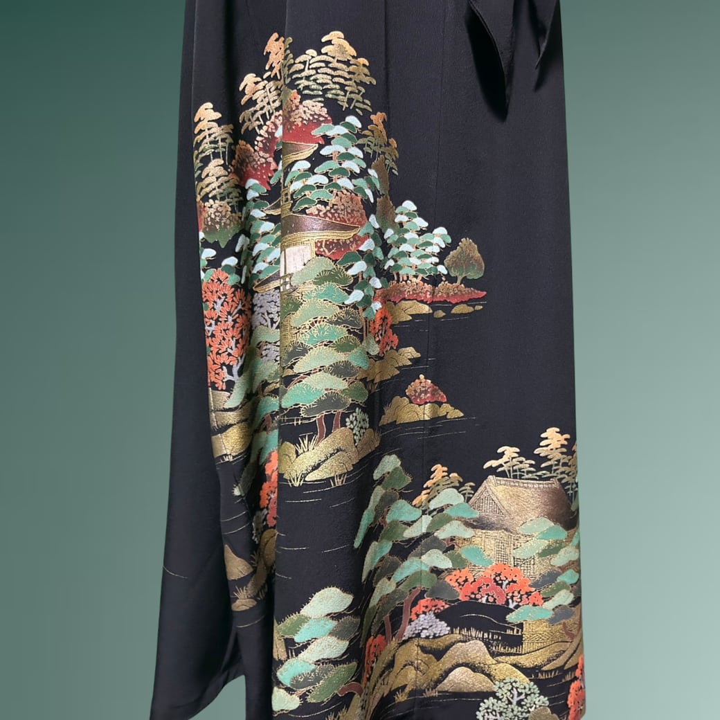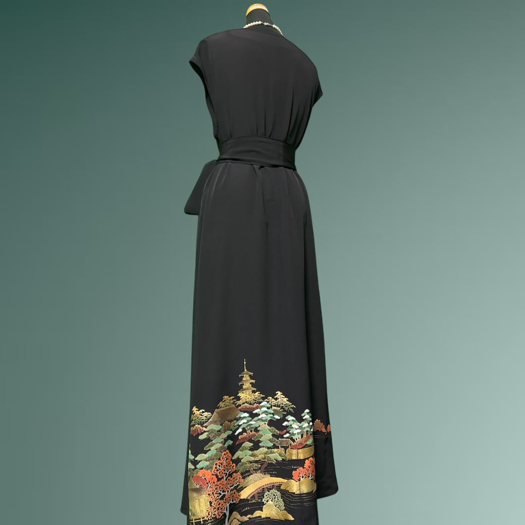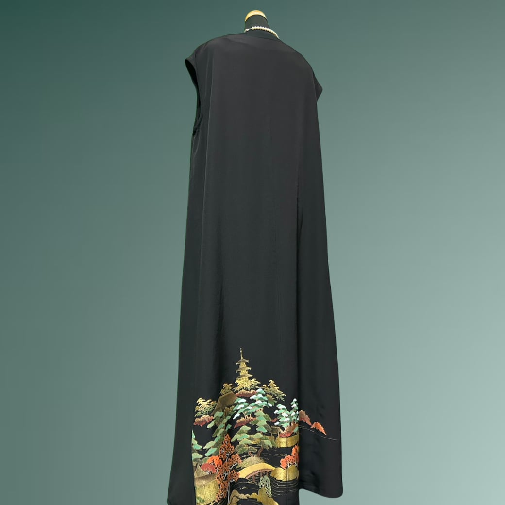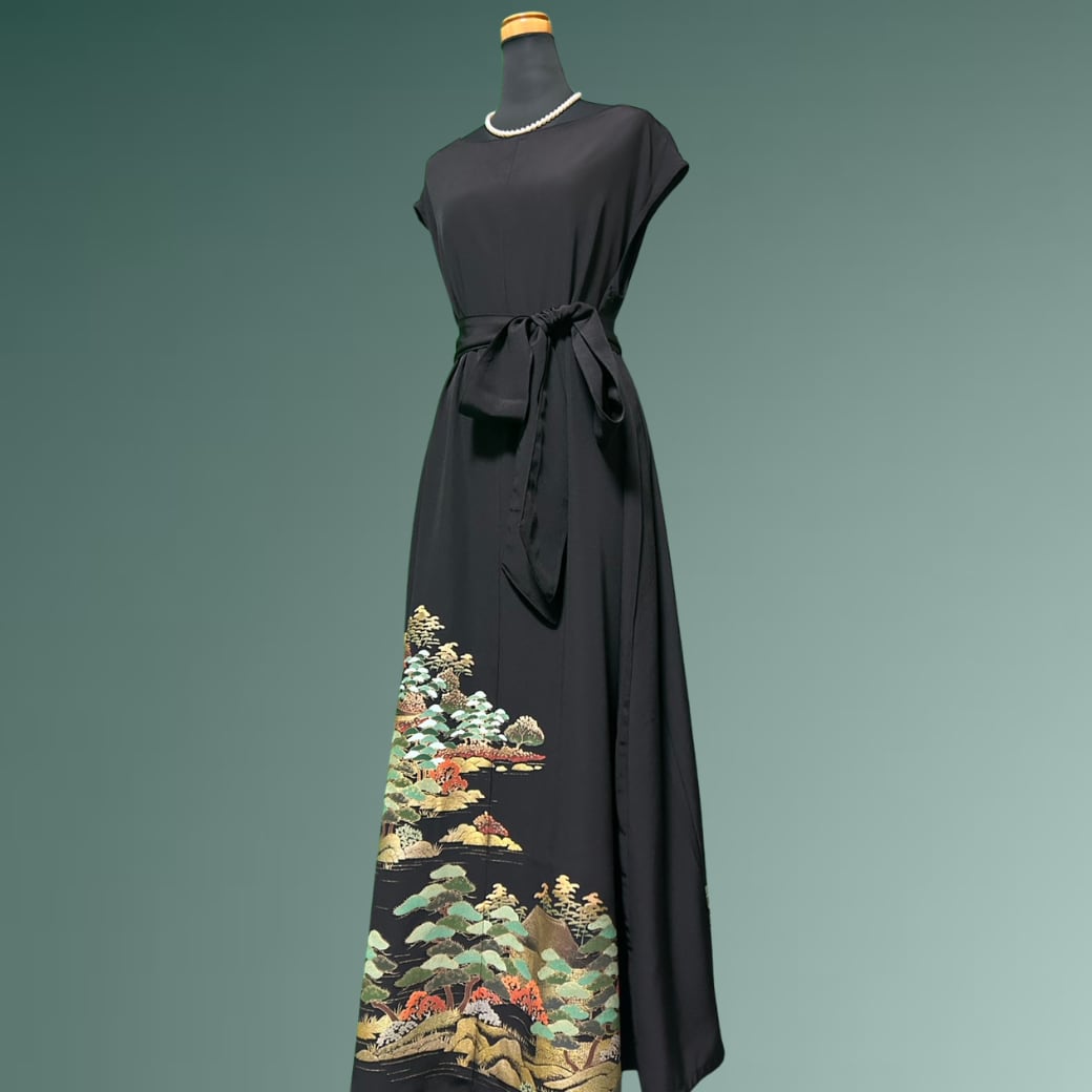 こちらの着物ワンピースは、金彩豊かに描かれた黒留袖から仕立てた一着です。