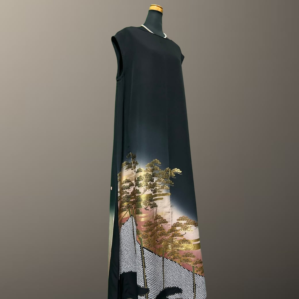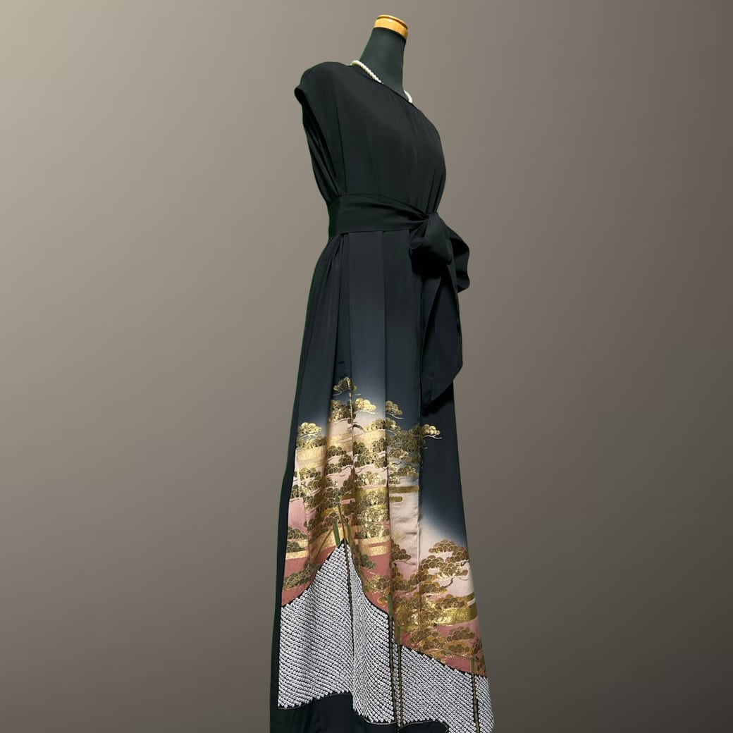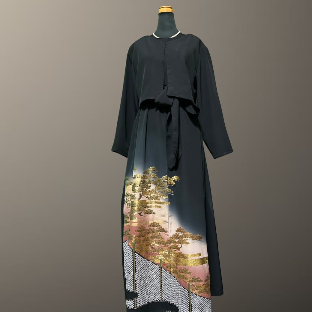 こちらの着物ワンピースは、金彩豊かに描かれた黒留袖から仕立てた一着です。