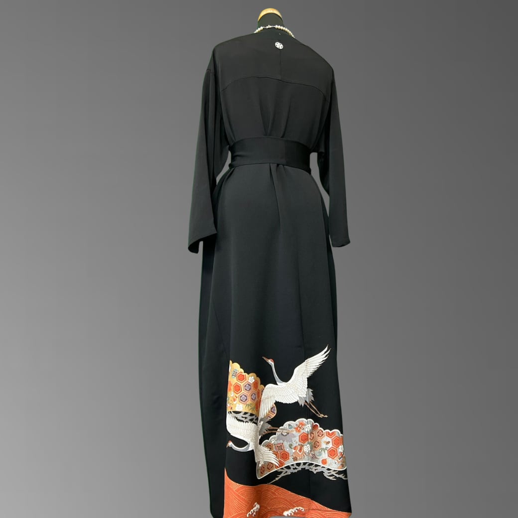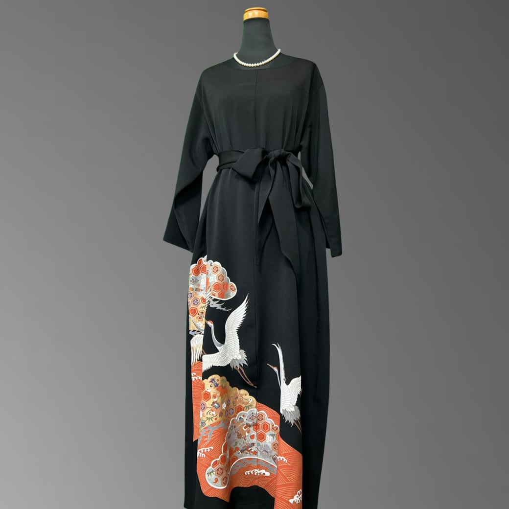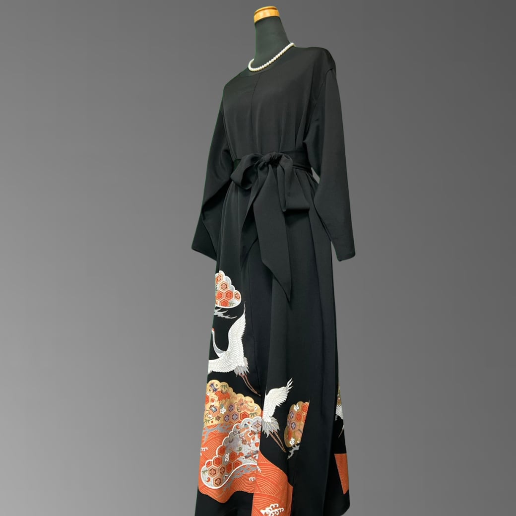 こちらの着物ワンピースは、格式高い黒留袖をもとに仕立てた一着です。