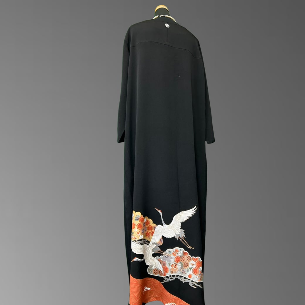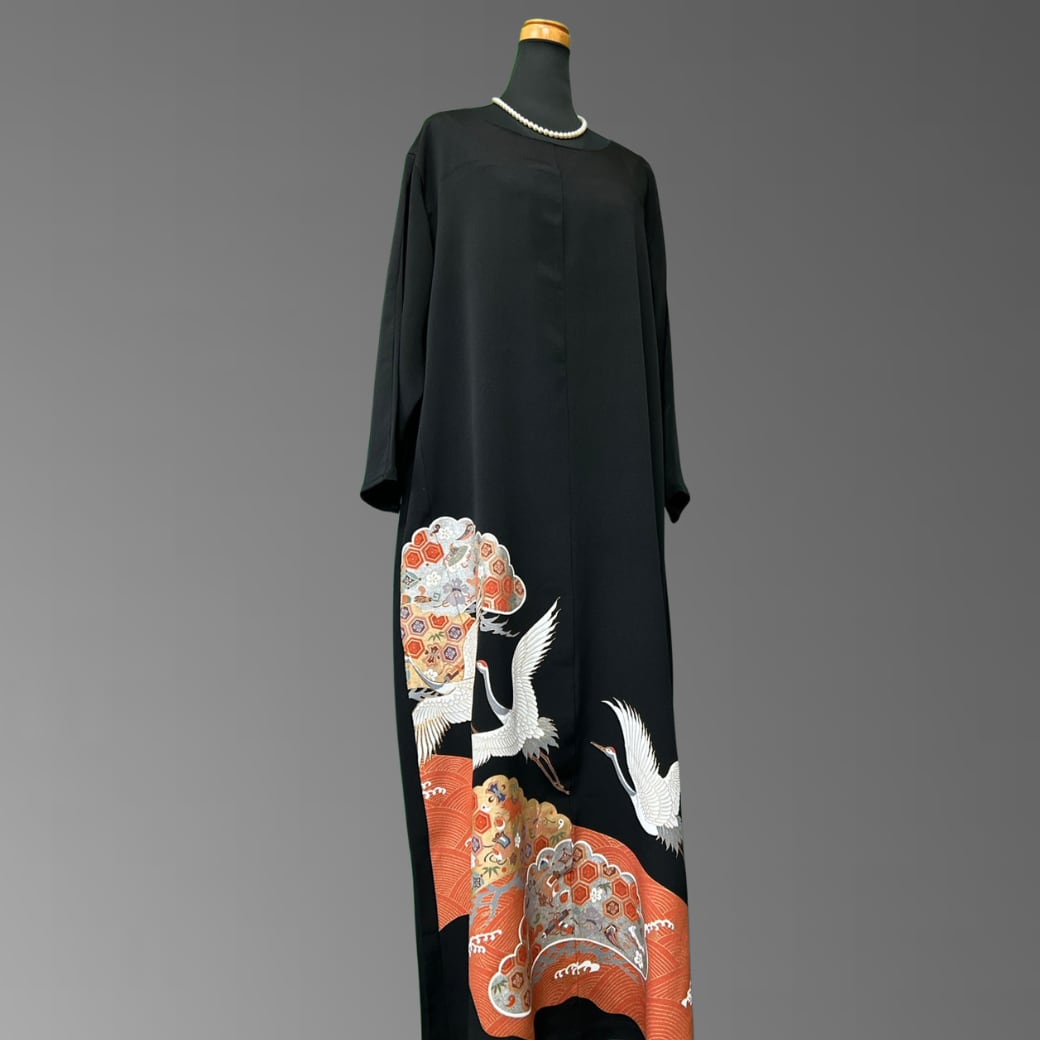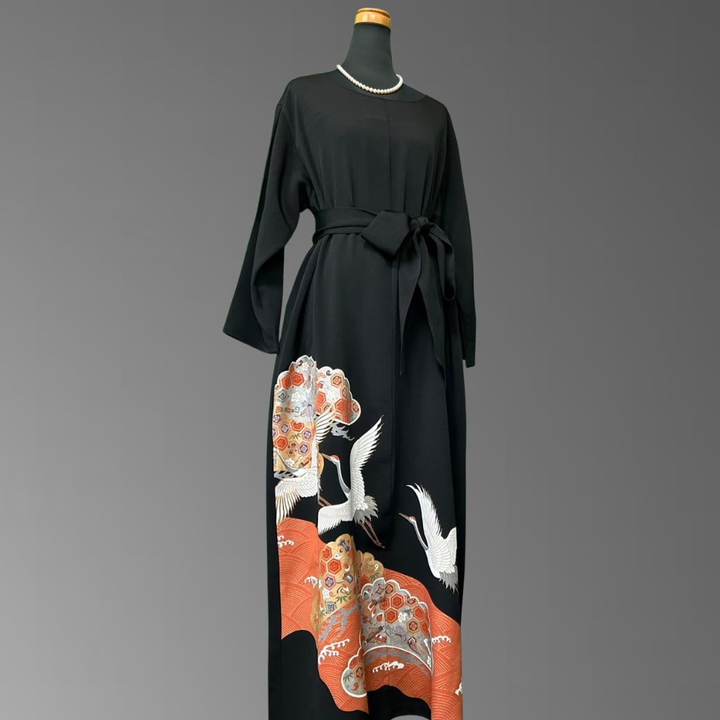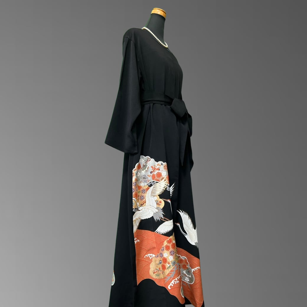 こちらの着物ワンピースは、格式高い黒留袖をもとに仕立てた一着です。