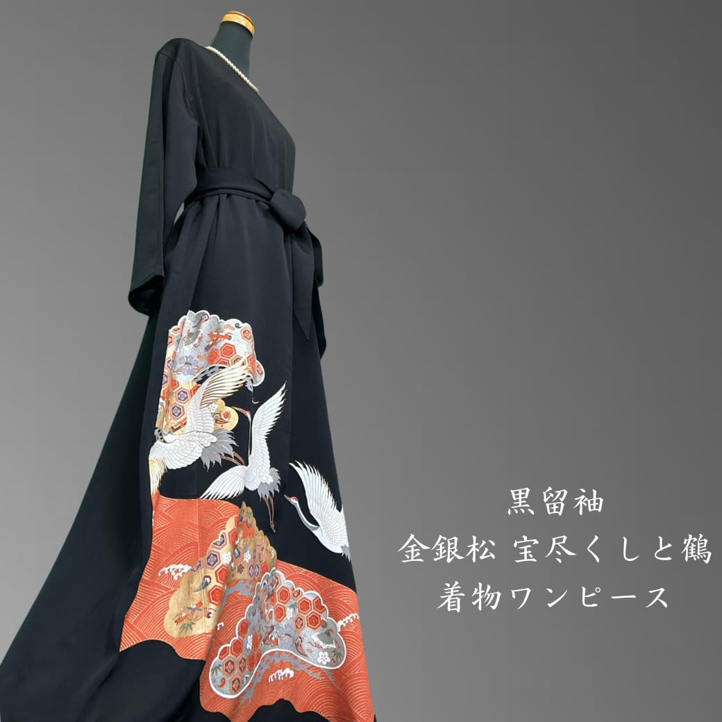 黒留袖 金銀松 宝尽くしと鶴 着物ワンピース