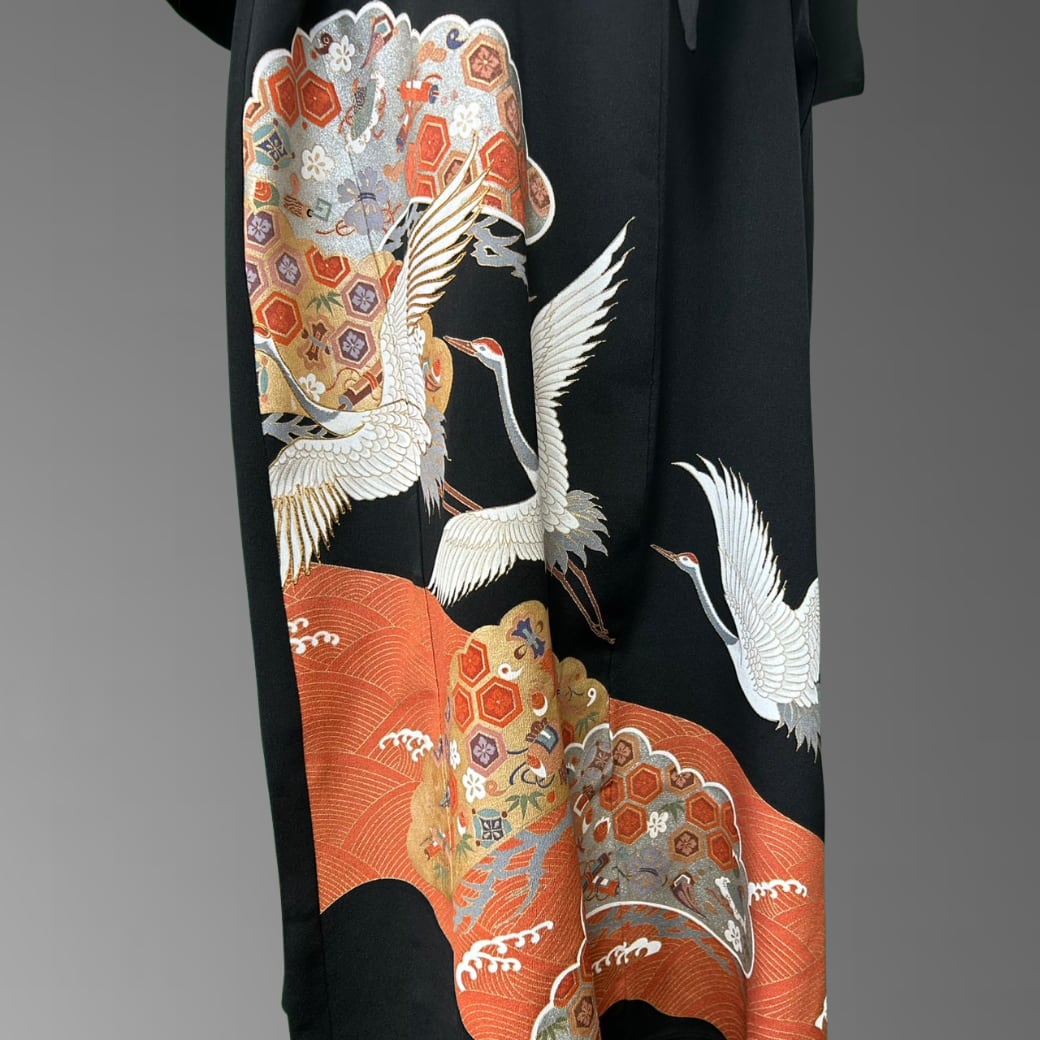 動くたびに鶴が舞い上がるように見え、静かな黒の中に華やかな物語が立ち上がります。