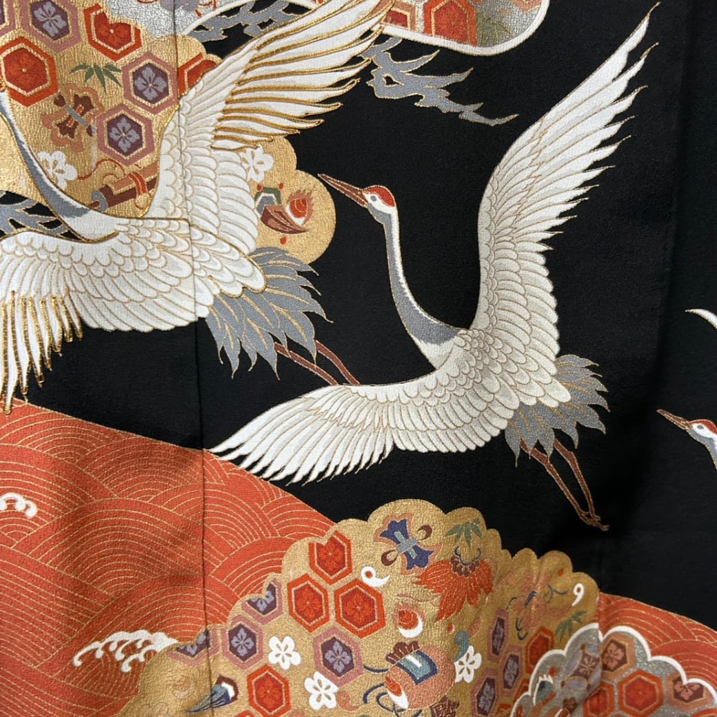 深い黒地に、優雅に舞う鶴と、金銀の松、そして宝尽くし文様が描かれた、祝意に満ちた構図が印象的です。