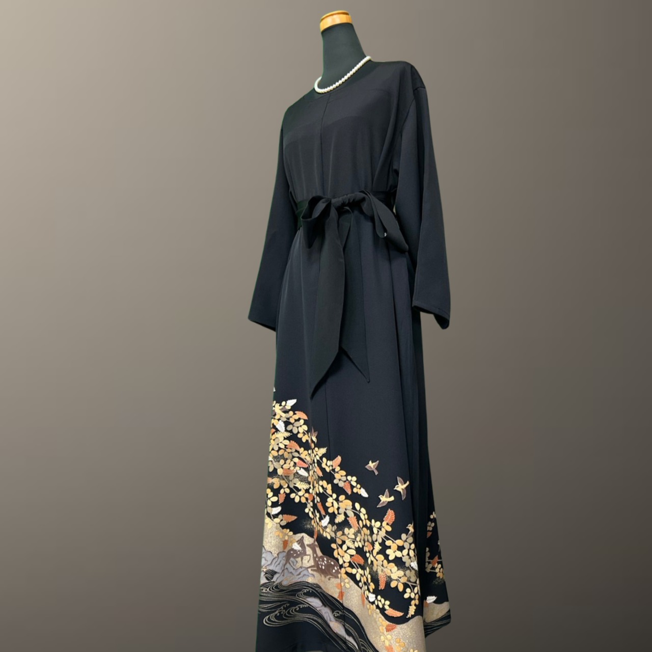 黒留袖 金彩 鹿と駒繋 着物ワンピース