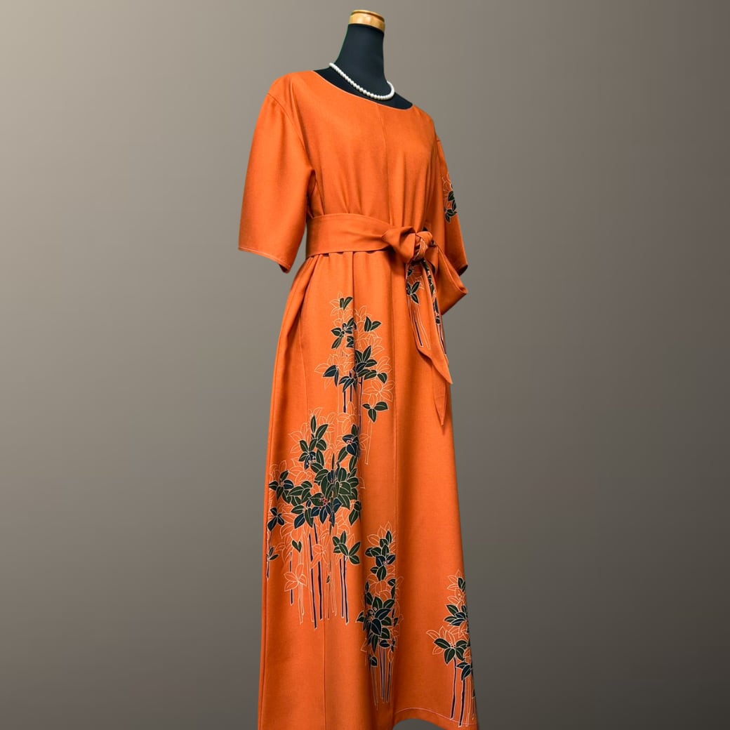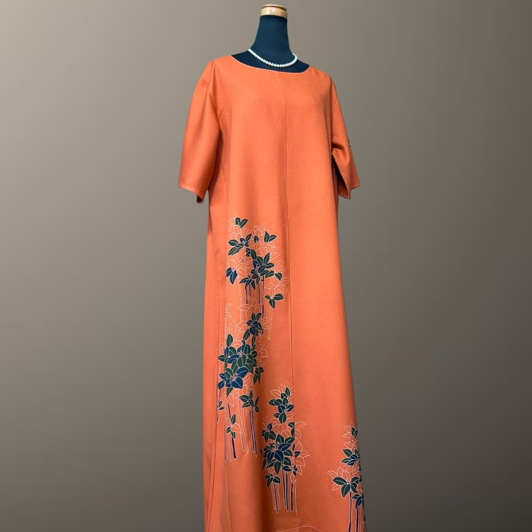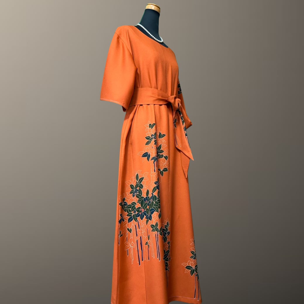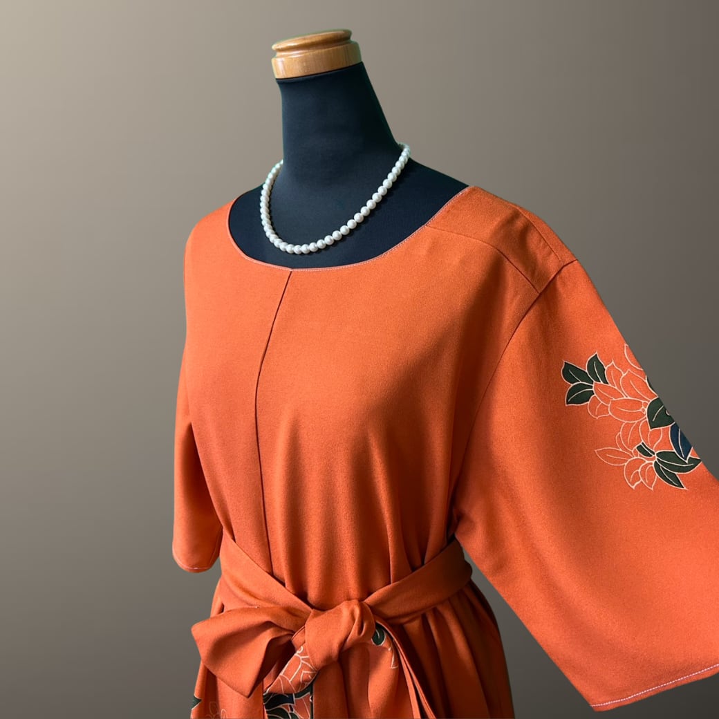 こちらの着物ワンピースは、鮮やかな橙色が印象的な訪問着をもとに仕立てた一着です。