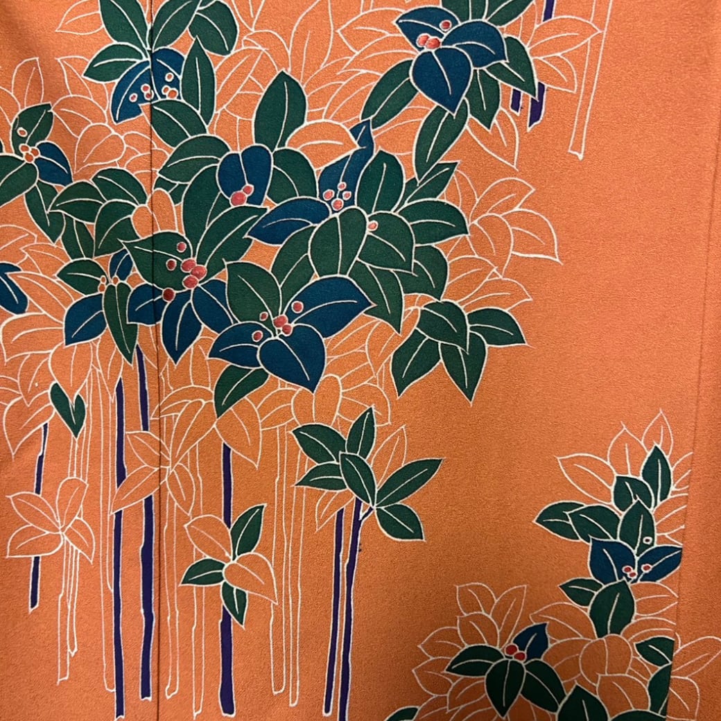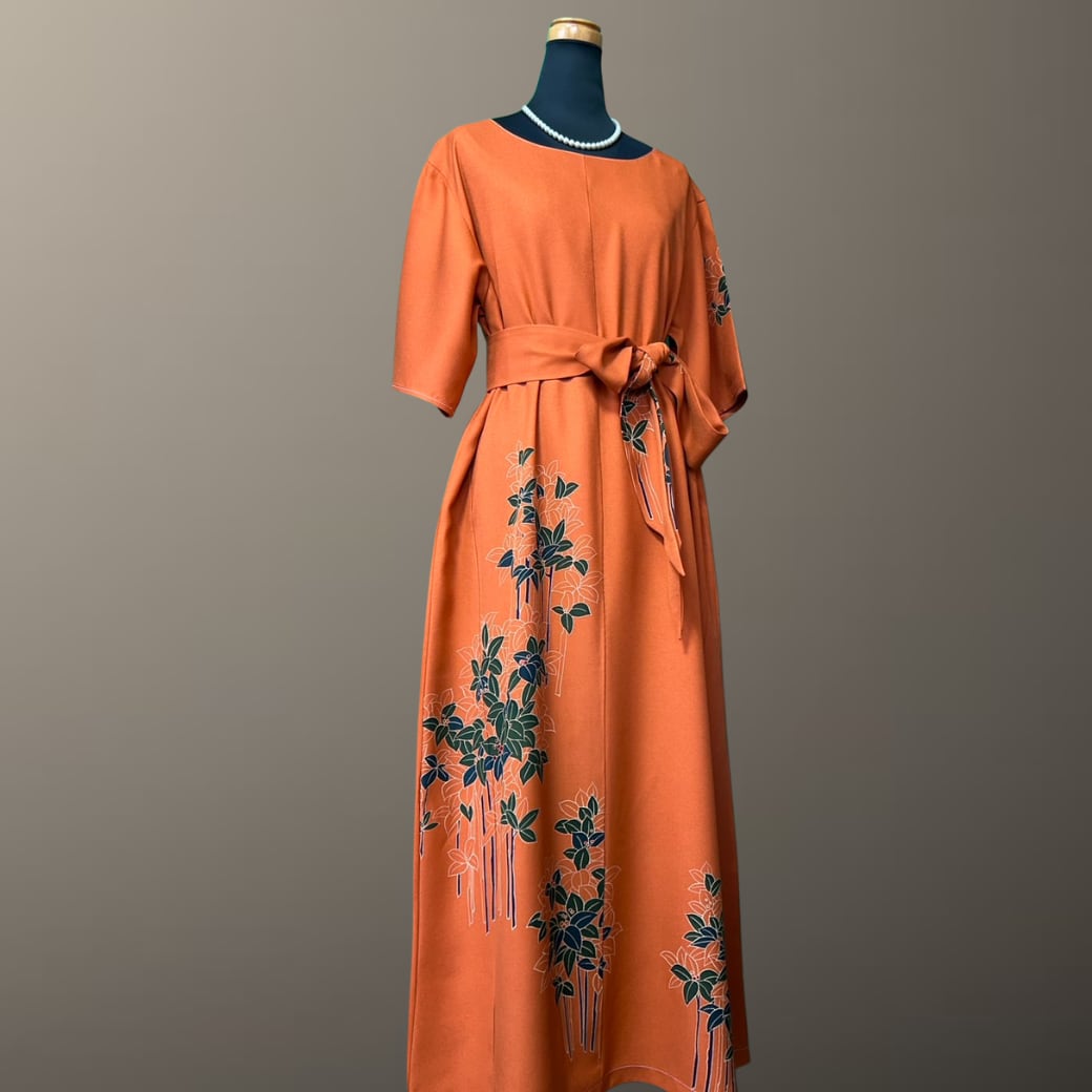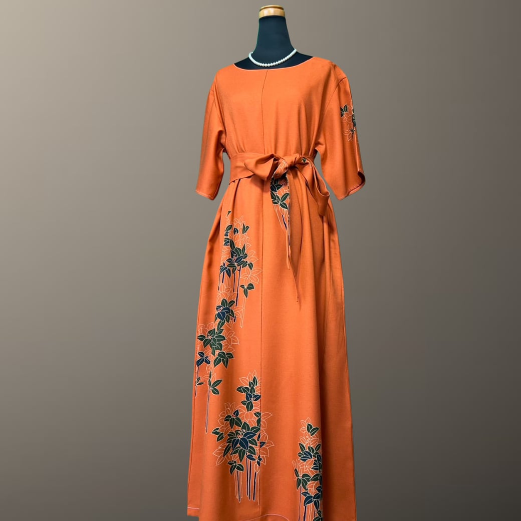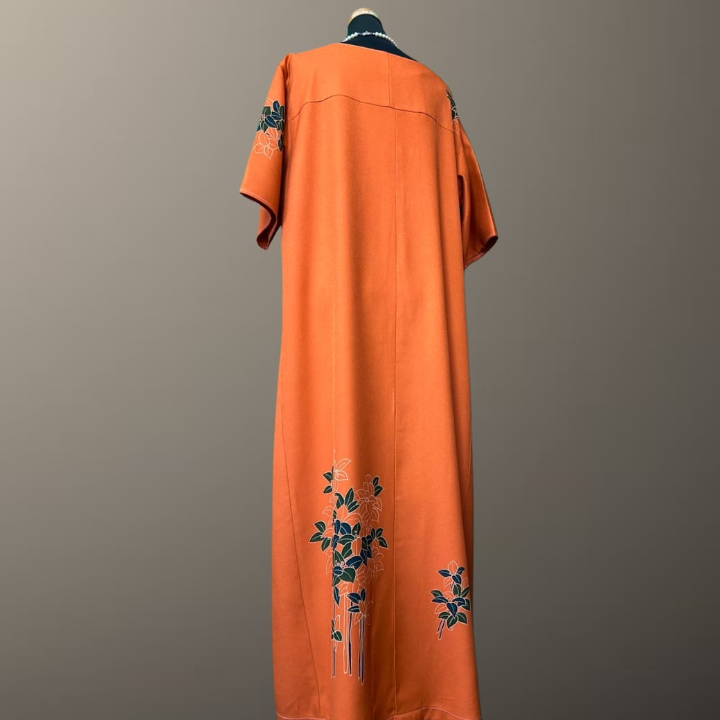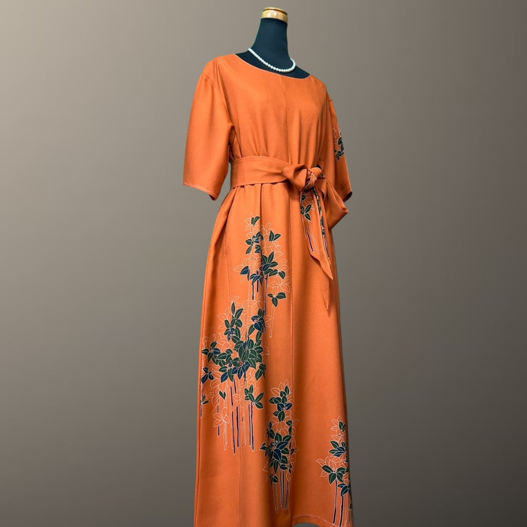 こちらの着物ワンピースは、鮮やかな橙色が印象的な訪問着をもとに仕立てた一着です。