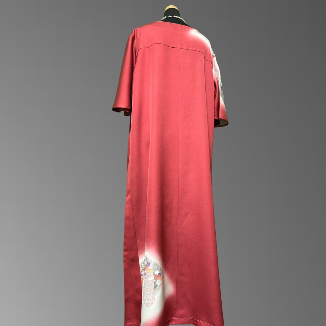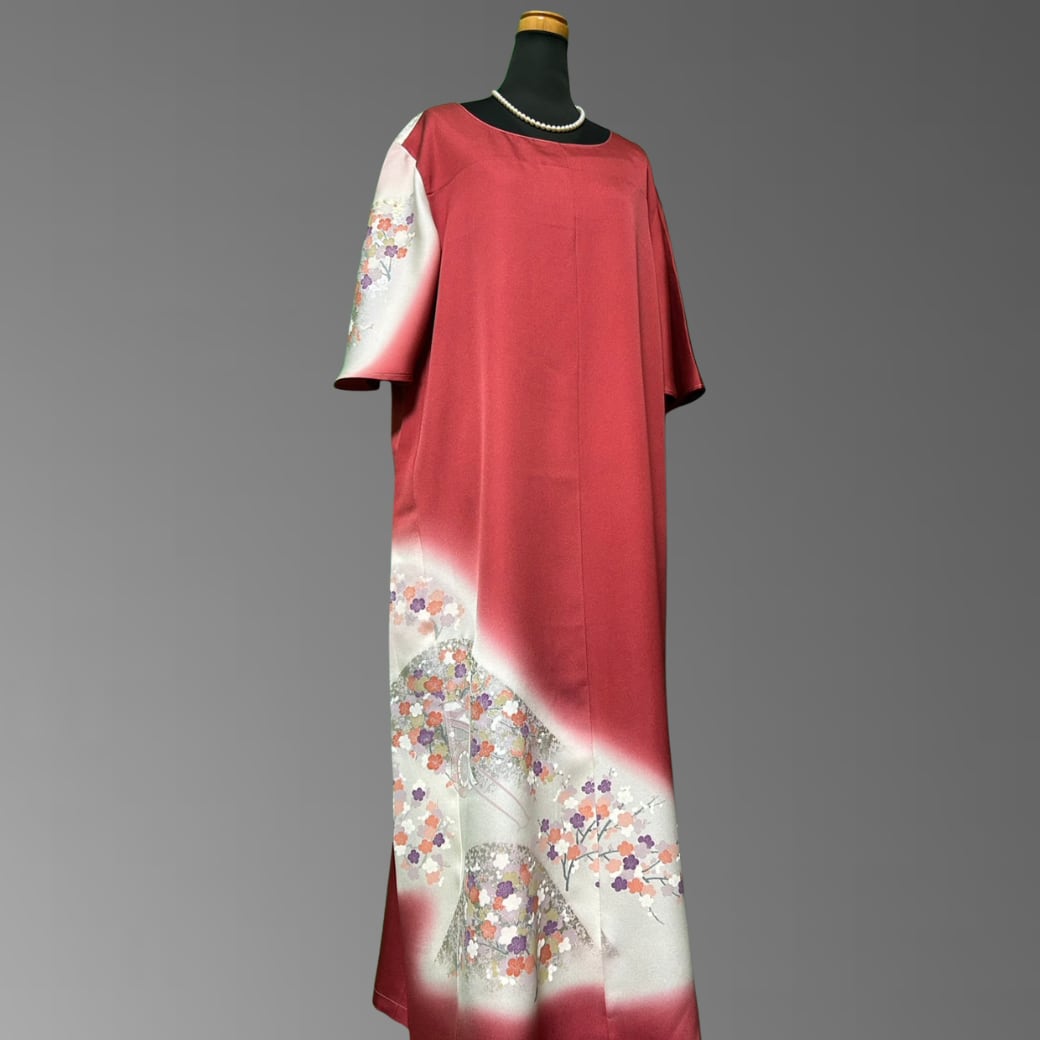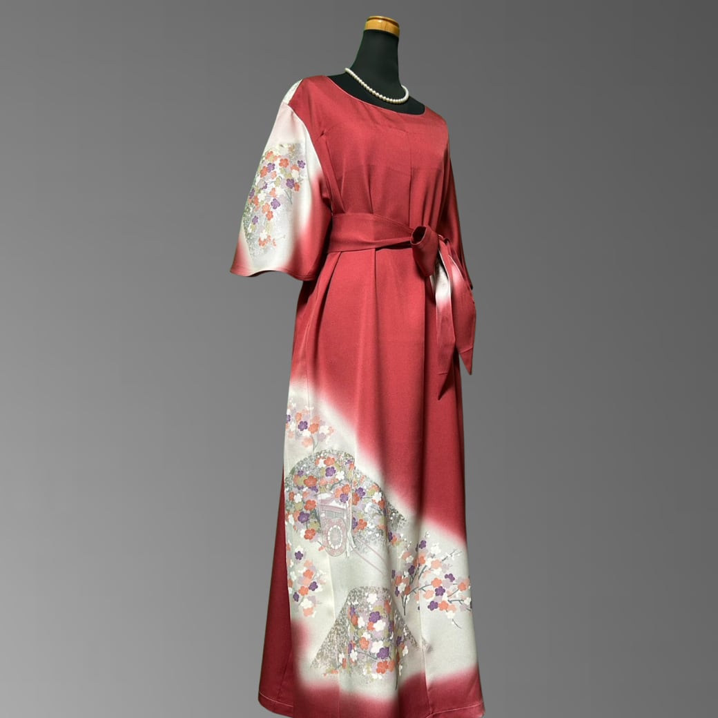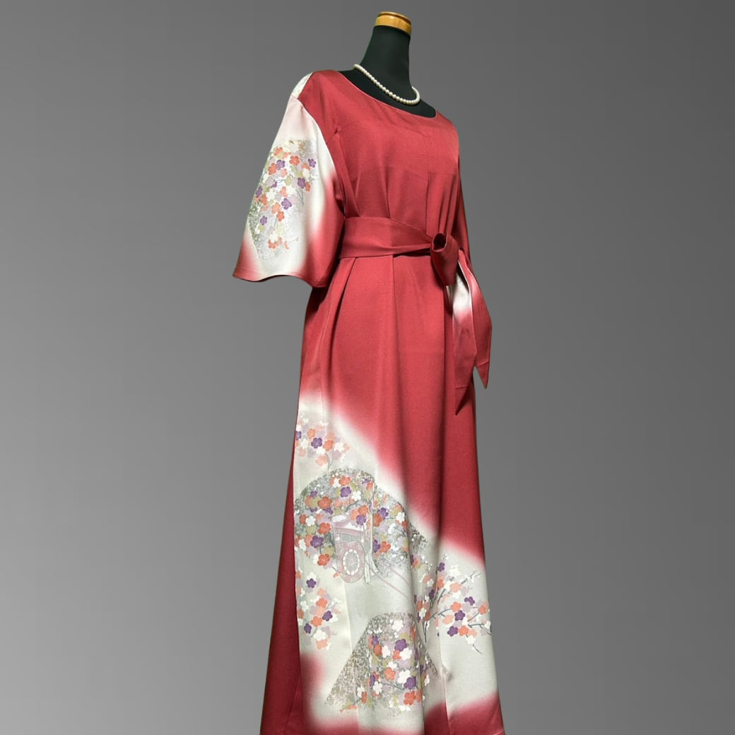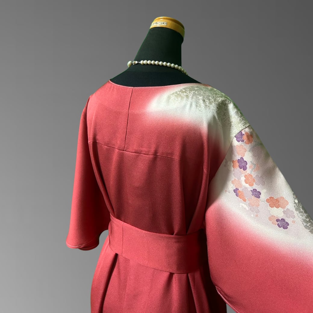 こちらの着物ワンピースは、やわらかな紅から白へと移ろう美しい暈し染めの訪問着をもとに仕立てた一着です。