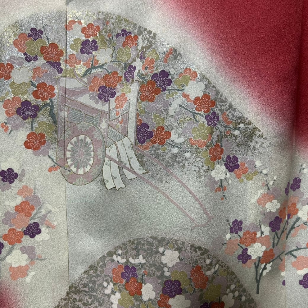 凛とした赤の地色の中に、上品に描かれた御所車と梅の意匠が広がり、華やかさと気品をあわせ持つ佇まいを生み出しています。