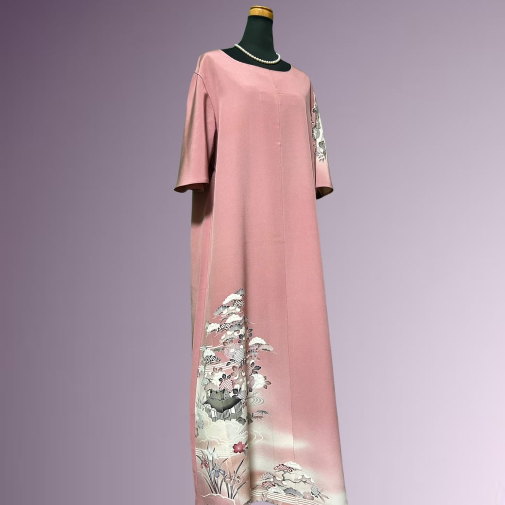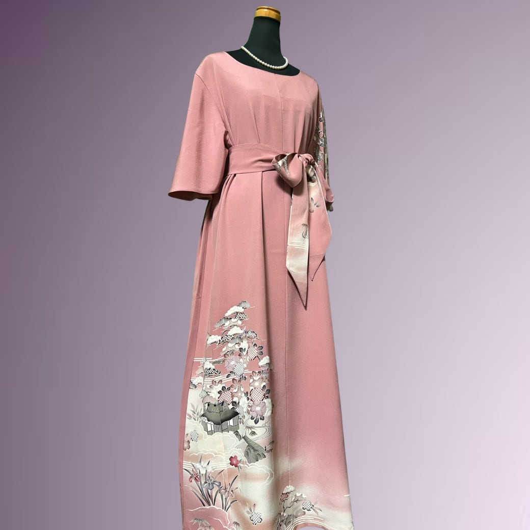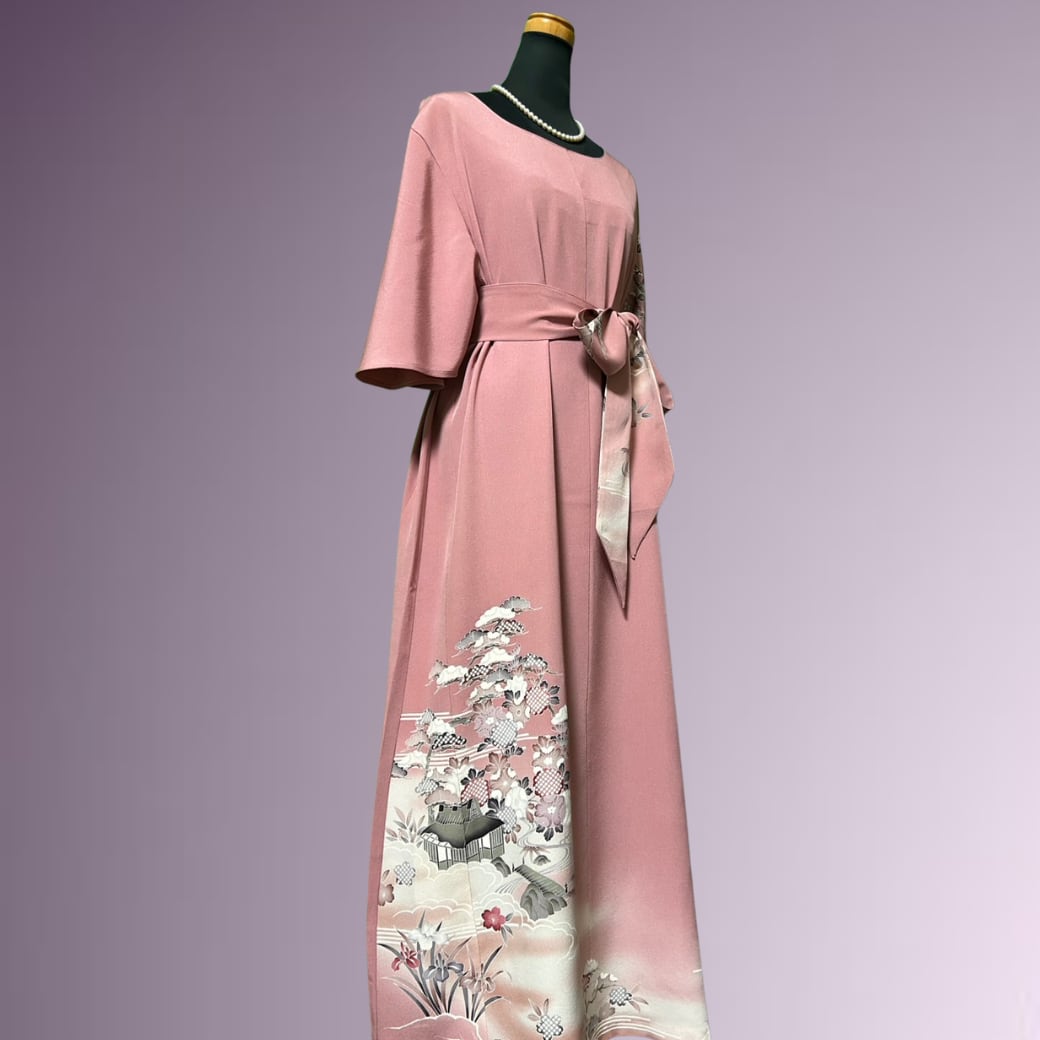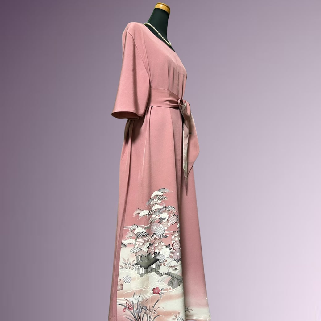 こちらの着物ワンピースは、やわらかな桜色の訪問着をもとに仕立てた一着です。