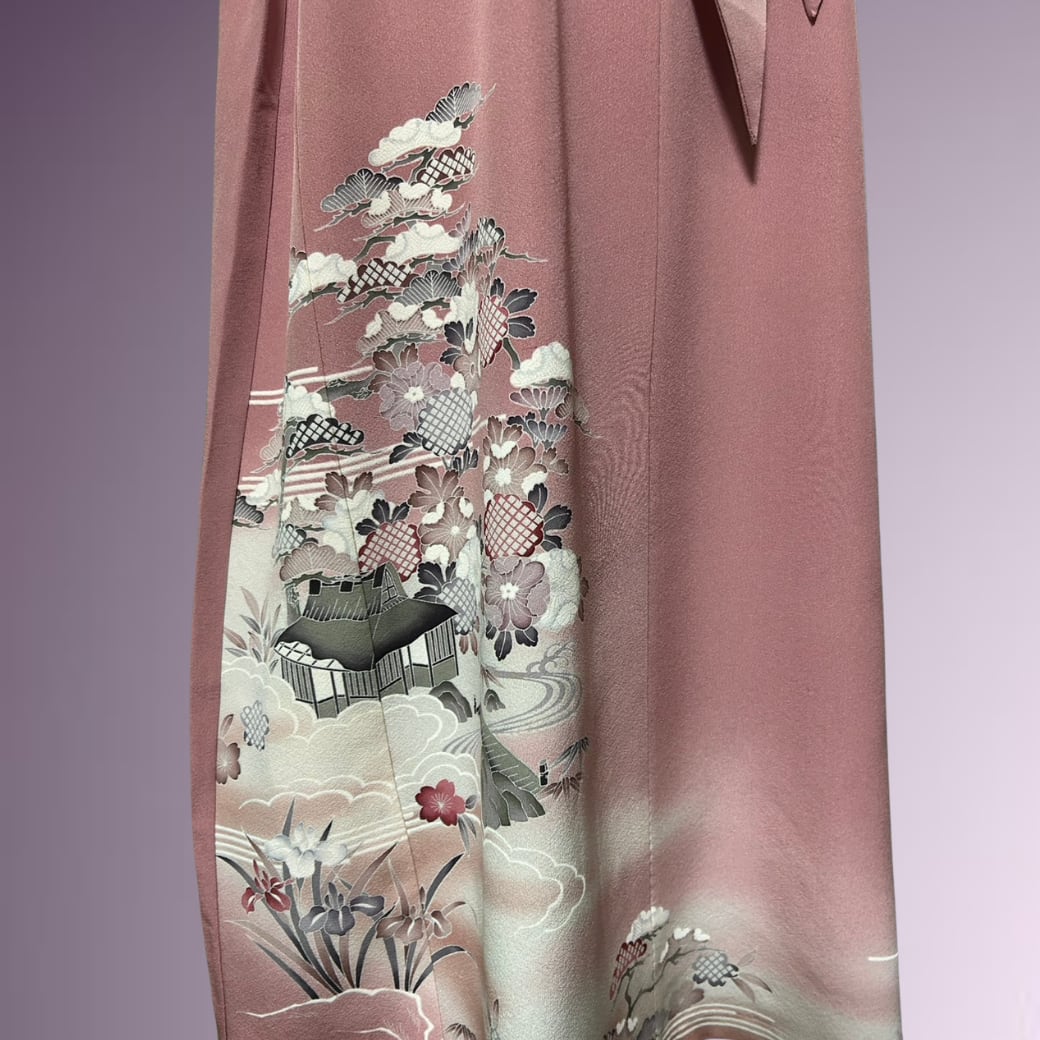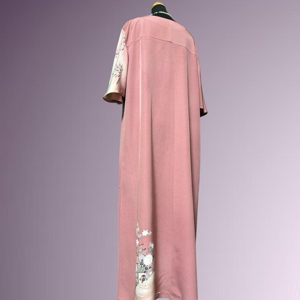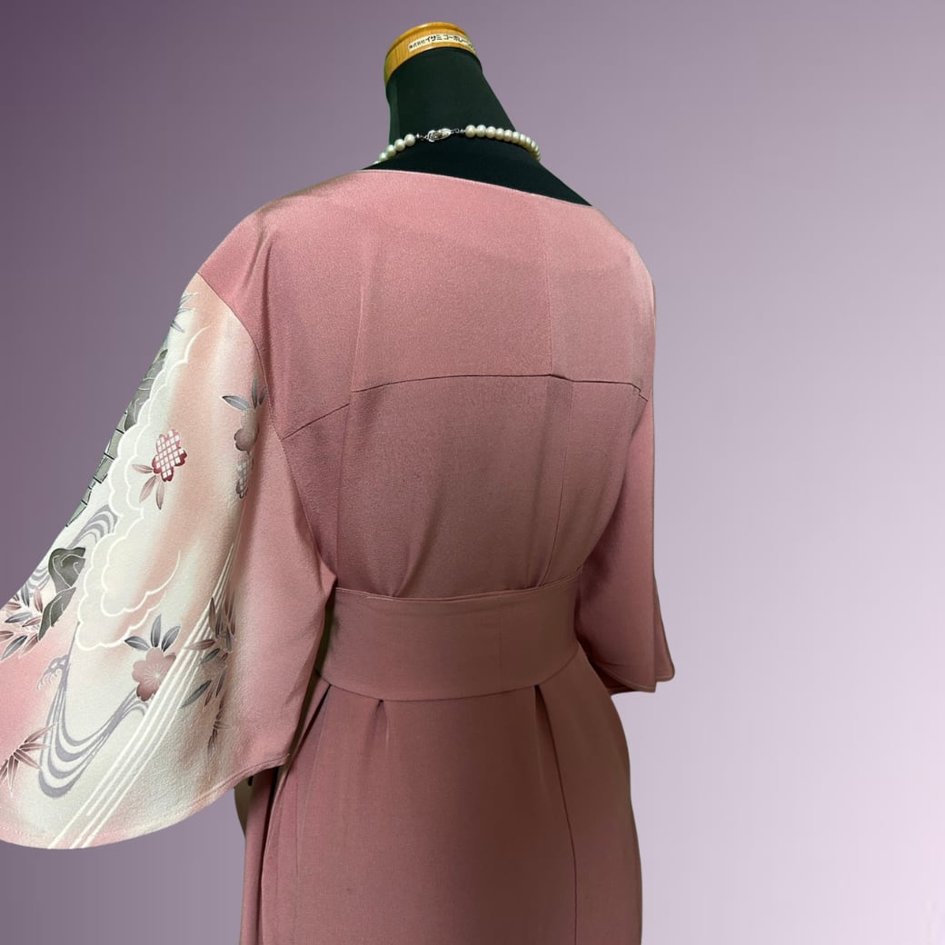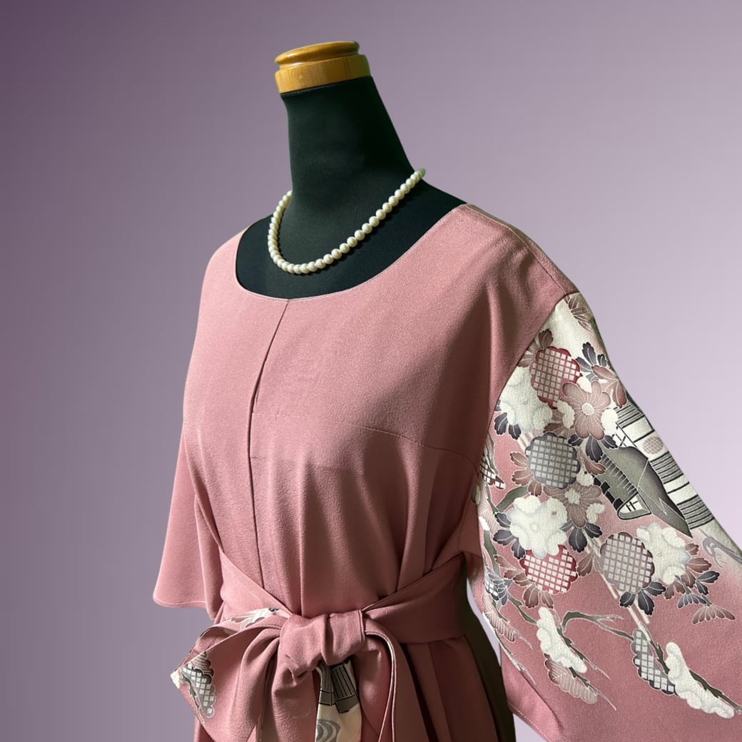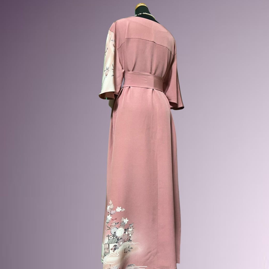 こちらの着物ワンピースは、やわらかな桜色の訪問着をもとに仕立てた一着です。