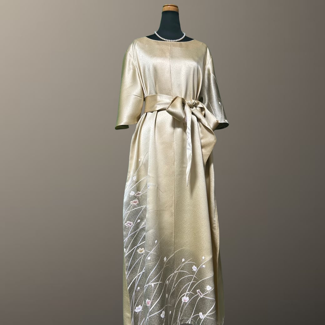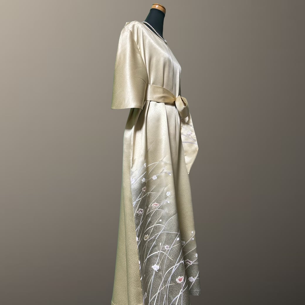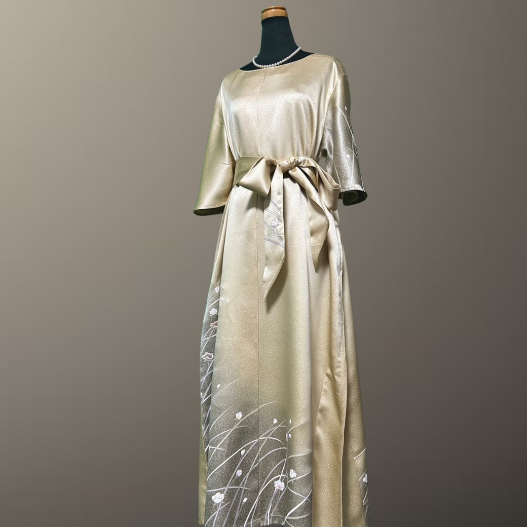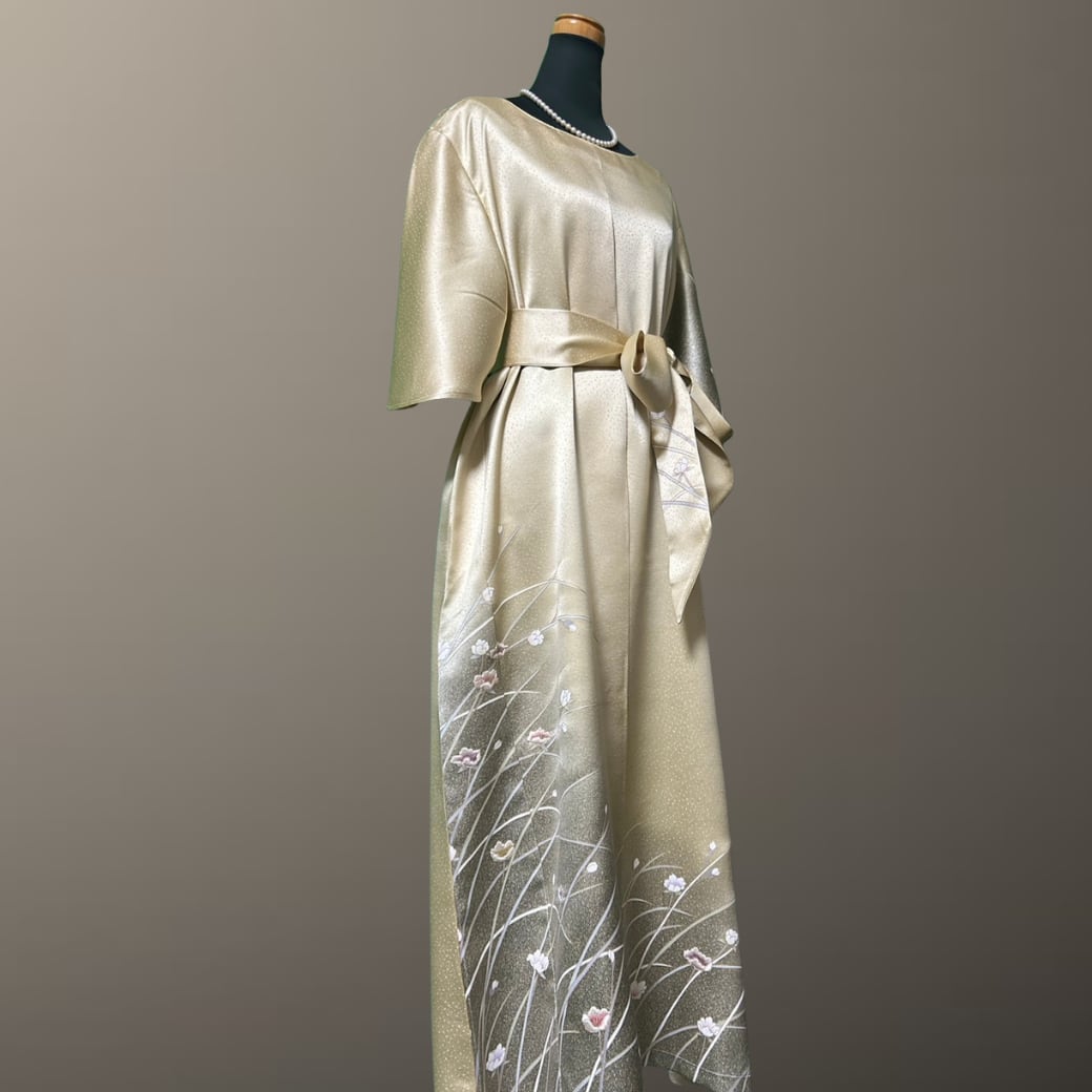 こちらの着物ワンピースは、やわらかな金霞のような地色の訪問着をもとに仕立てた一着です。