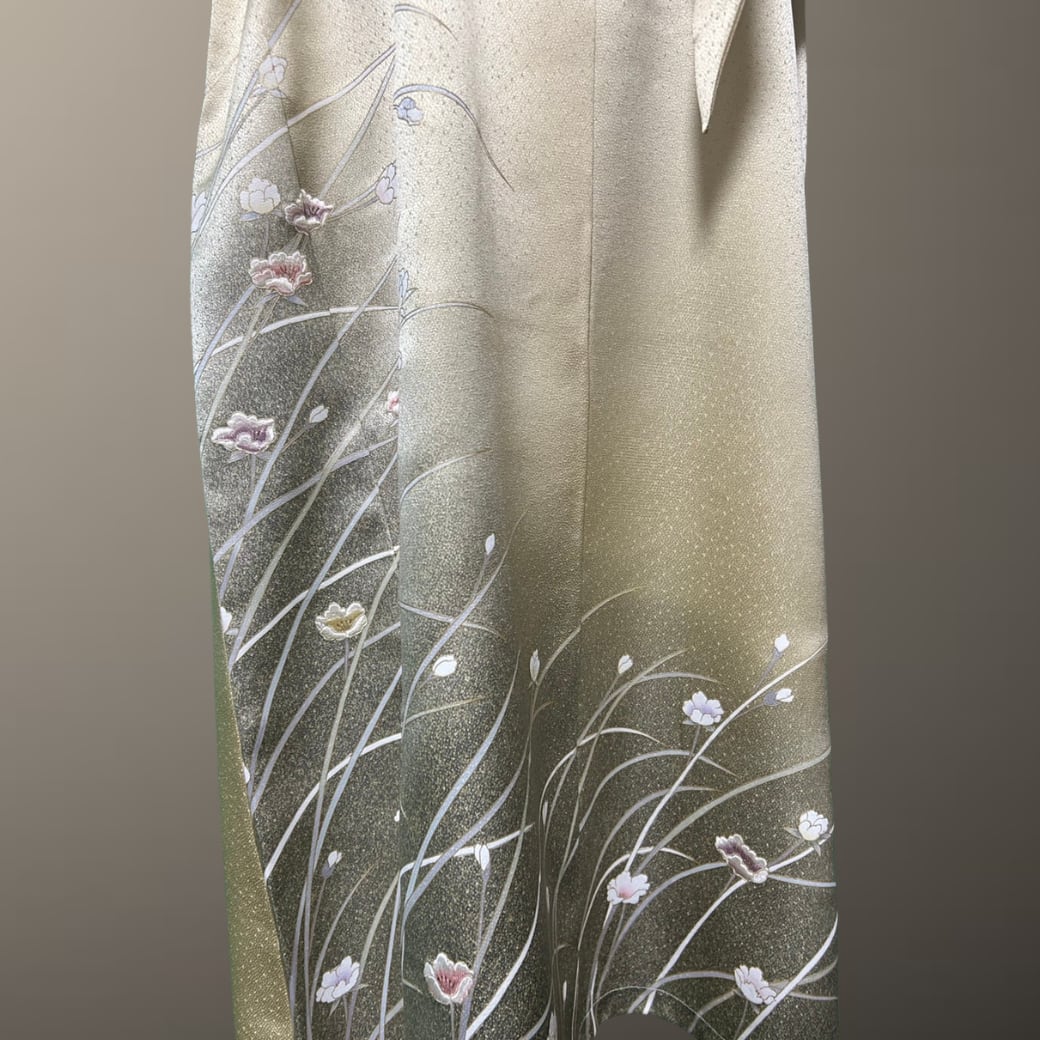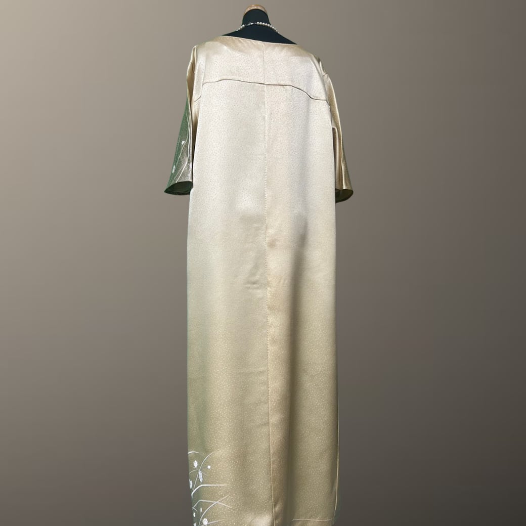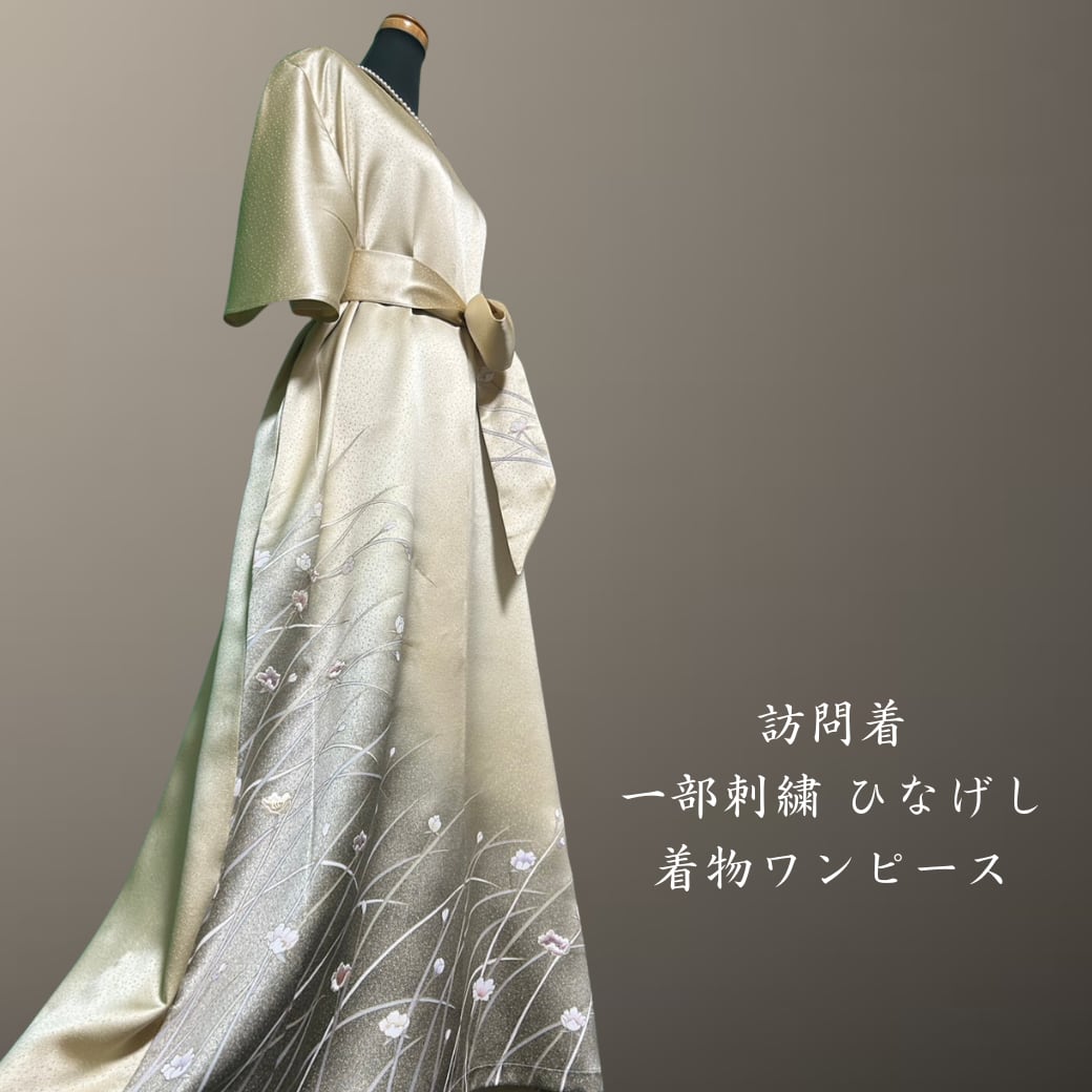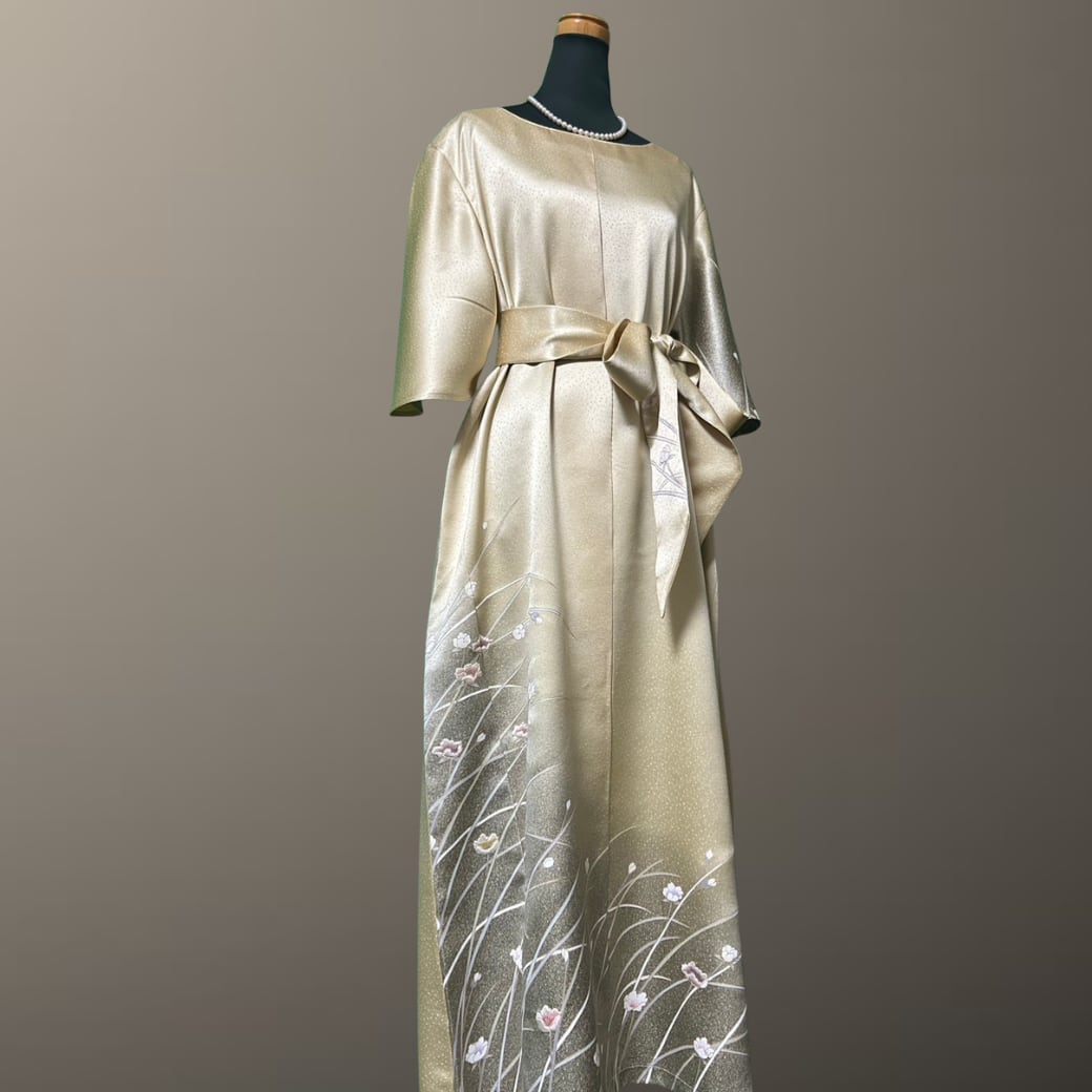 こちらの着物ワンピースは、やわらかな金霞のような地色の訪問着をもとに仕立てた一着です。